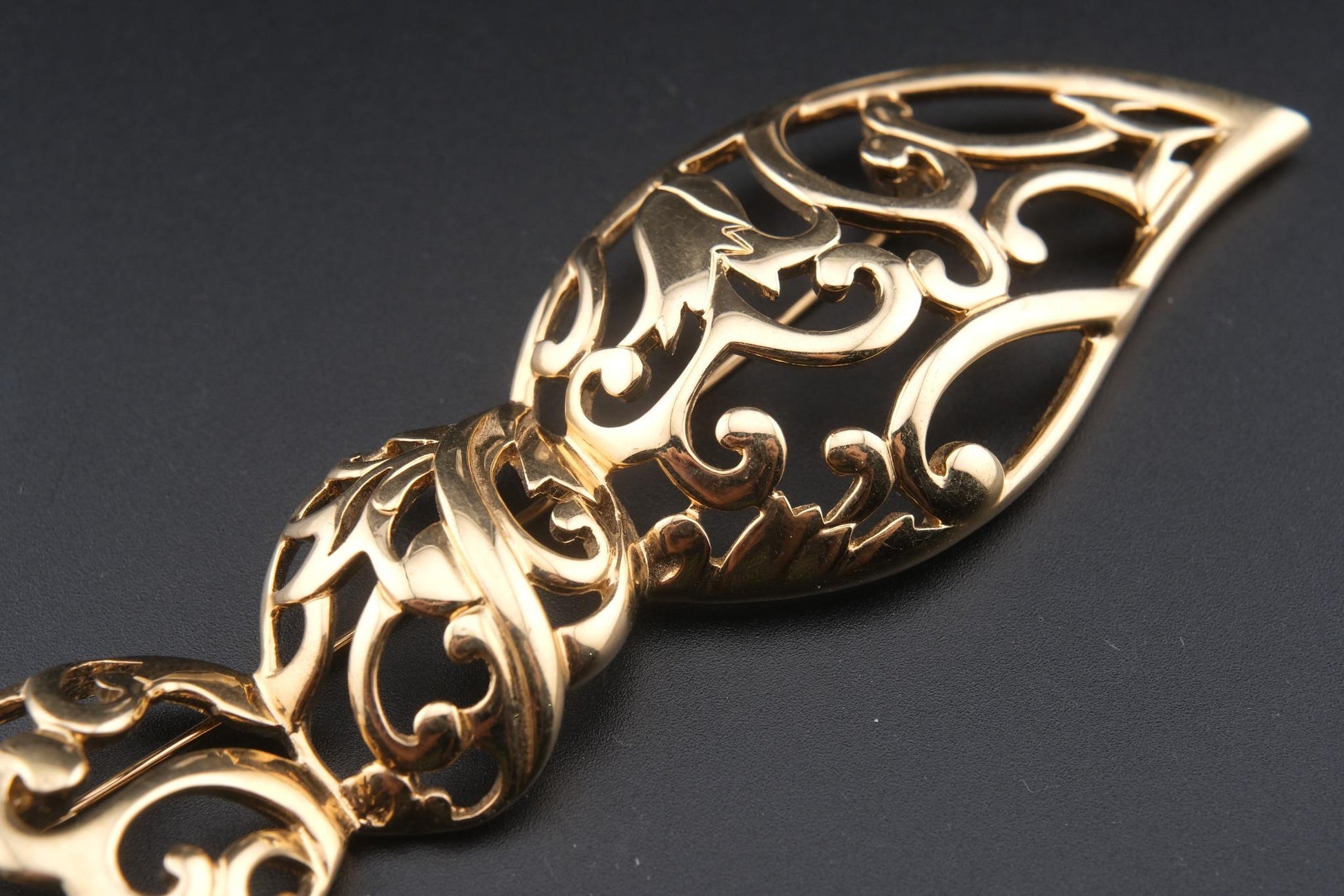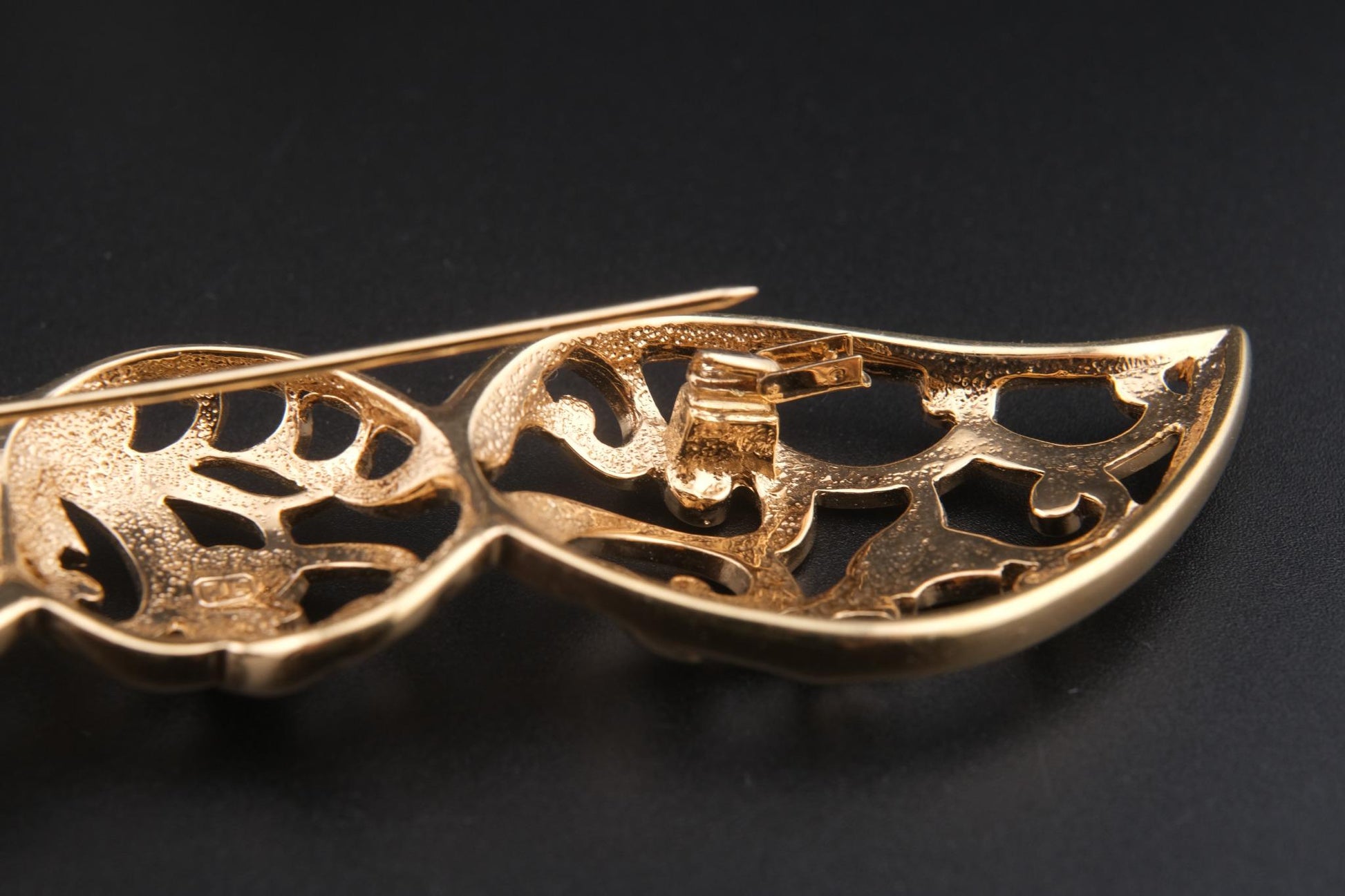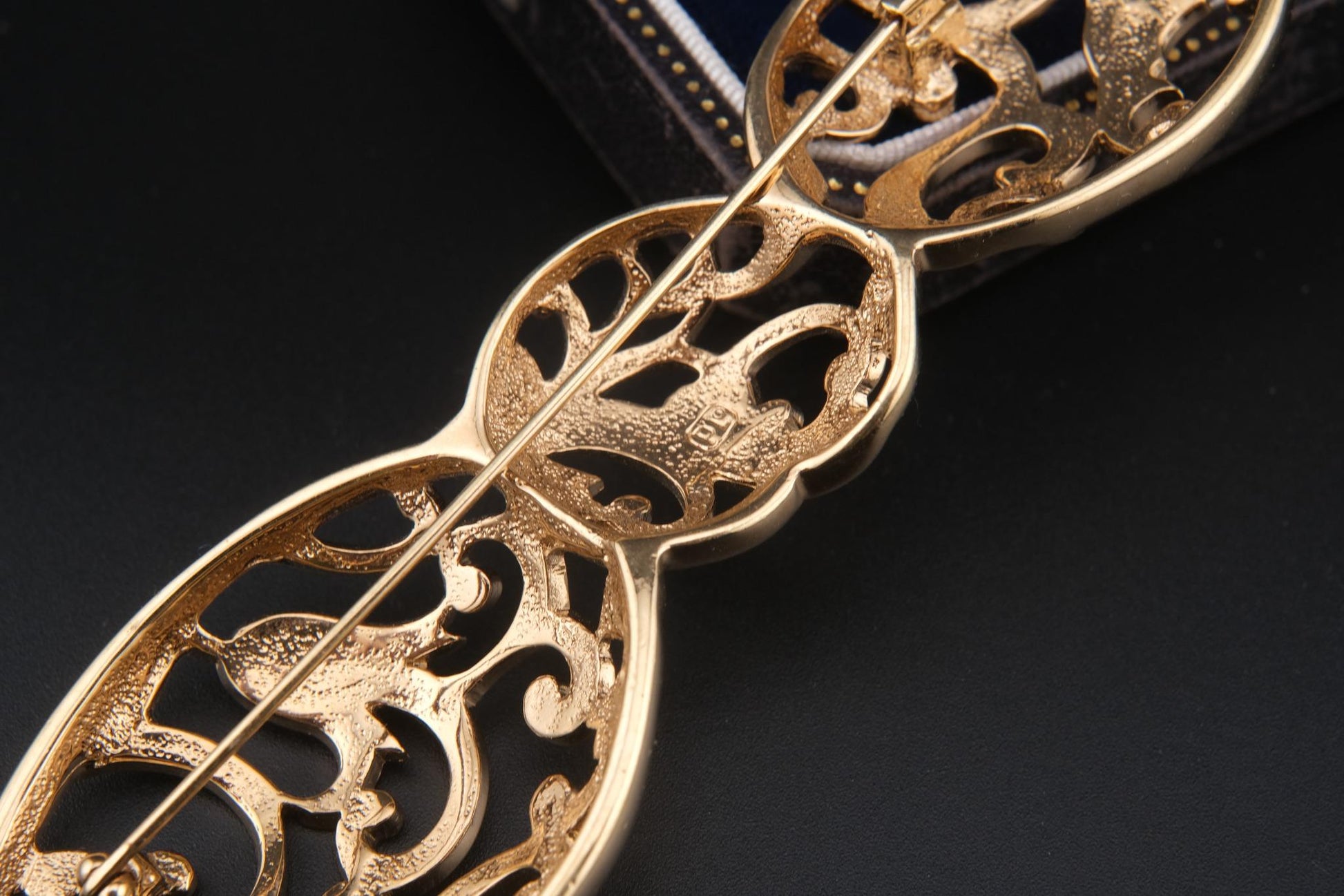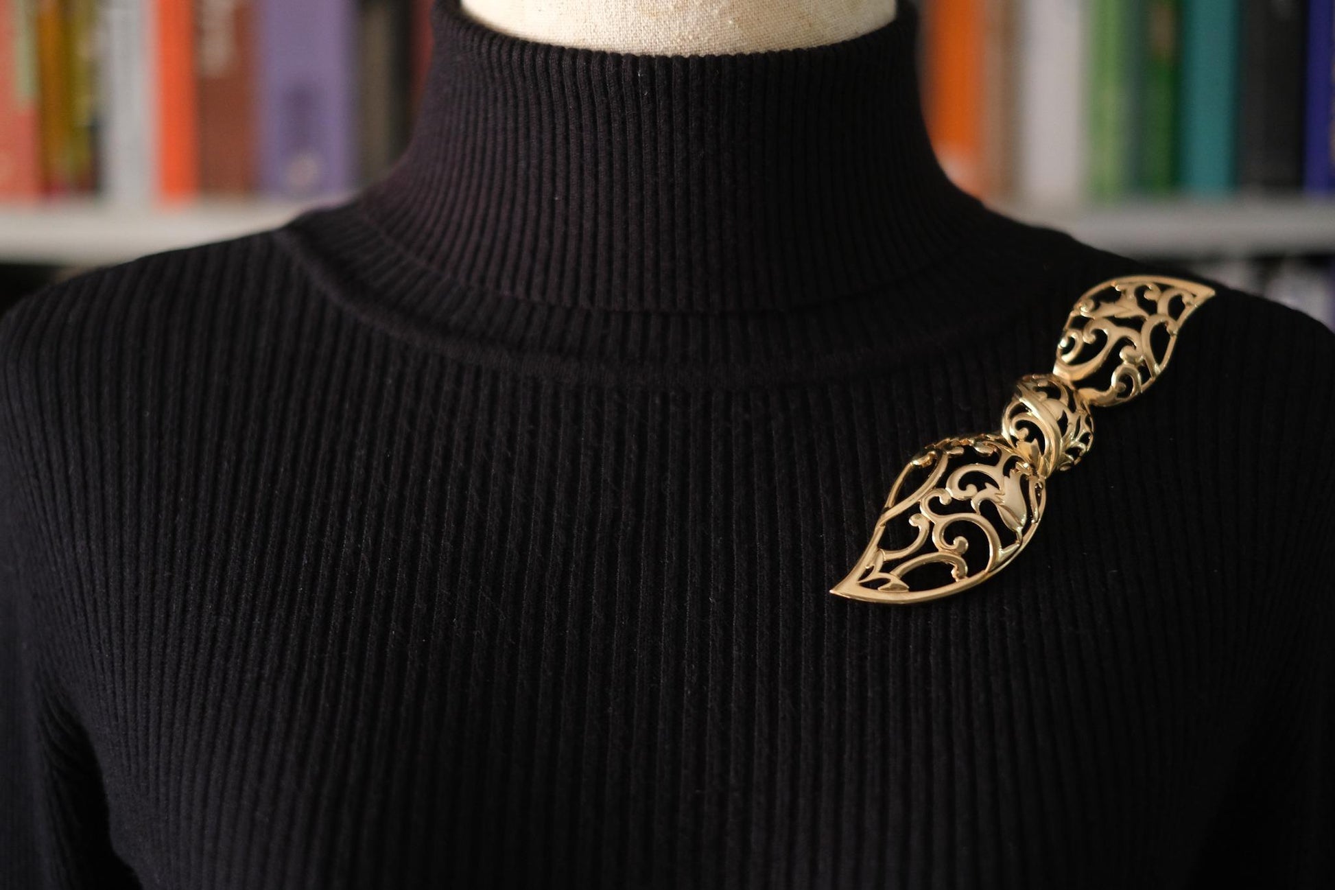 This striking vintage Pierre Lang oversized bow brooch is a true statement piece of Austrian design. Crafted in hard gold-plated openwork metal, the brooch spans an impressive 13.3 cm in width with graceful lines and refined detailing. Its clasp is secured with a safety hood for confident wear, and the reverse is signed PL with the copyright mark.