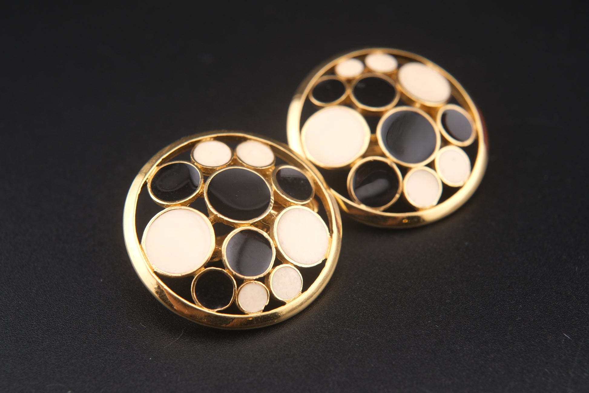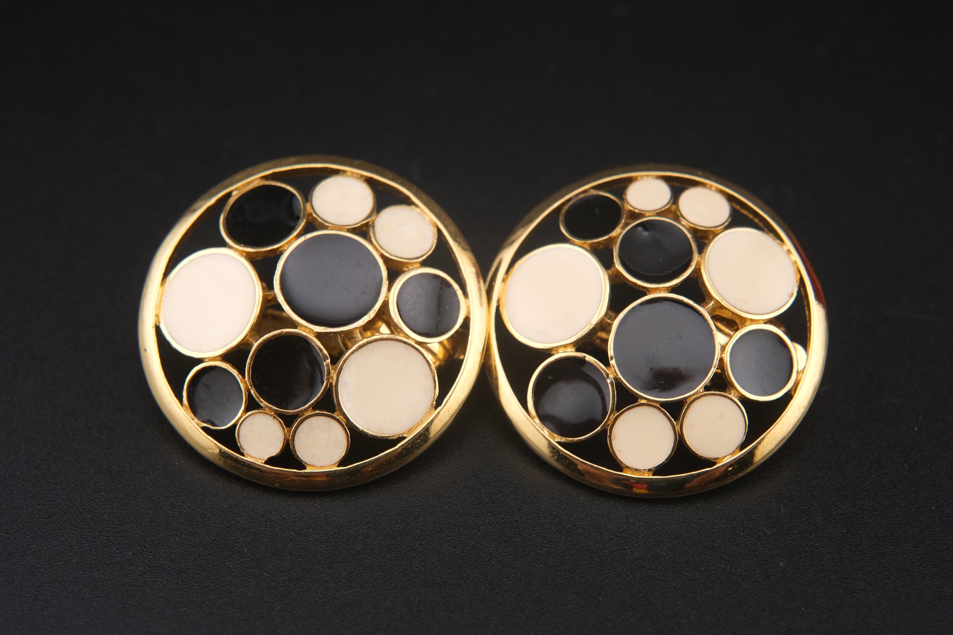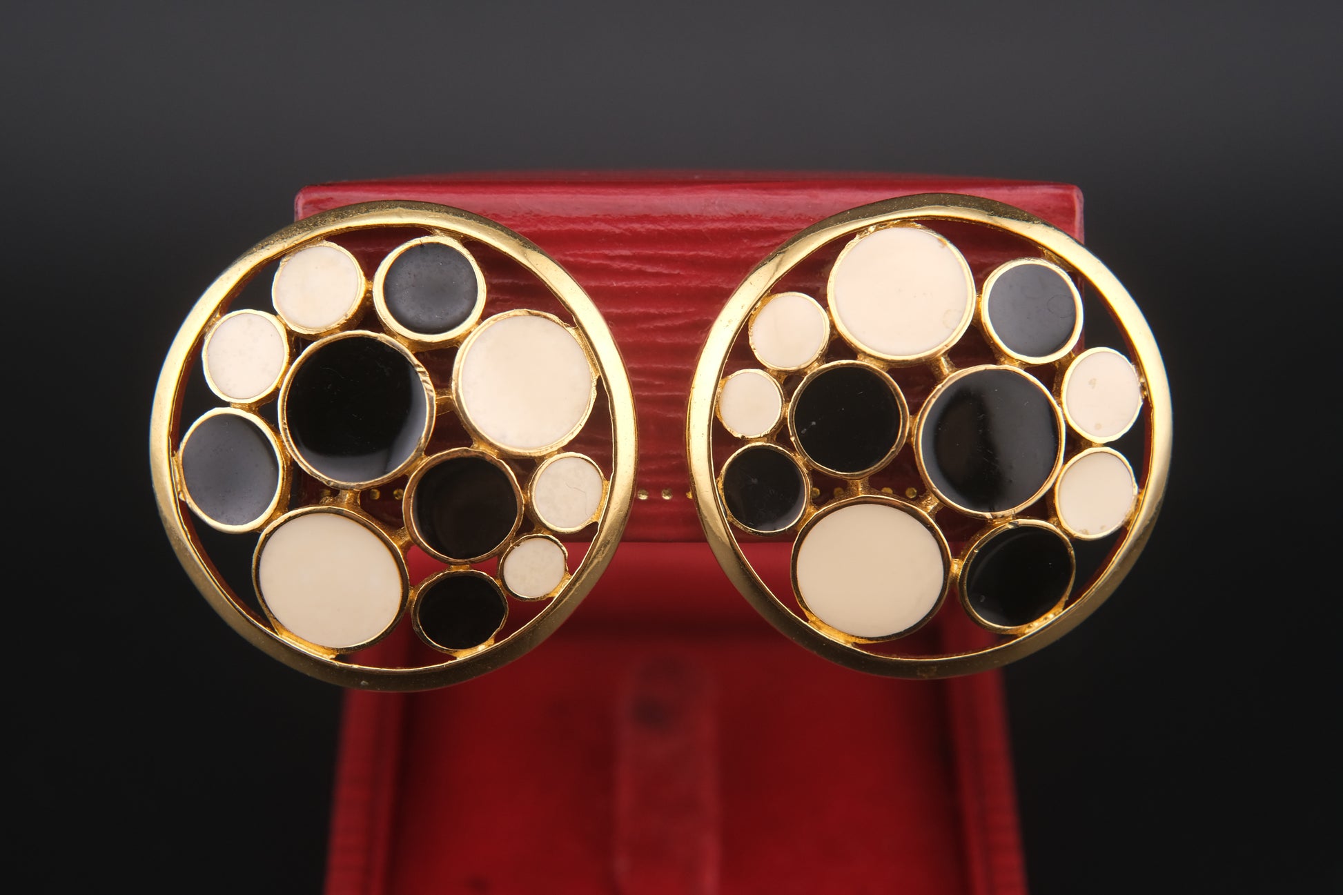 Rare 1967 Crown Trifari Clip-On Earrings – Black & Ivory Enamel Circles in Gold-Tone, Confetti Collection