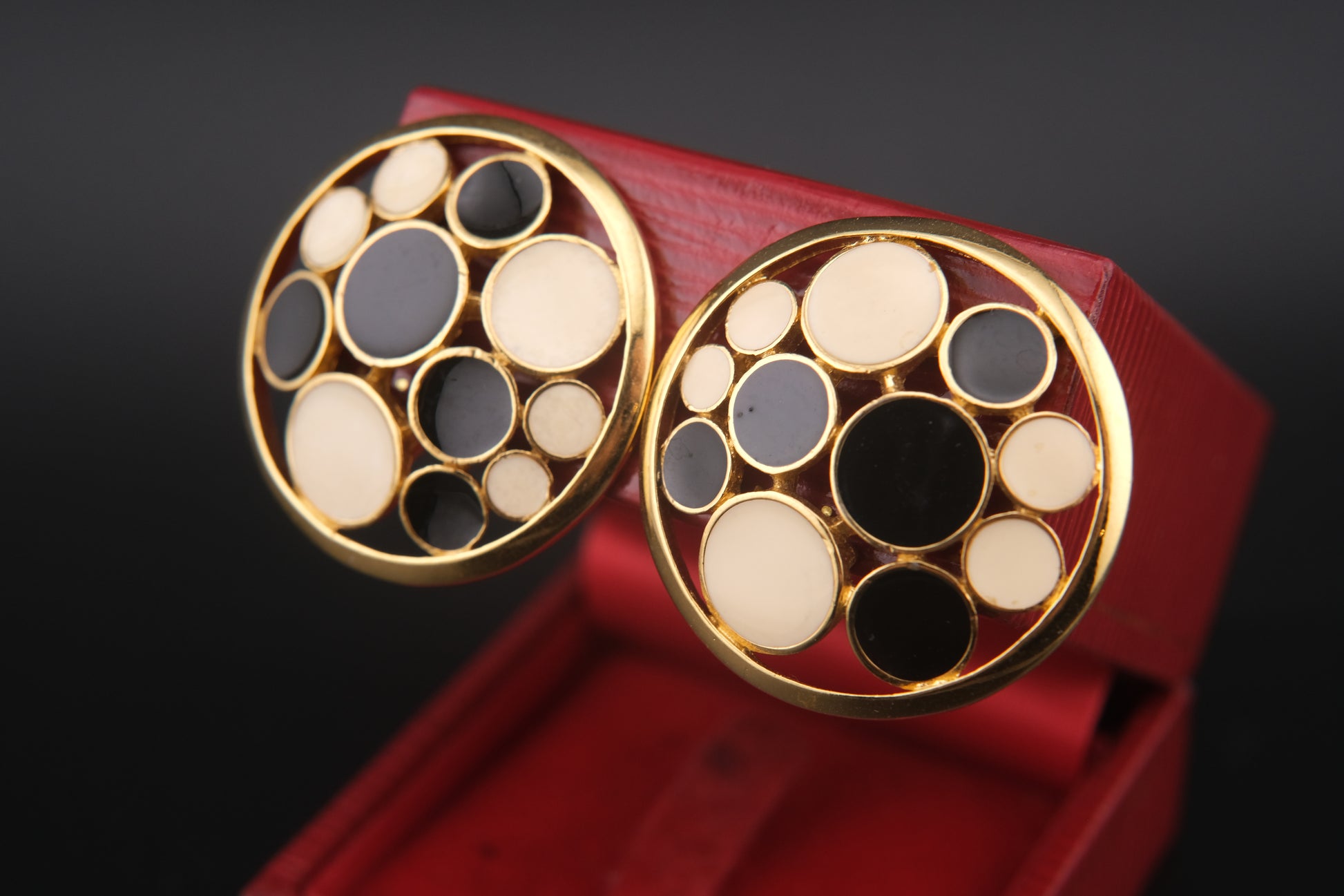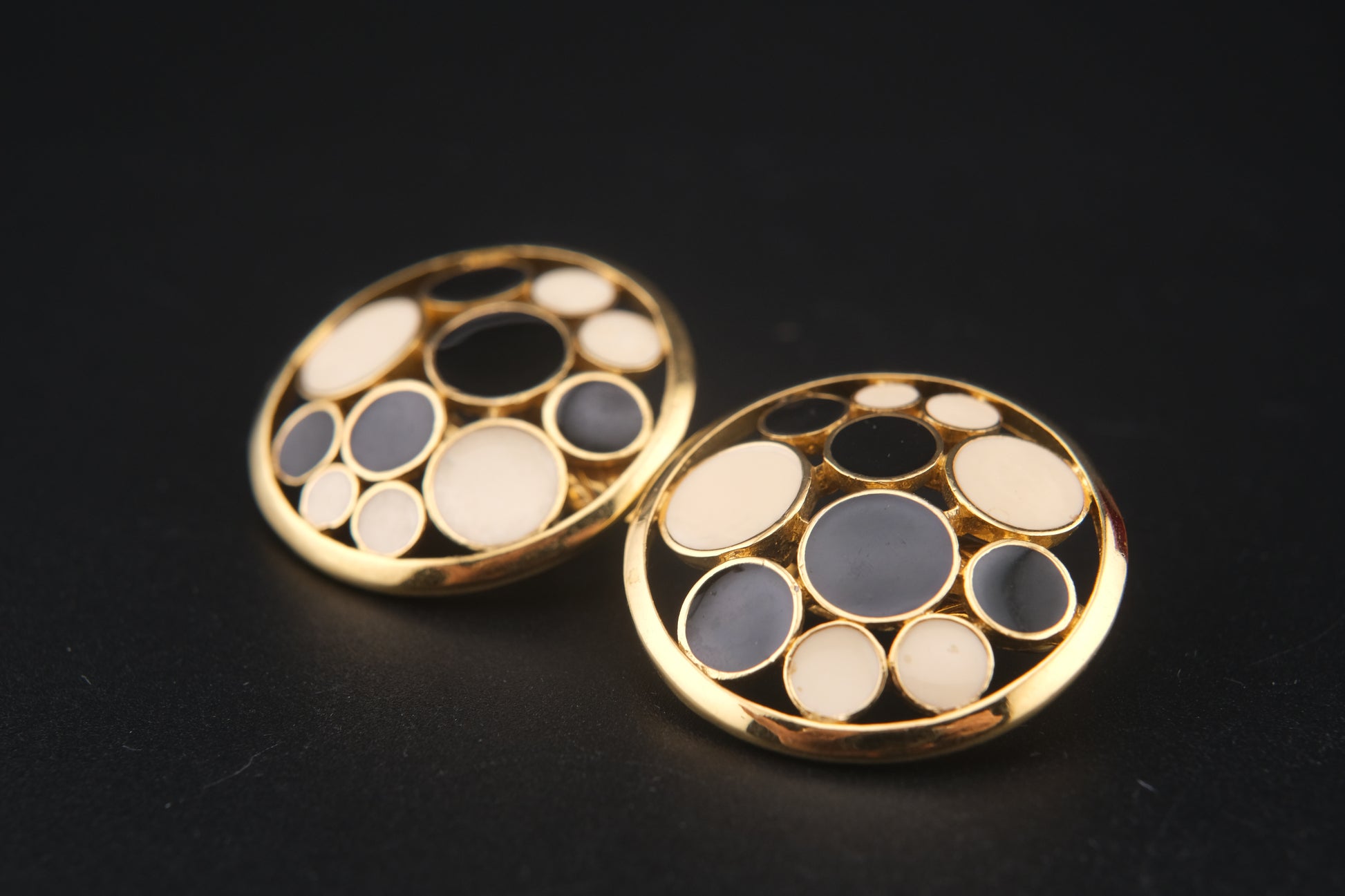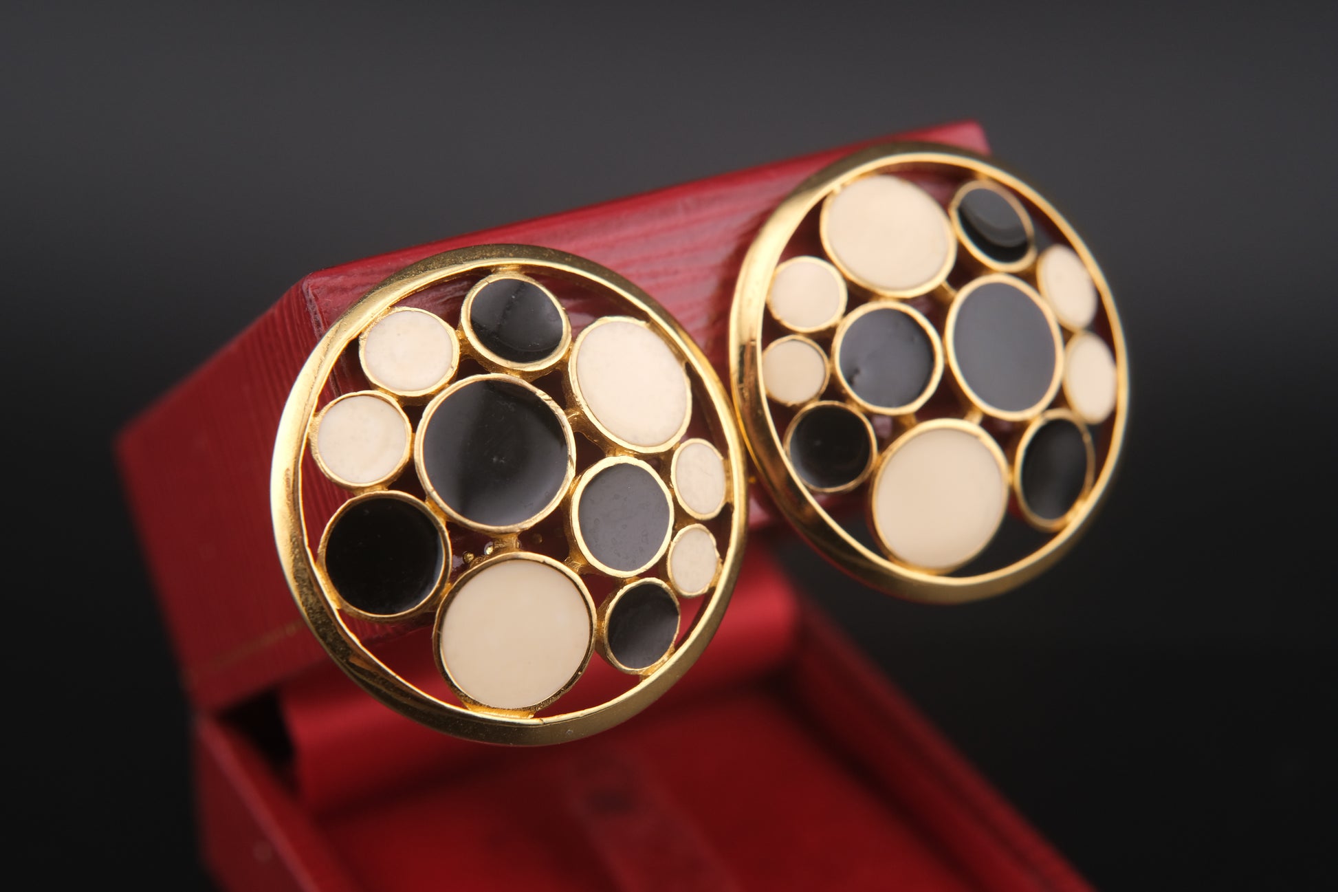 Rare 1967 Crown Trifari Clip-On Earrings – Black & Ivory Enamel Circles in Gold-Tone, Confetti Collection