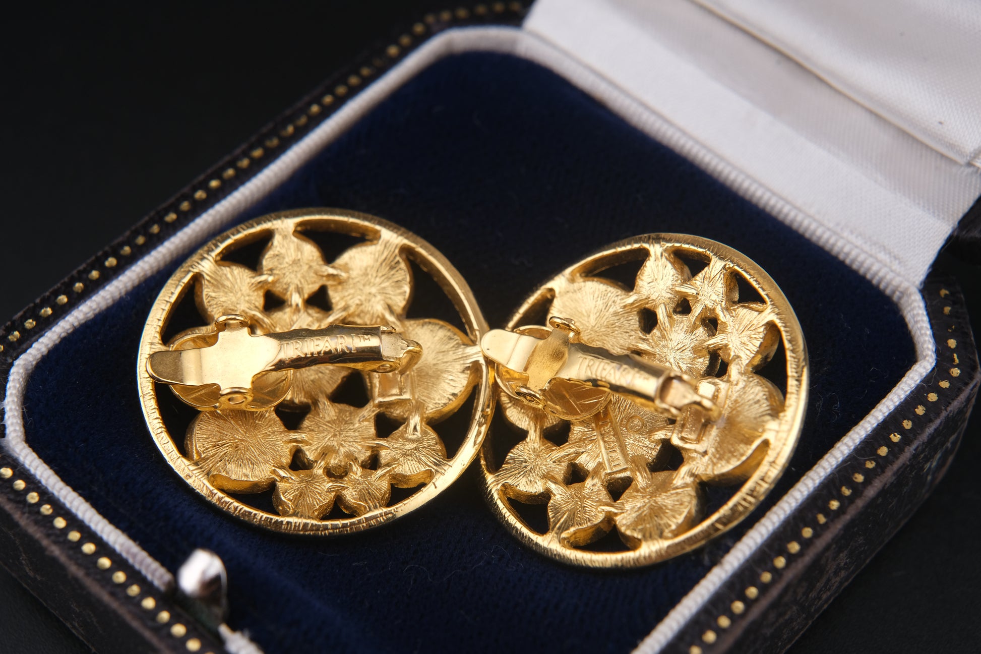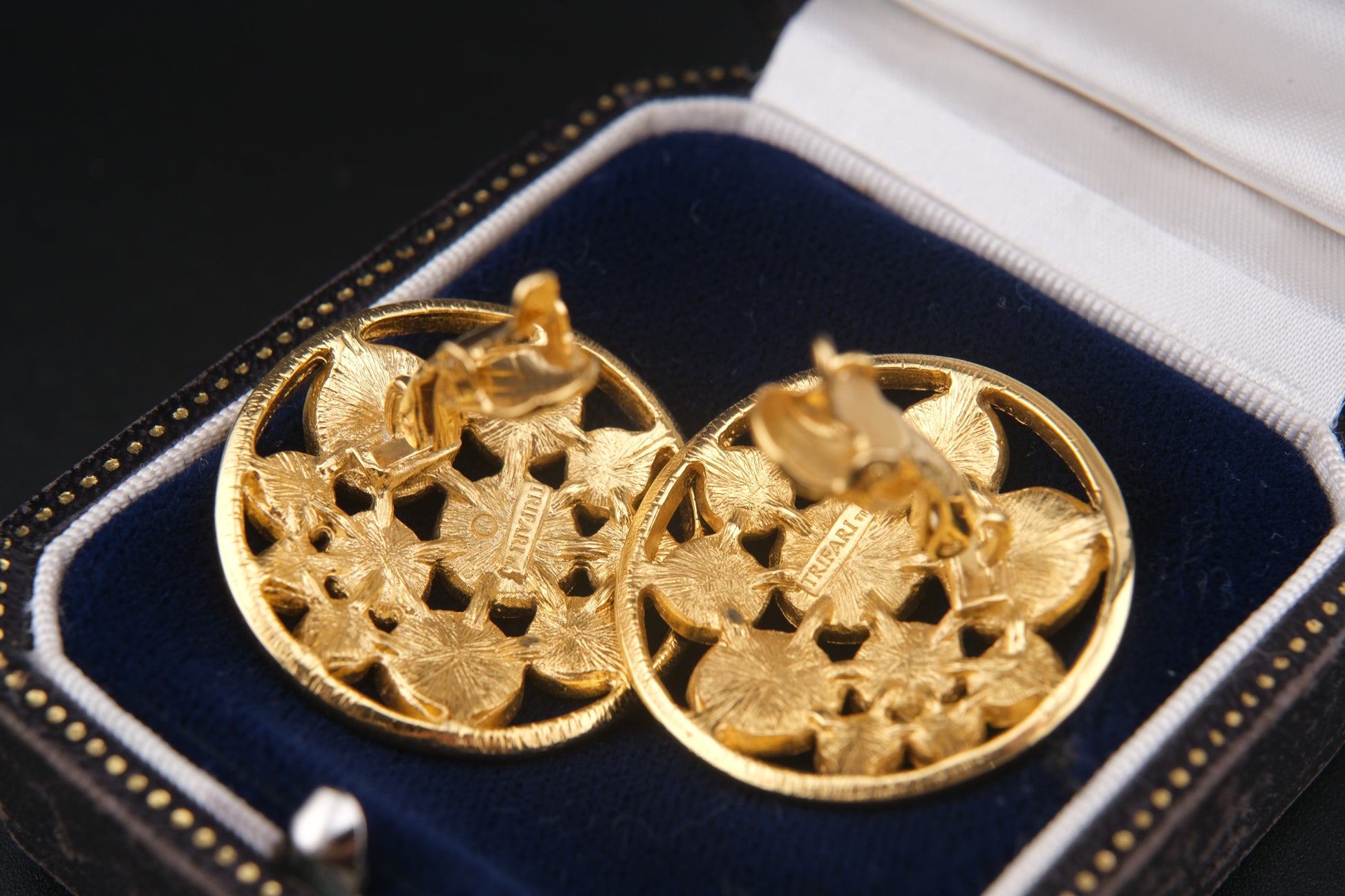 The backs feature intricate floral openwork and secure clip-on mechanisms, both stamped with the TRIFARI™ hallmark. A true treasure for collectors and lovers of vintage statement jewelry.