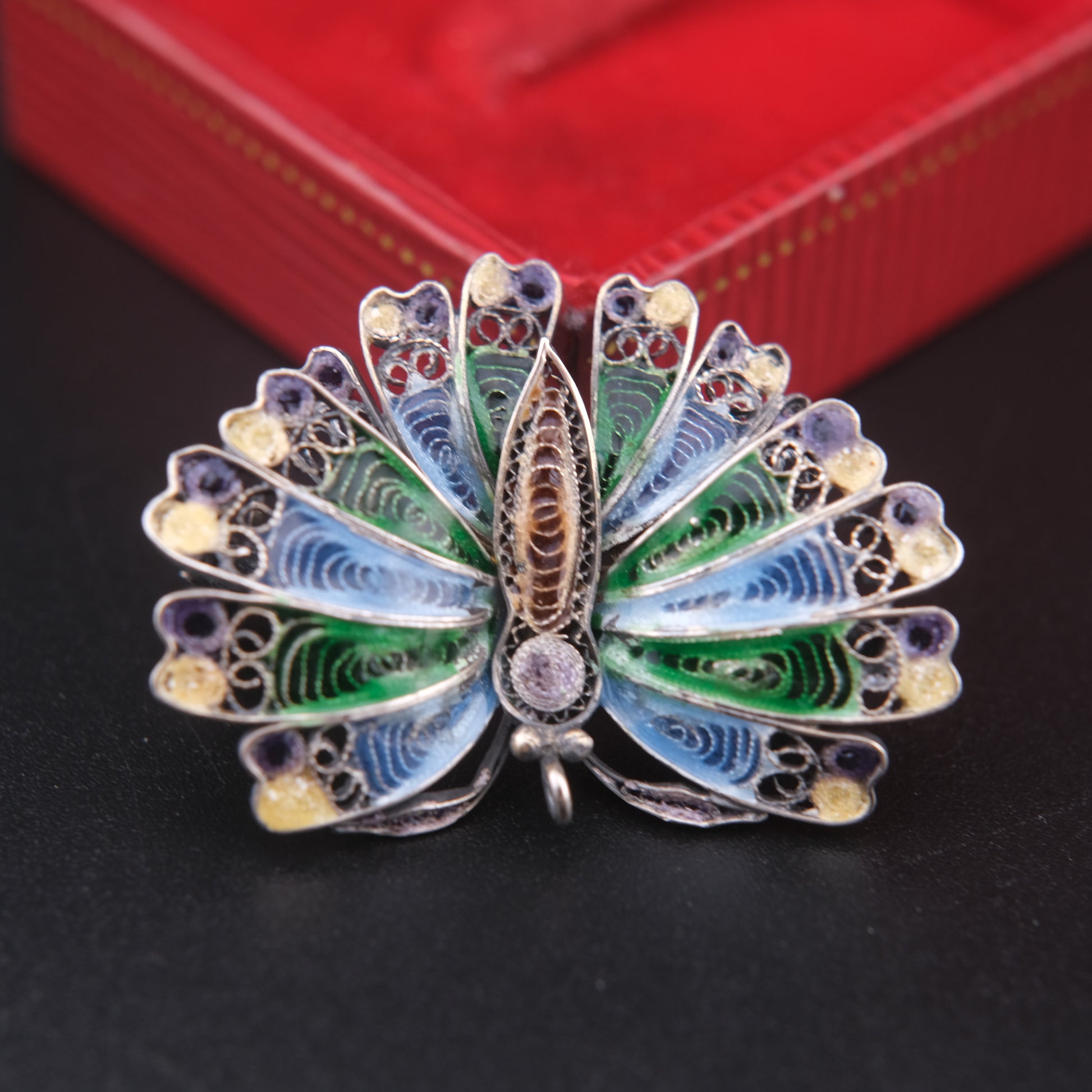 Add a touch of delicate artistry to your collection with this vintage butterfly brooch, beautifully crafted in fine 800 silver with intricate filigree wings. Each wing is hand-enameled in luminous shades of blue, green, yellow, and violet, showcasing exquisite craftsmanship typical of mid-century European enamel work.