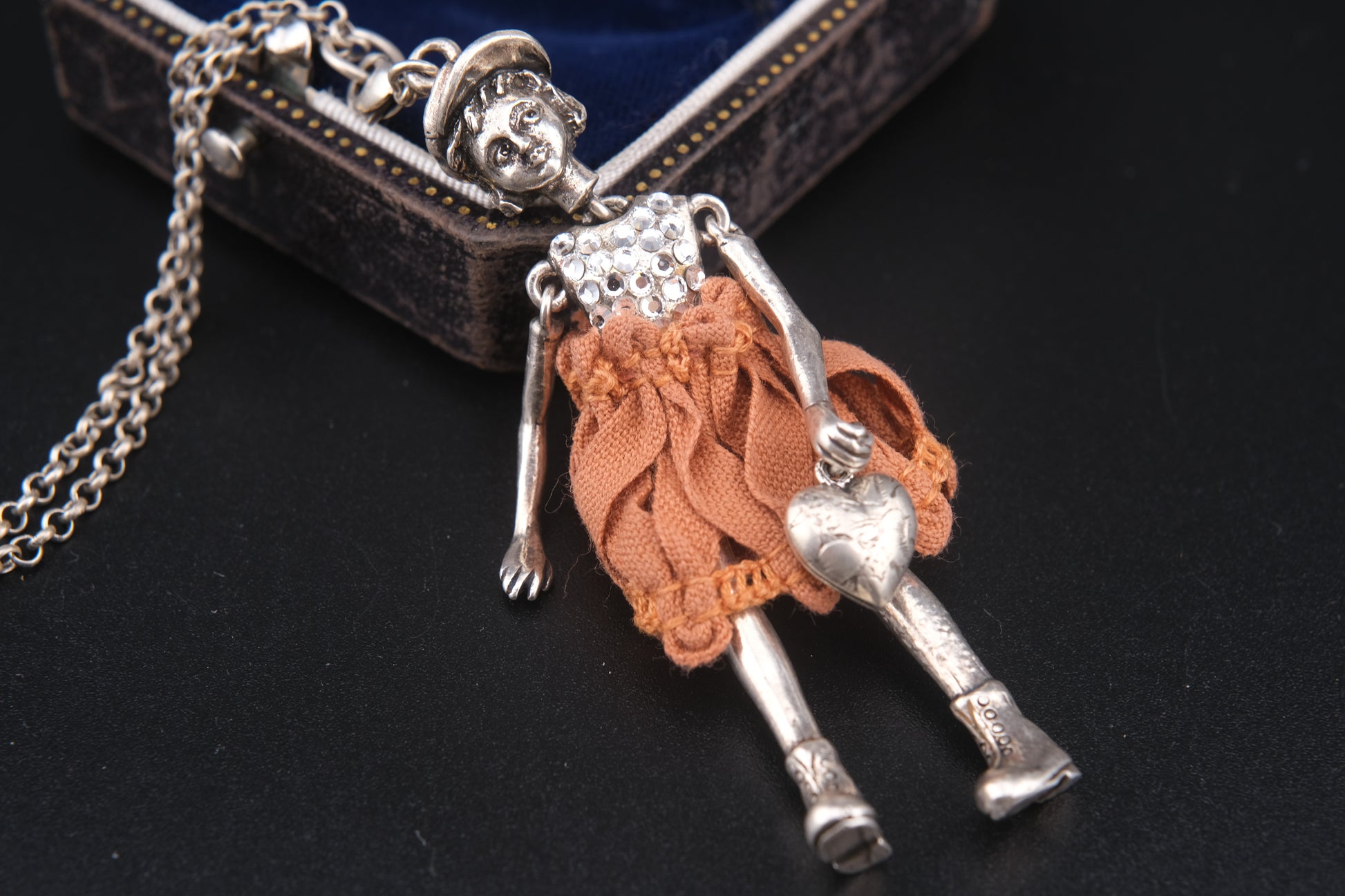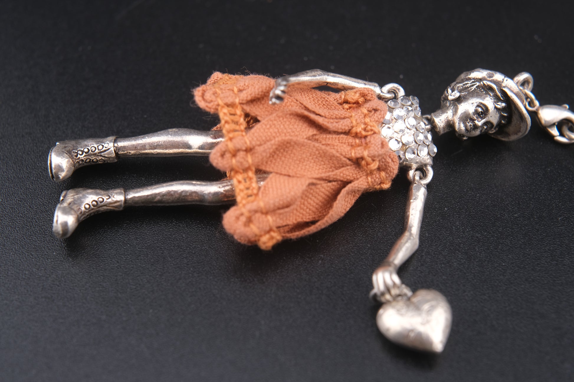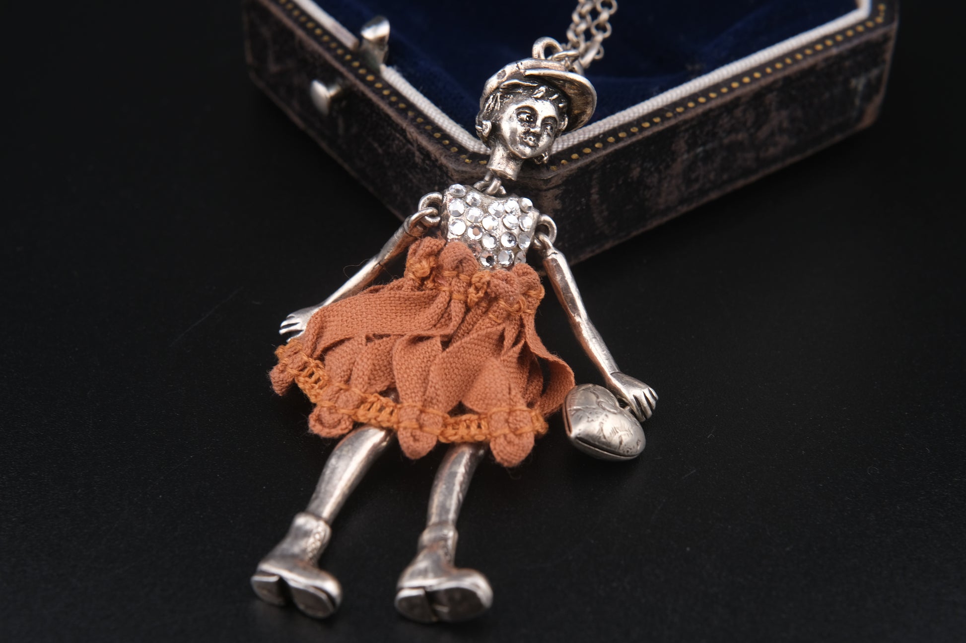 Design: Articulated girl figure with cap, rhinestone bodice, orange fabric dress, and engraved heart charm