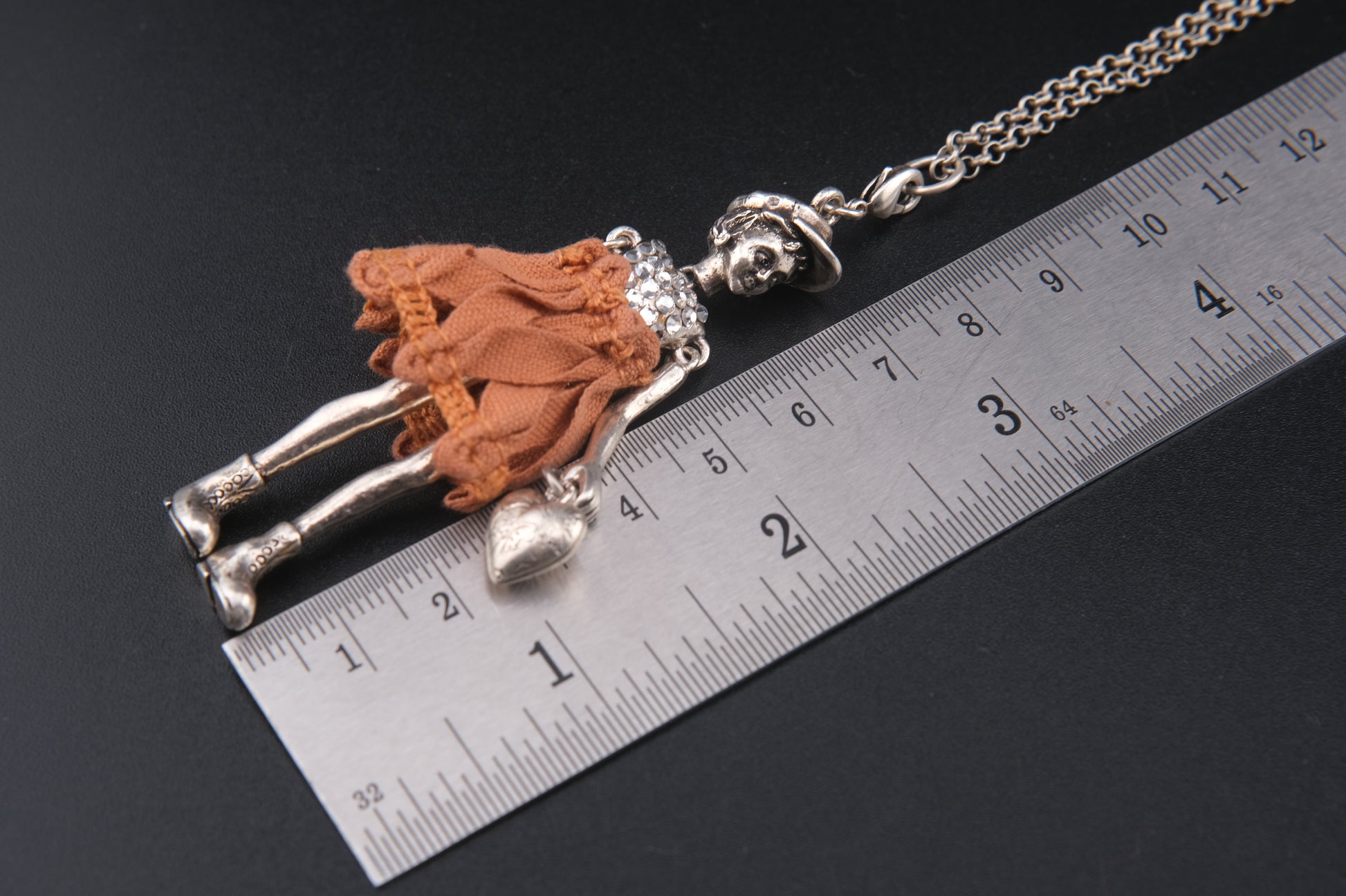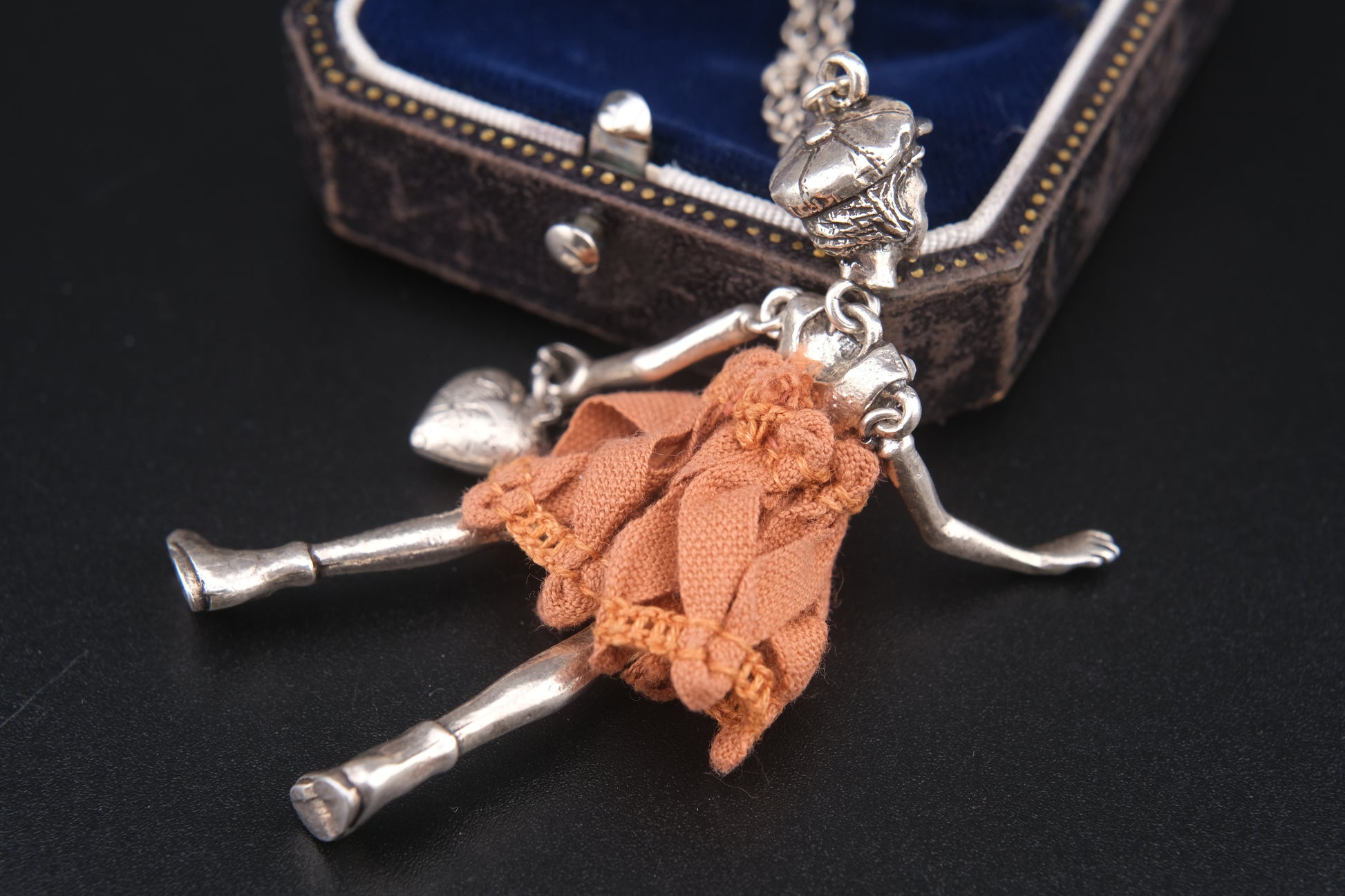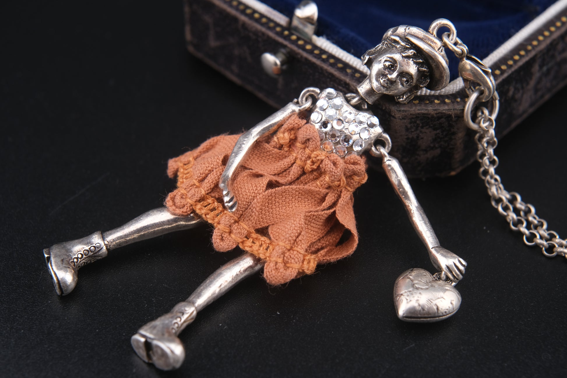 Design: Articulated girl figure with cap, rhinestone bodice, orange fabric dress, and engraved heart charm
