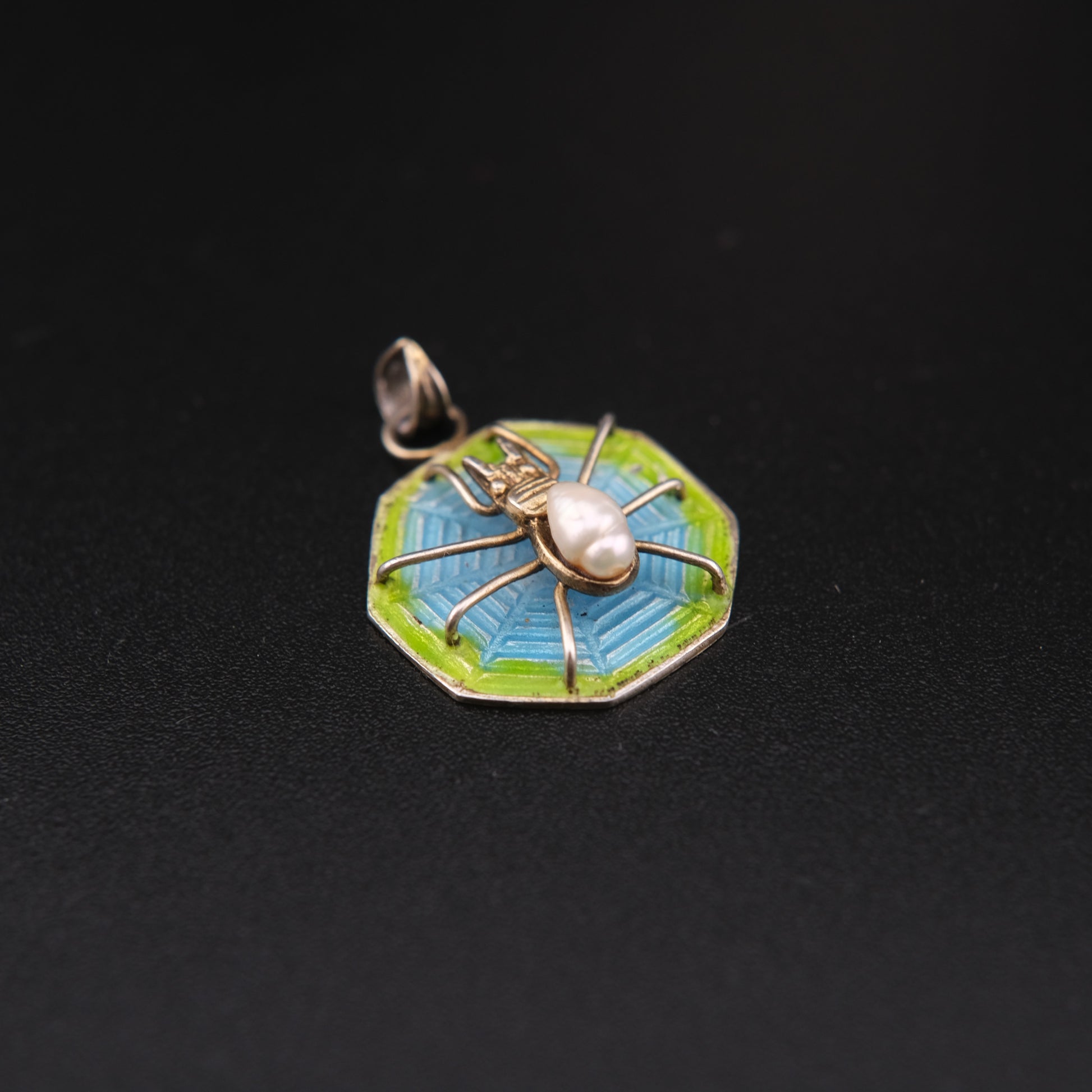Add a touch of whimsy and craftsmanship to your collection with this vintage spider pendant, beautifully handcrafted in silver. The design features a lustrous cultured pearl body set on a detailed green and sky-blue guilloché enamel web background, forming an octagonal frame. The intricate spider motif exudes vintage charm and symbolism — representing creativity, patience, and protection.