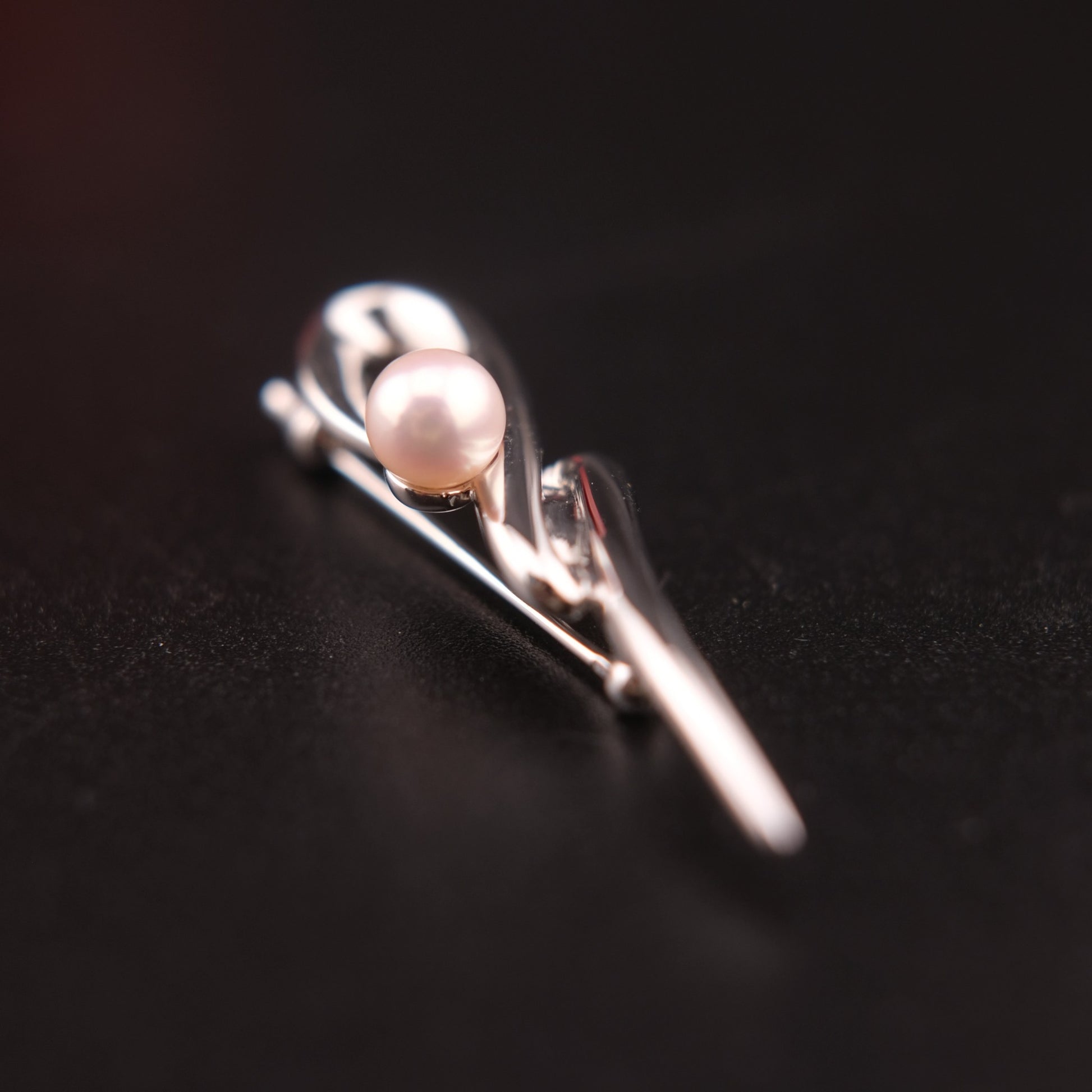 Elevate your look with this elegant vintage Tasaki brooch, crafted in gleaming sterling silver and featuring a lustrous Akoya pearl. The sculptural ribbon-like form captures the fluidity of motion, embodying the minimalist sophistication that defines Japanese modernist jewelry design. Perfectly balanced between timeless elegance and artistic expression, this brooch makes a refined statement on a blazer, dress, or scarf.