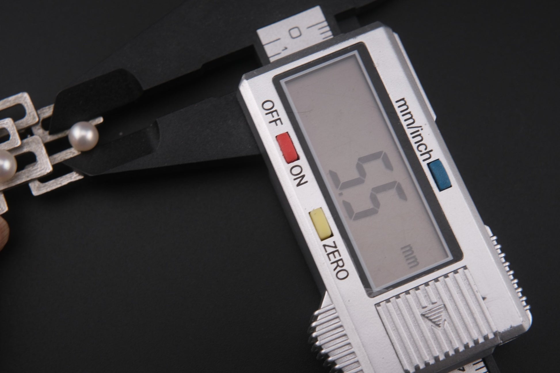 - Design: Rectangular geometric openwork structure with scattered pearls