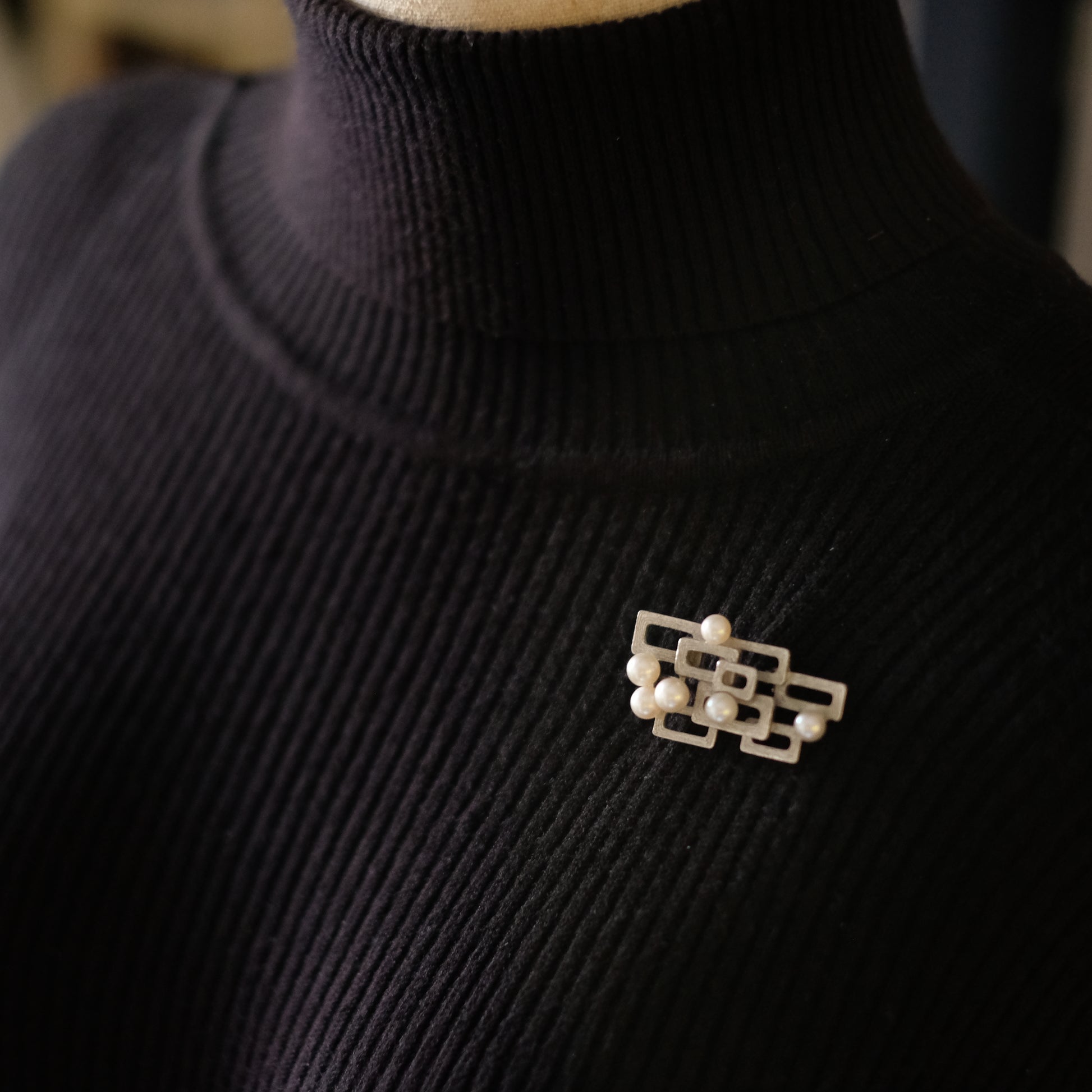 This elegant vintage brooch by Tasaki captures the refined modernism of Japan’s mid-century jewelry era. Crafted from solid sterling silver, the design features a striking composition of interlinked open rectangles accented with lustrous cultured pearls. The contrast between the textured silver and the smooth pearl surfaces gives the piece both architectural depth and timeless femininity.