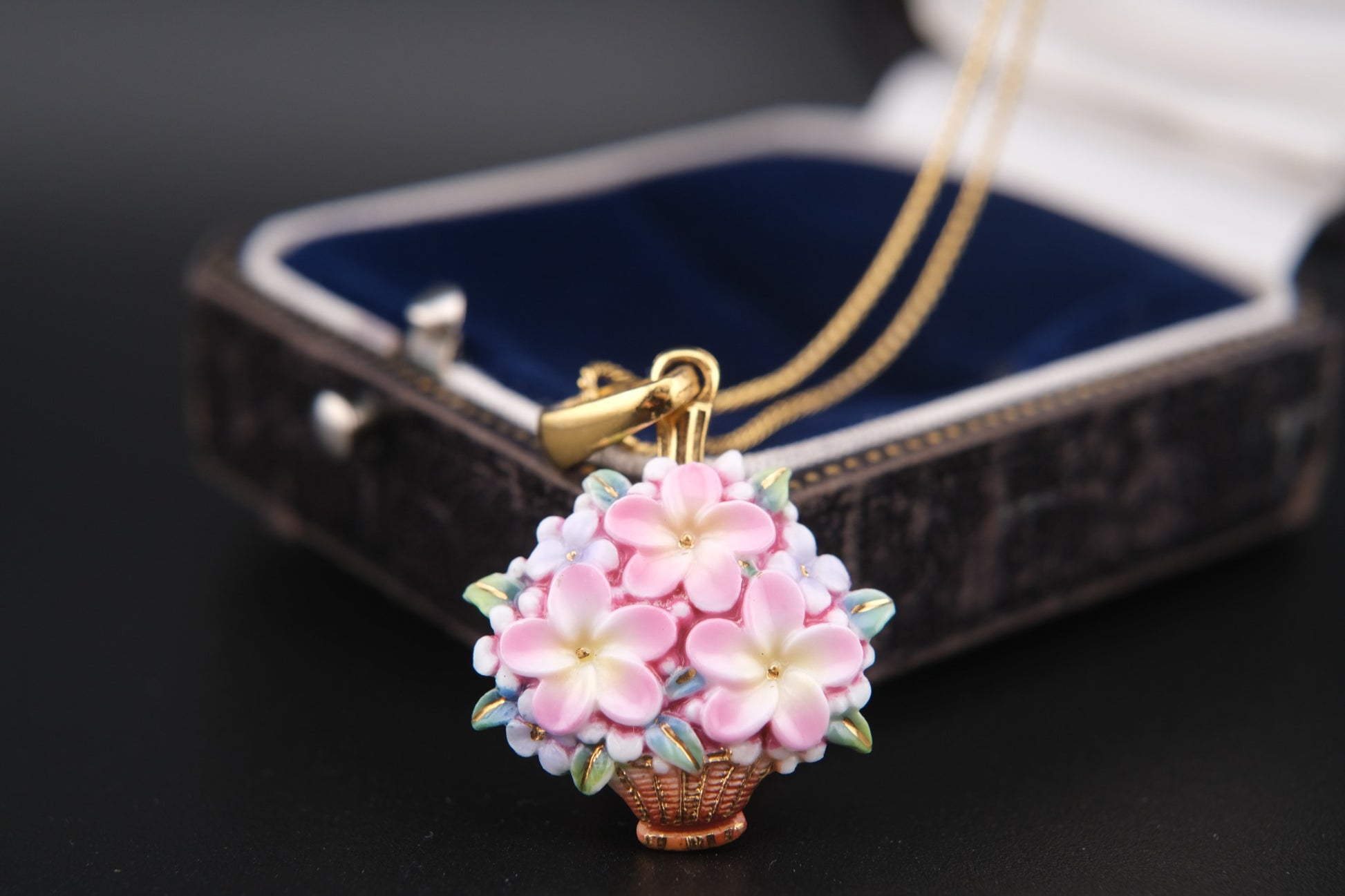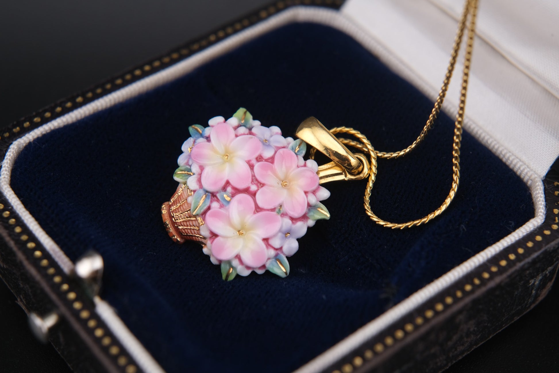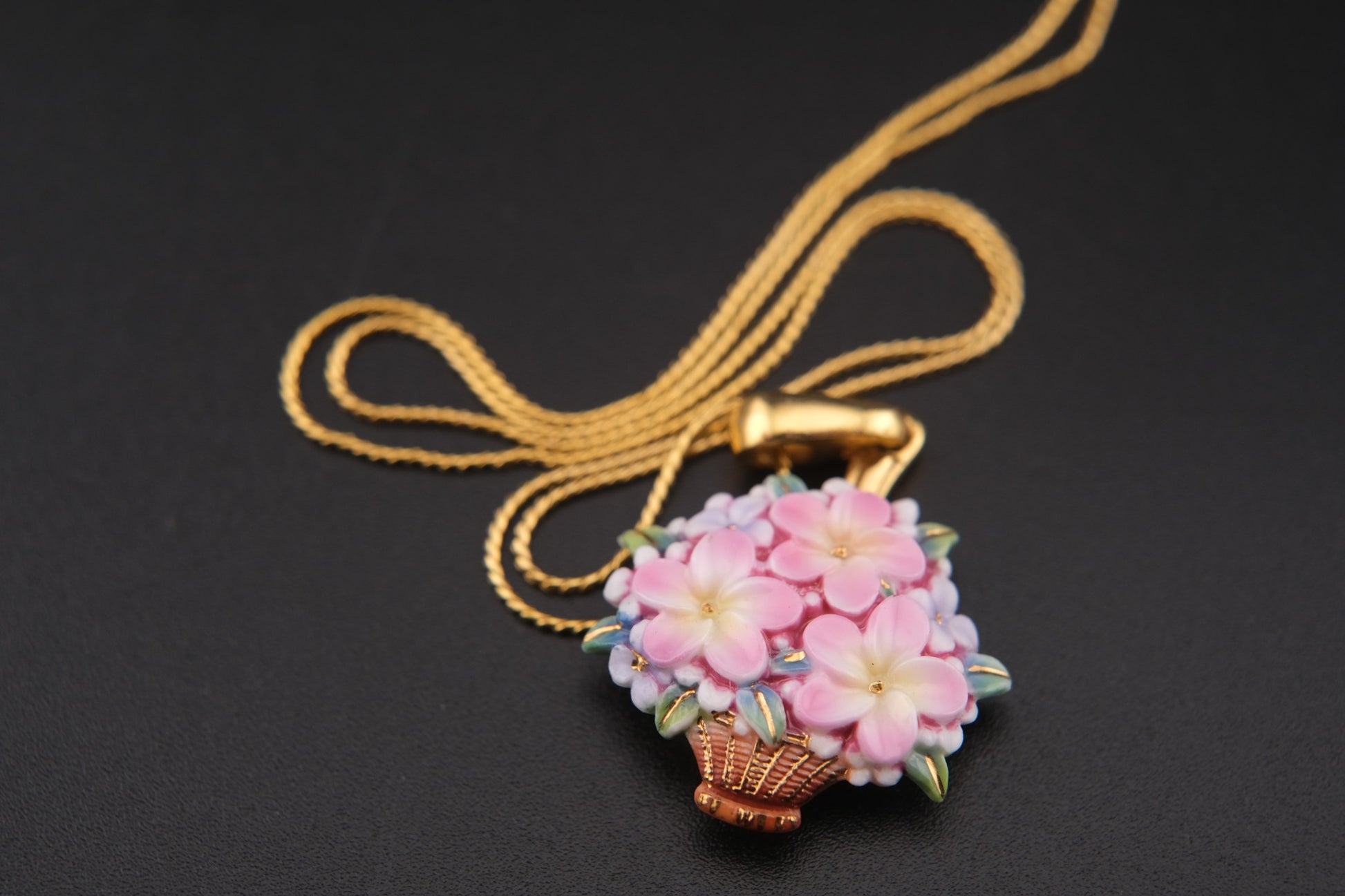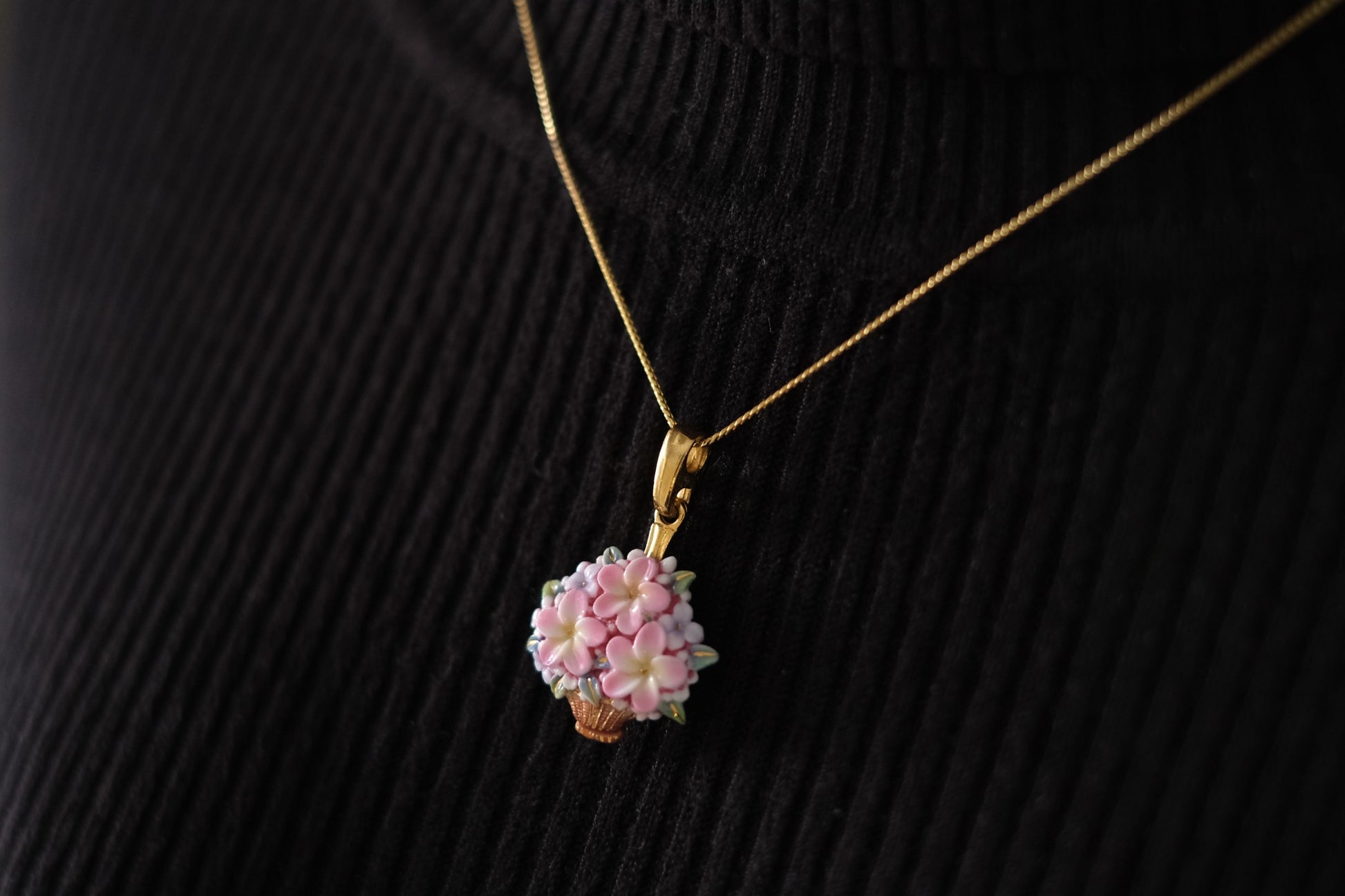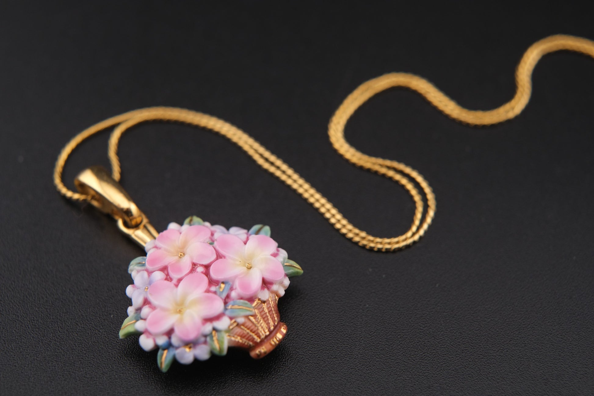 Toshikane Floral Basket Pendant Necklace – Hand-Painted Porcelain Enamel with Gold-Tone Chain
