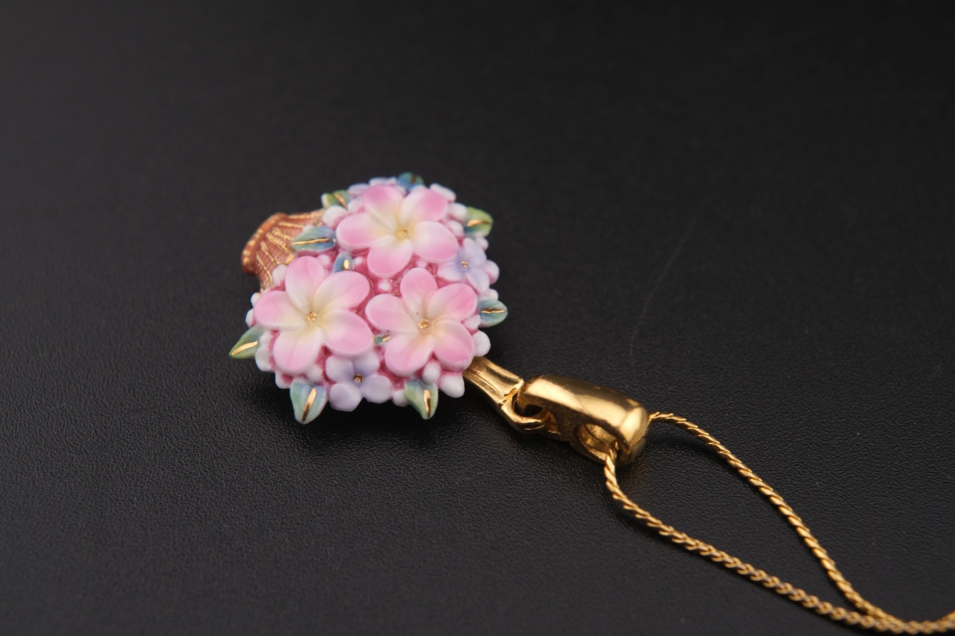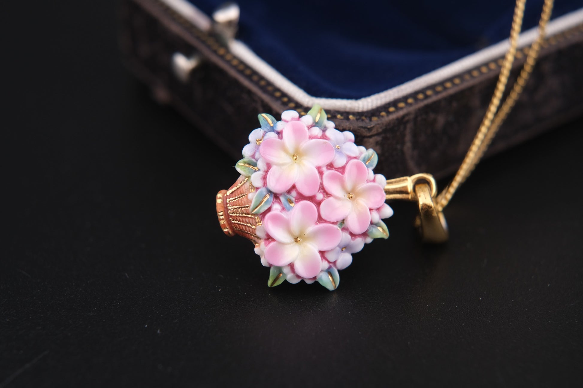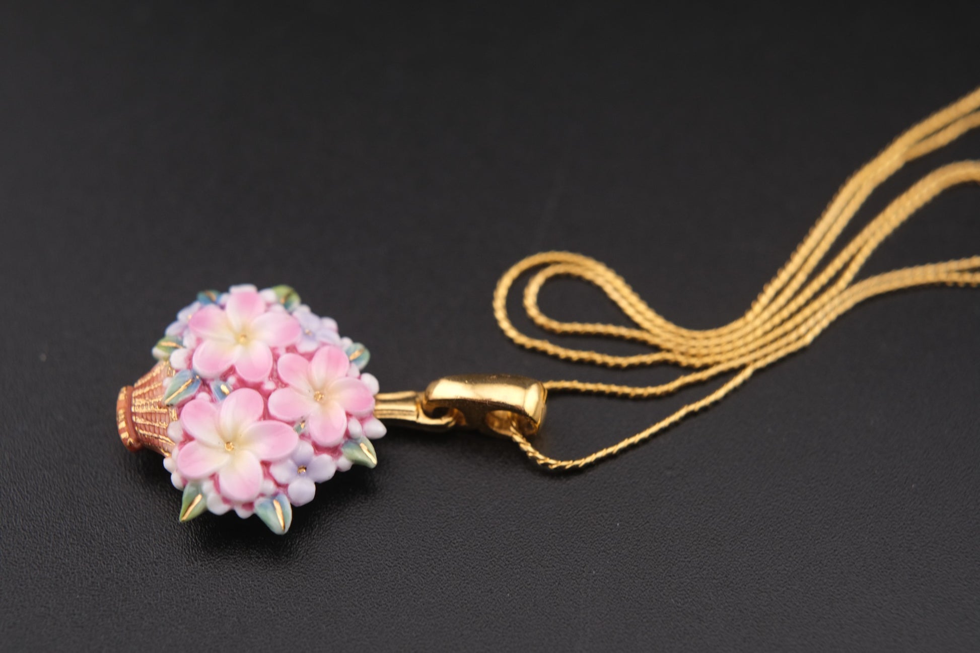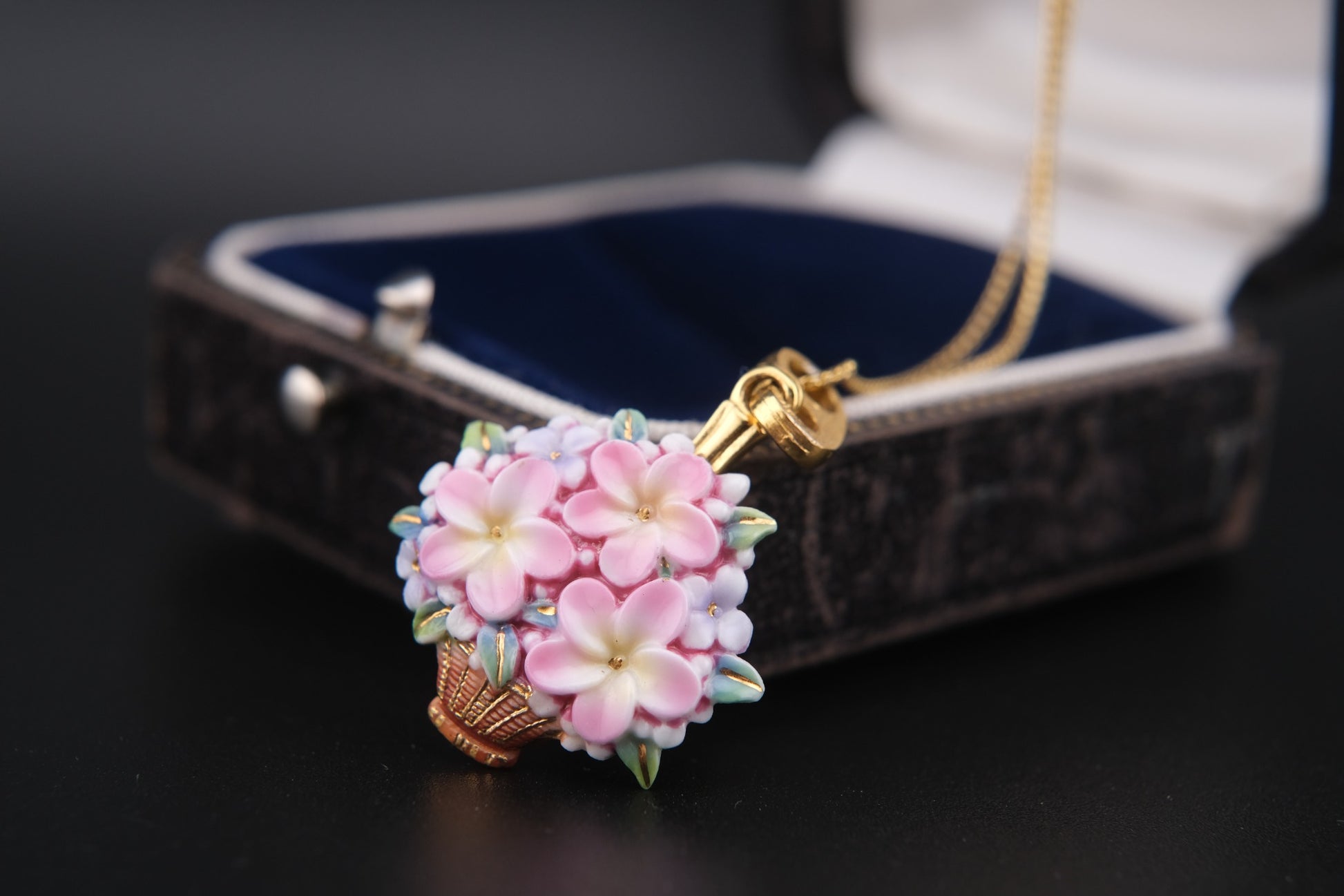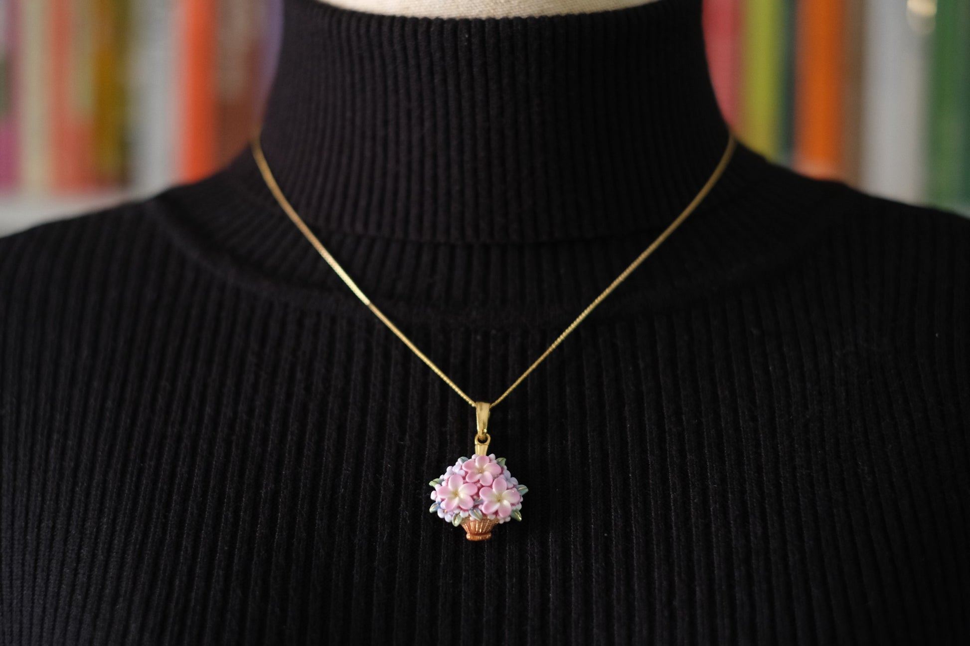 Toshikane Floral Basket Pendant Necklace – Hand-Painted Porcelain Enamel with Gold-Tone Chain