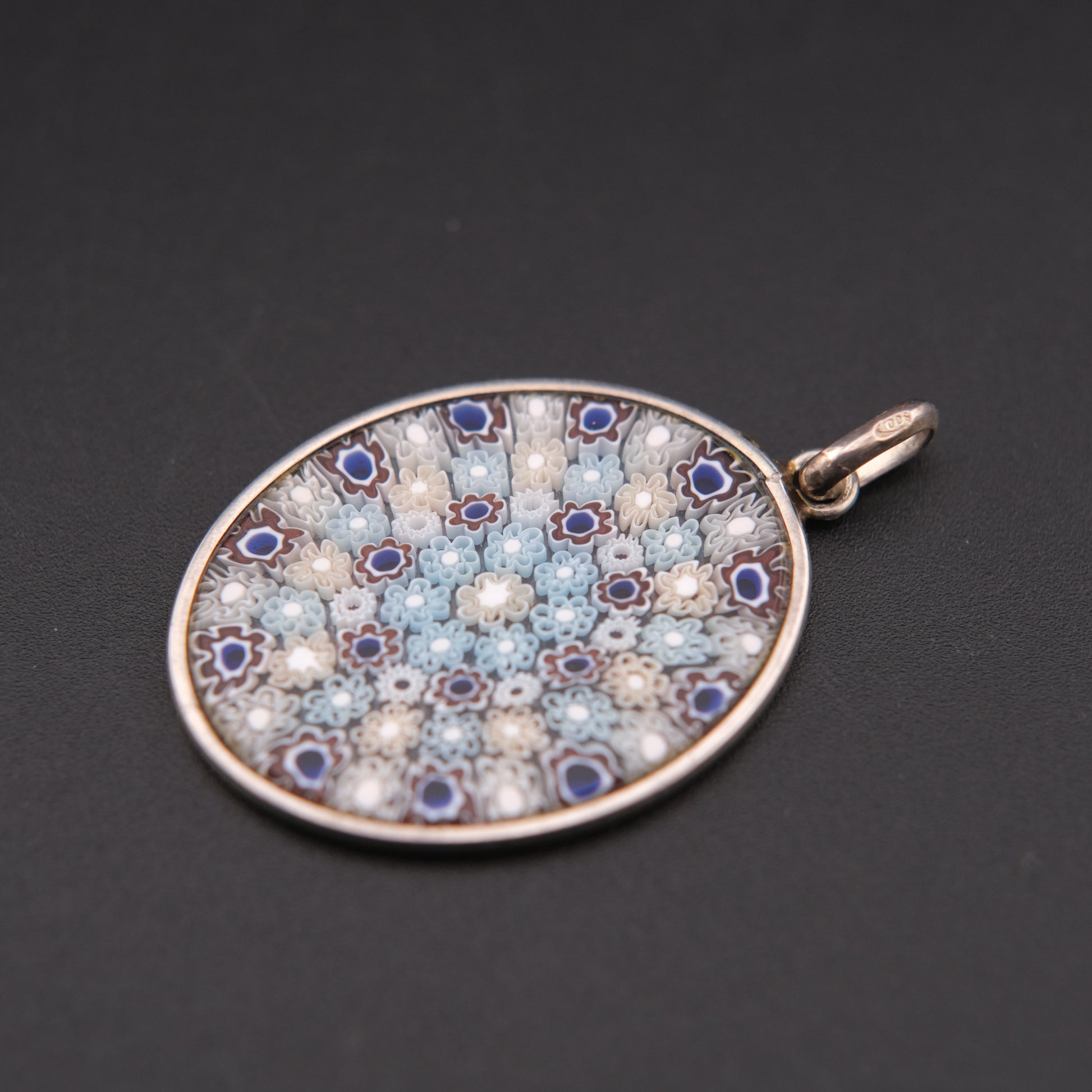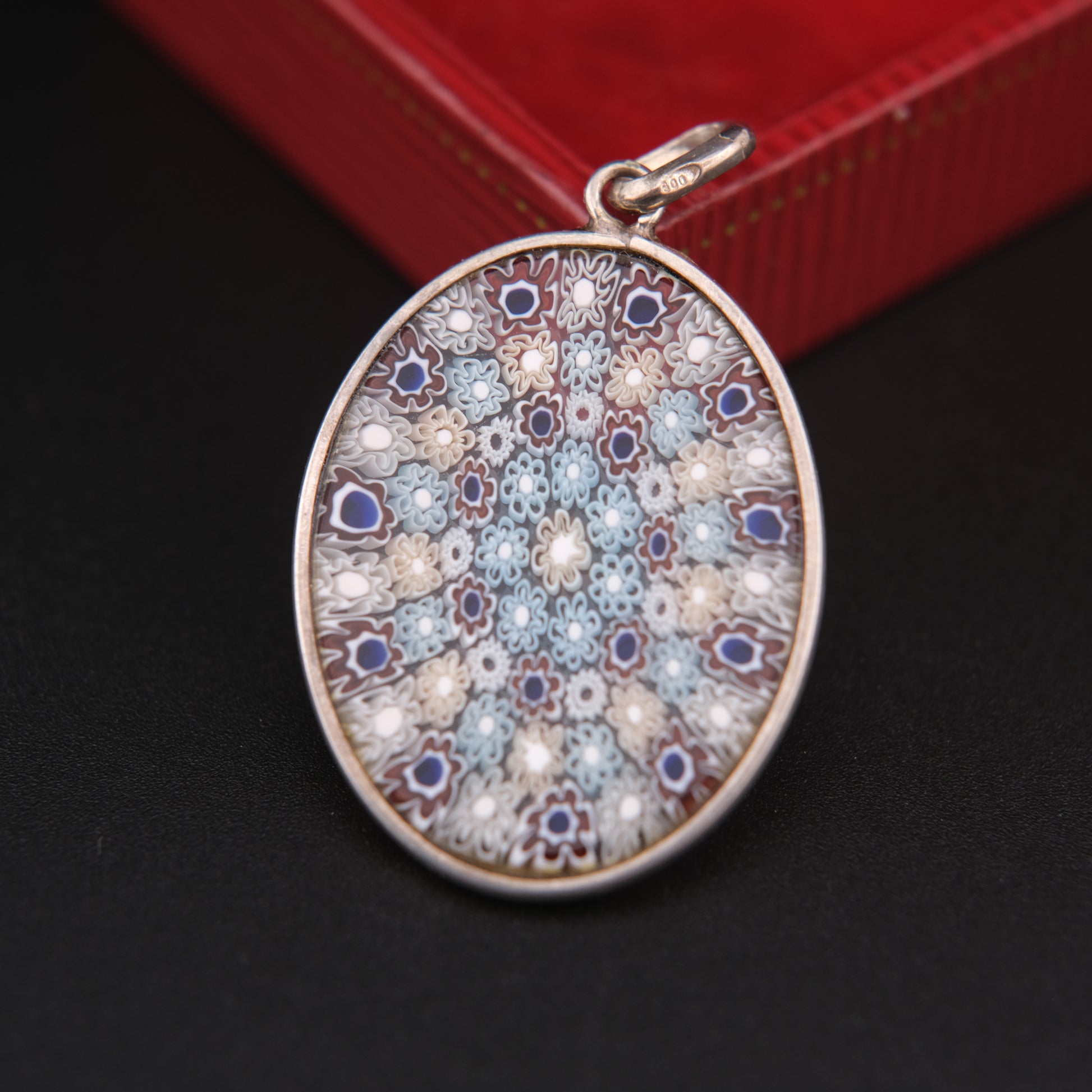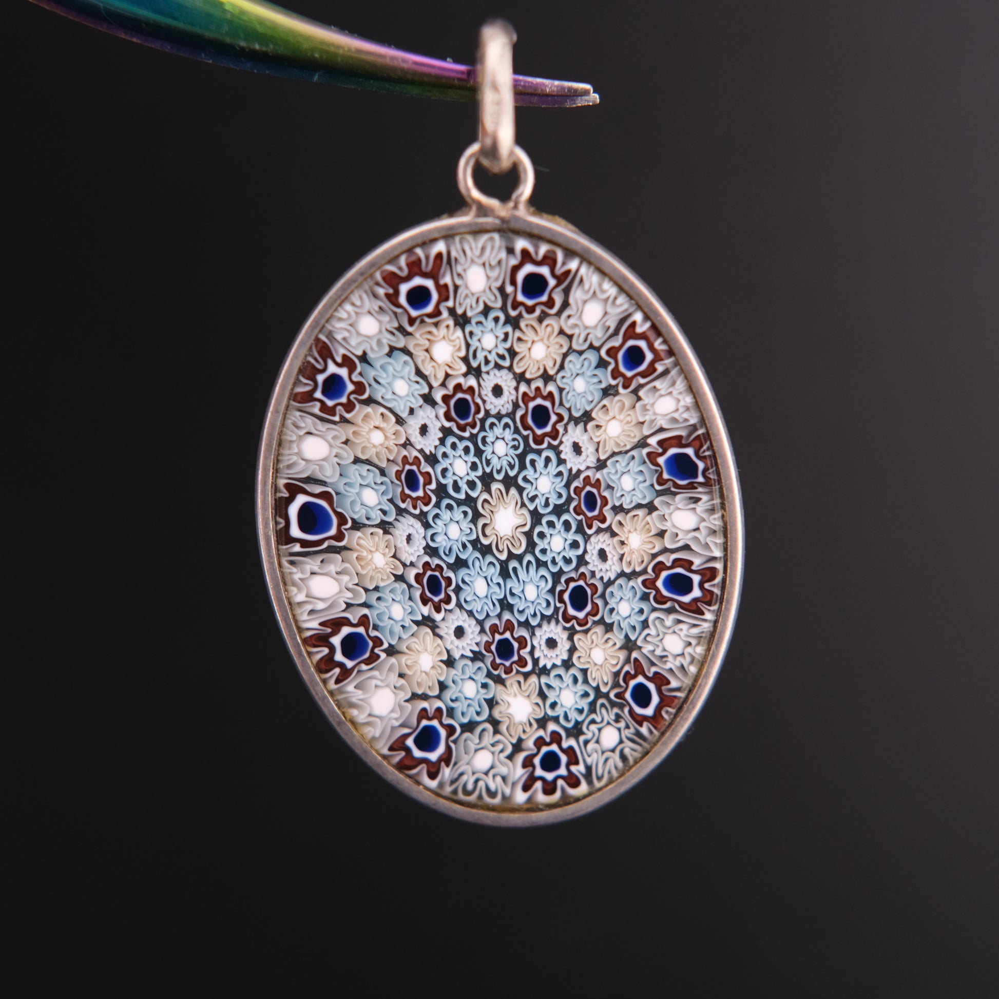 Add a touch of Italian artistry to your collection with this exquisite vintage millefiori pendant. Expertly crafted with intricate glass mosaic work in serene hues of light blue, ivory, and deep brown, the piece forms a mesmerizing floral mandala pattern—each cane individually fused and polished to perfection. Set in an oval 800 silver frame, this pendant beautifully captures the timeless Venetian glassmaking tradition.