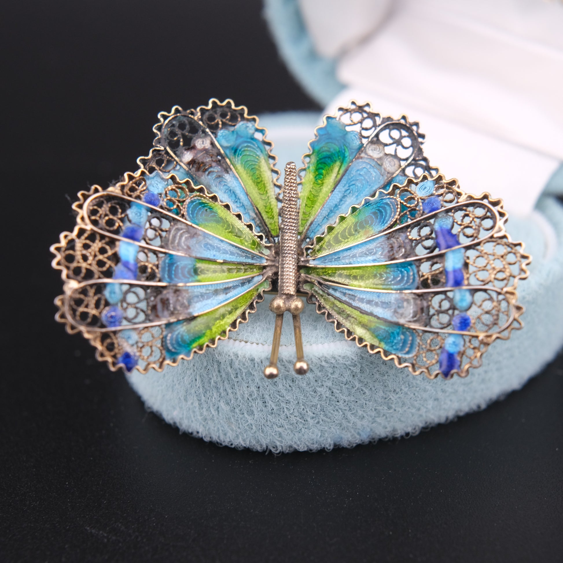 - Design: Butterfly motif with filigree and guilloché-style enamel