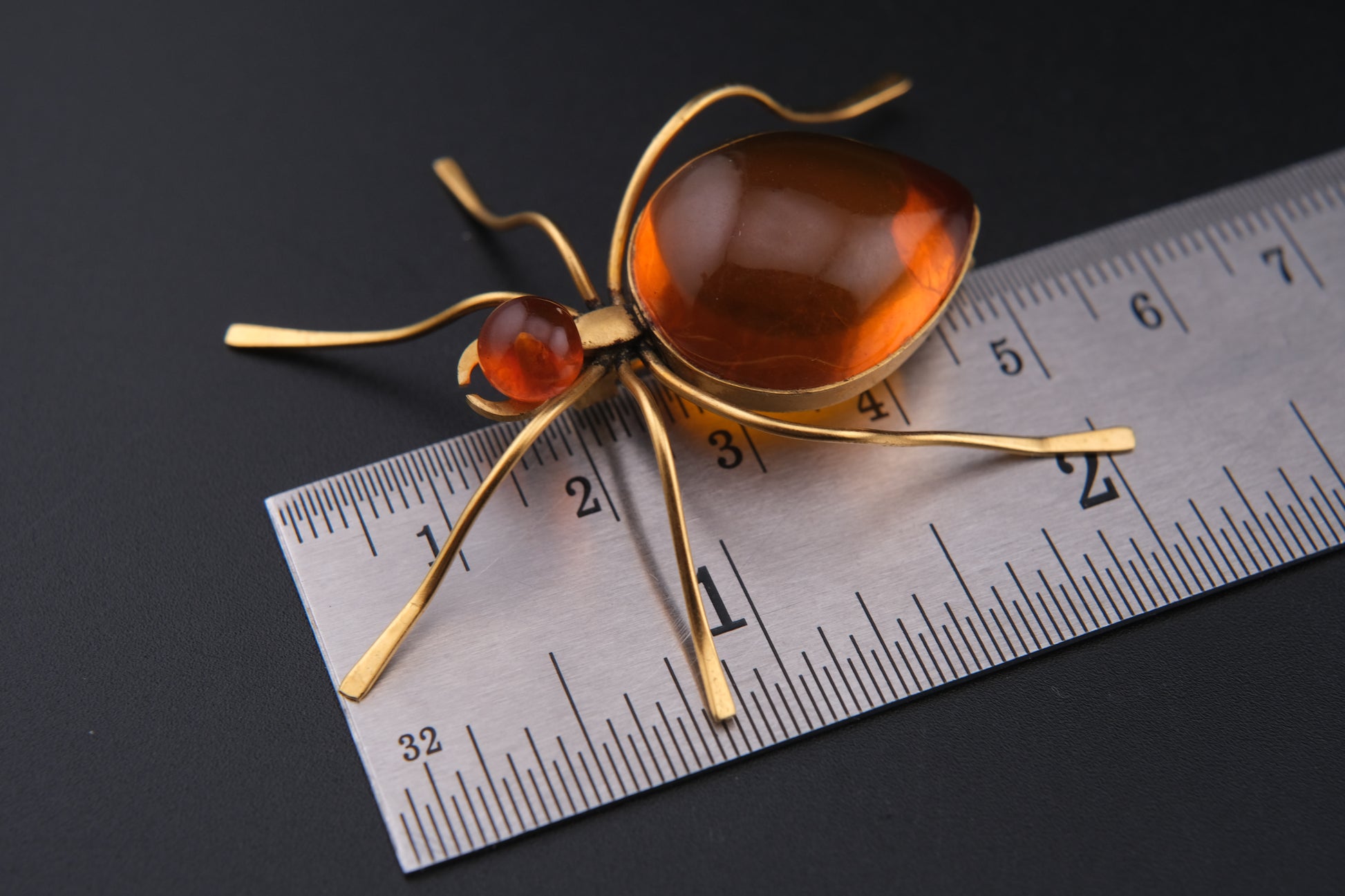 Bring a touch of whimsy and natural beauty to your collection with this striking vintage insect brooch. Designed in the shape of an ant, it features a glowing amber cabochon body and head set in a sculptural gold-tone frame. The warm honey and cognac tones of the amber beautifully contrast against the sleek golden legs, giving the piece both elegance and playful charm. A true conversation starter, this brooch is perfect for collectors of vintage jewelry or anyone who loves nature-inspired statement pieces.
