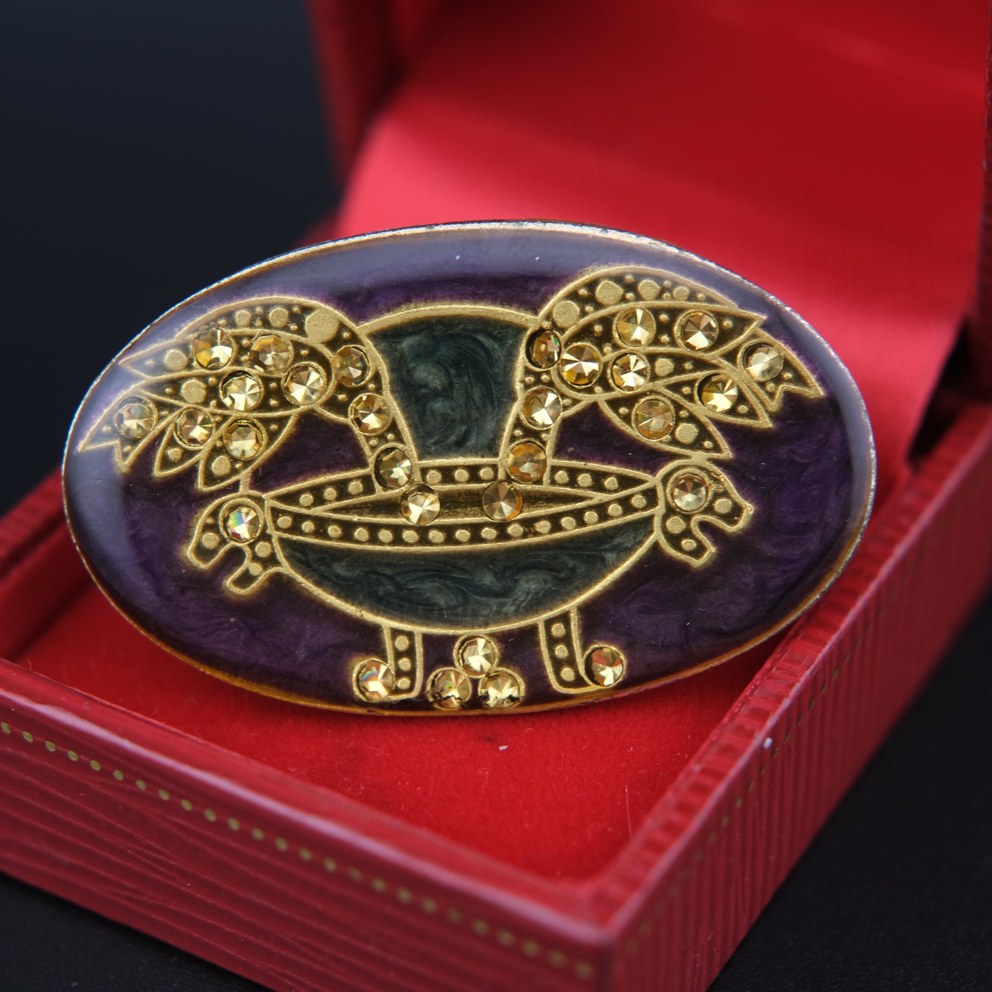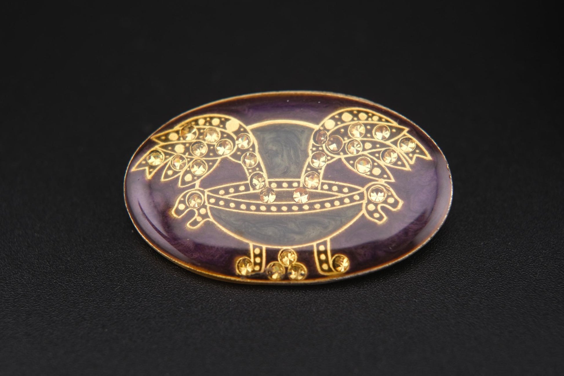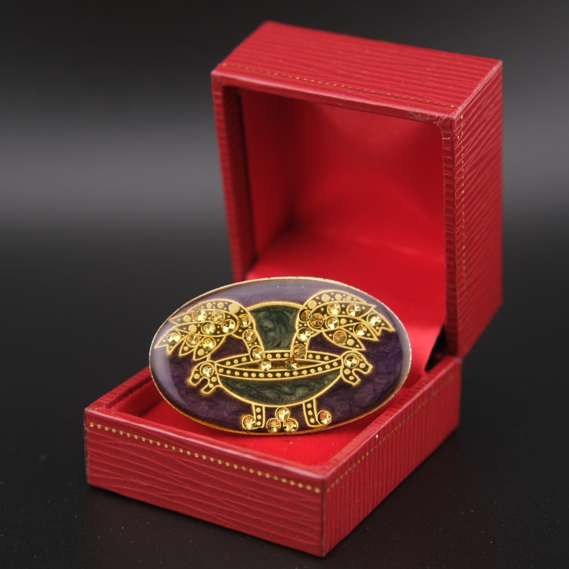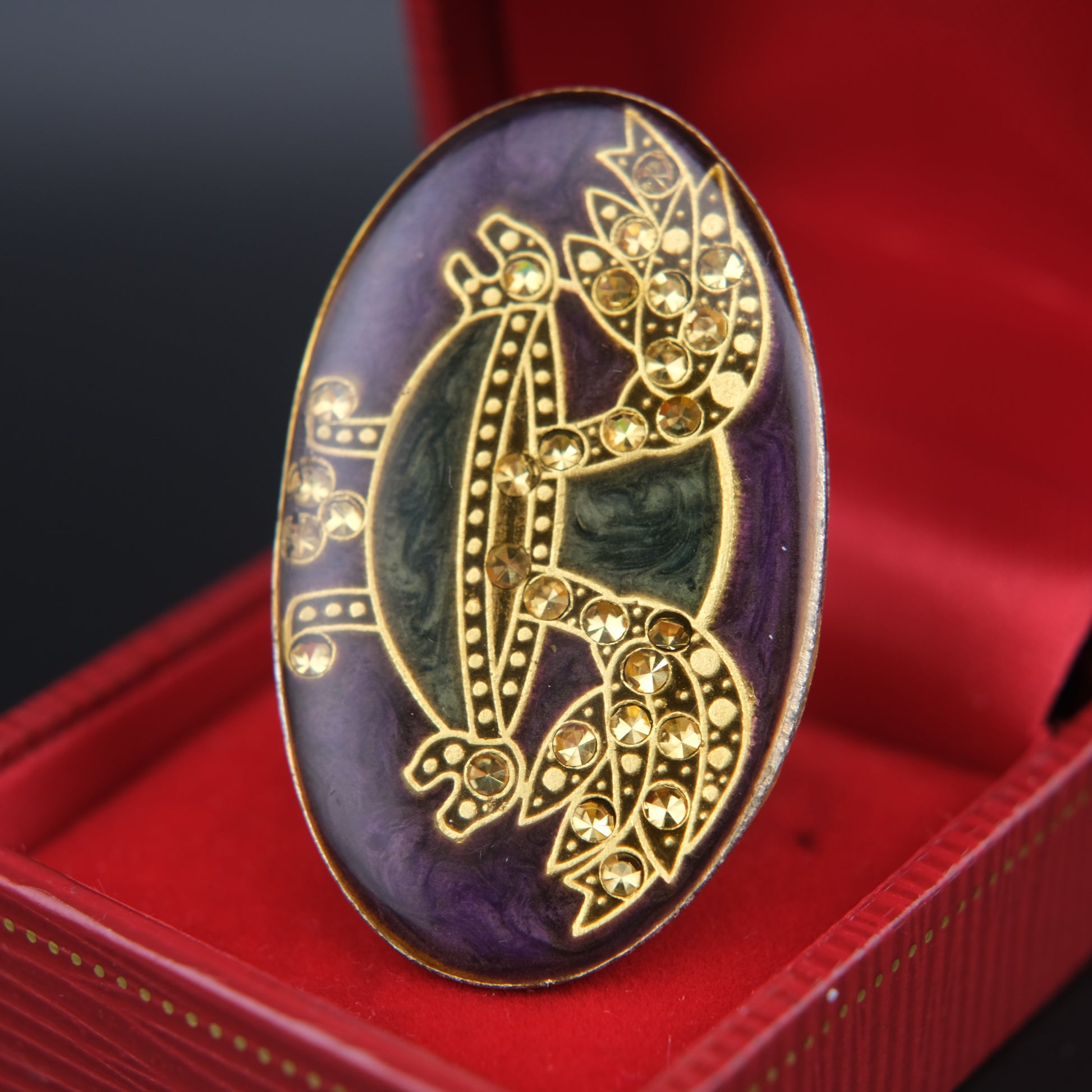 This striking vintage brooch features a stylized motif in gold-tone metal, beautifully accented with sparkling rhinestones and a marbled enamel background in deep purple and green. The intricate design and oval form give it a timeless Art Deco-inspired charm, making it a versatile statement piece for any occasion.