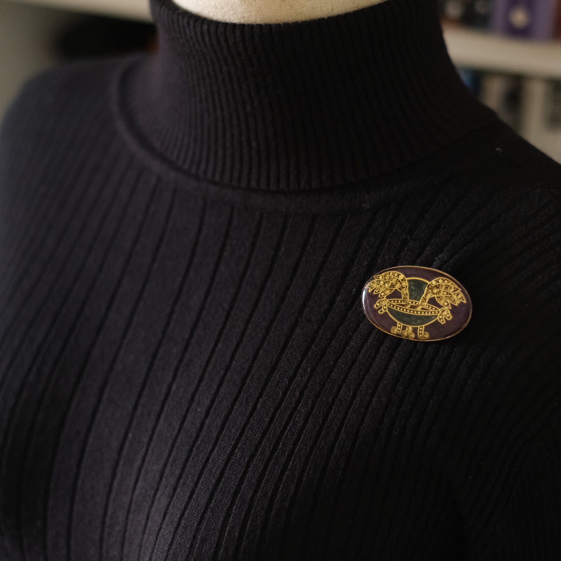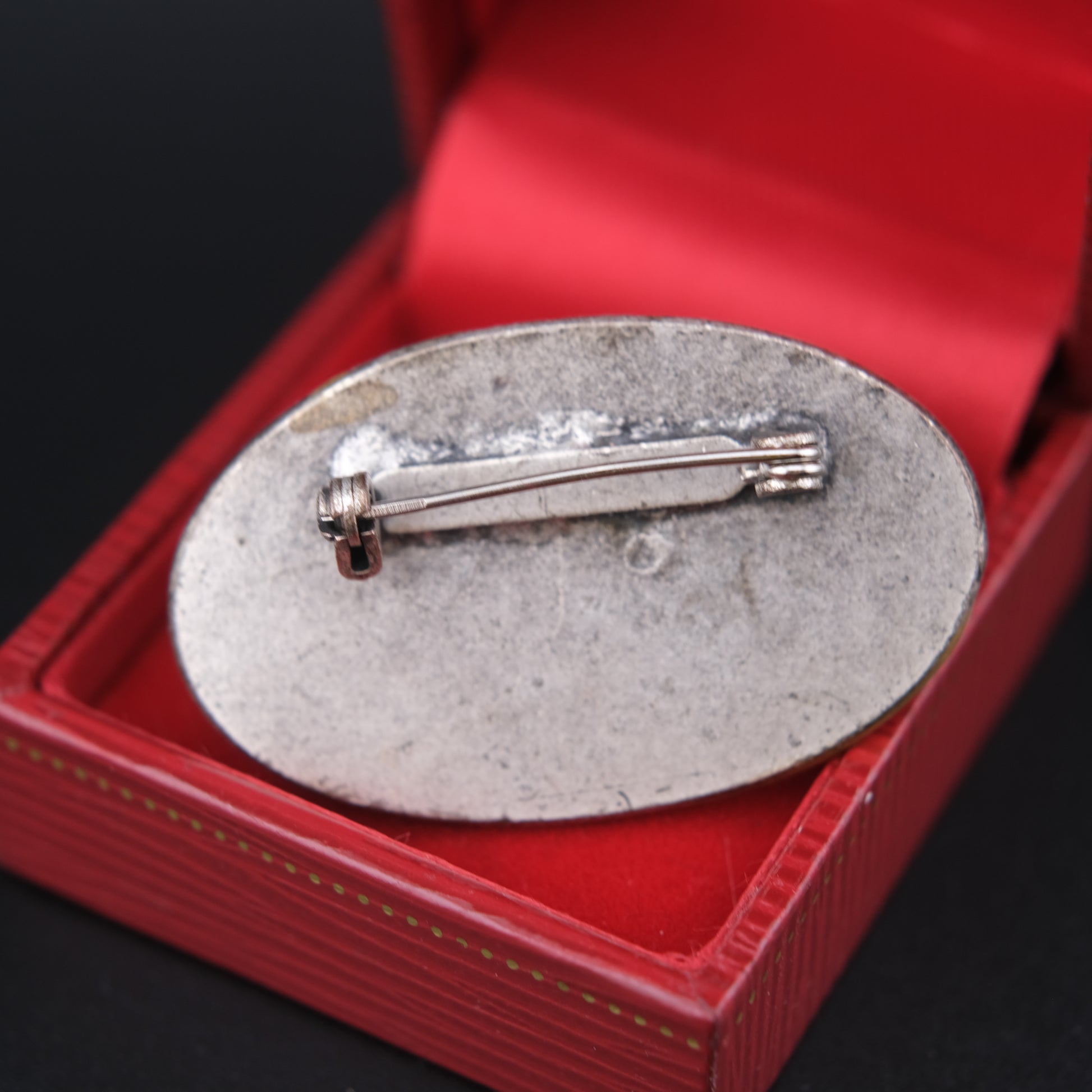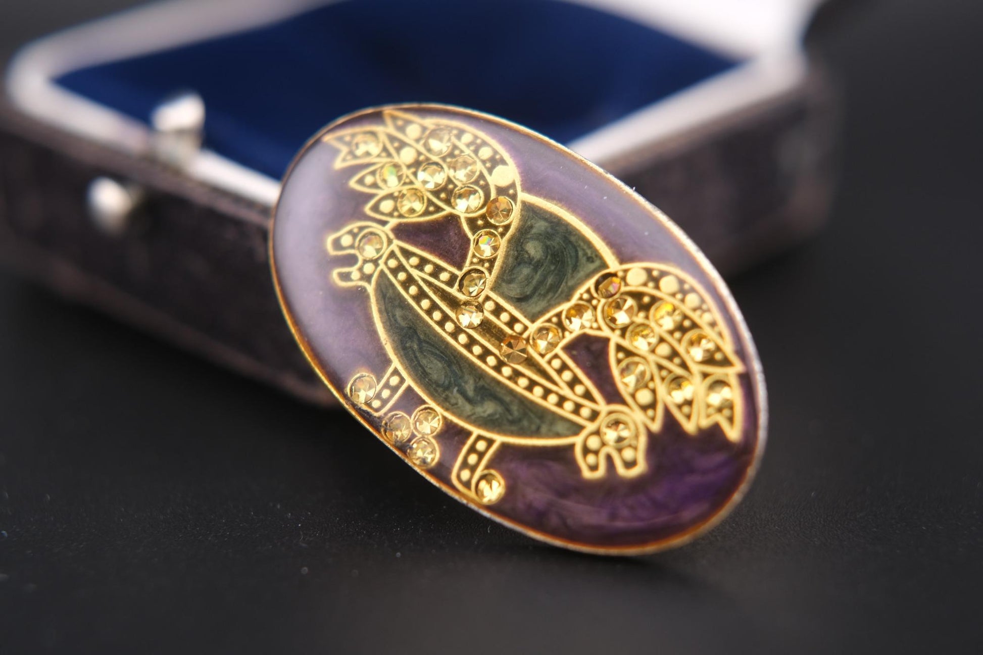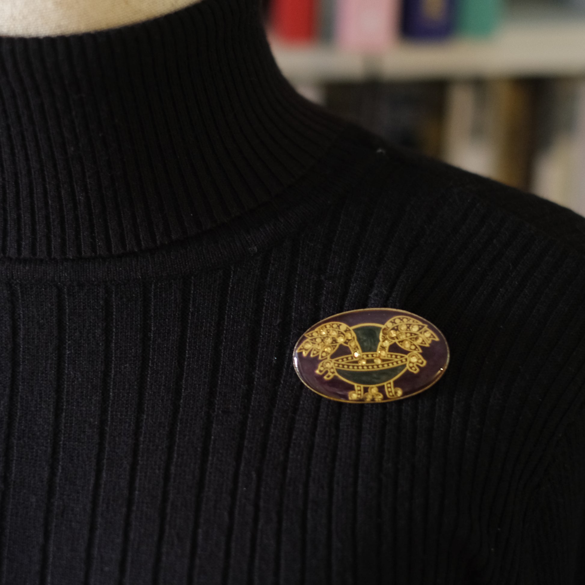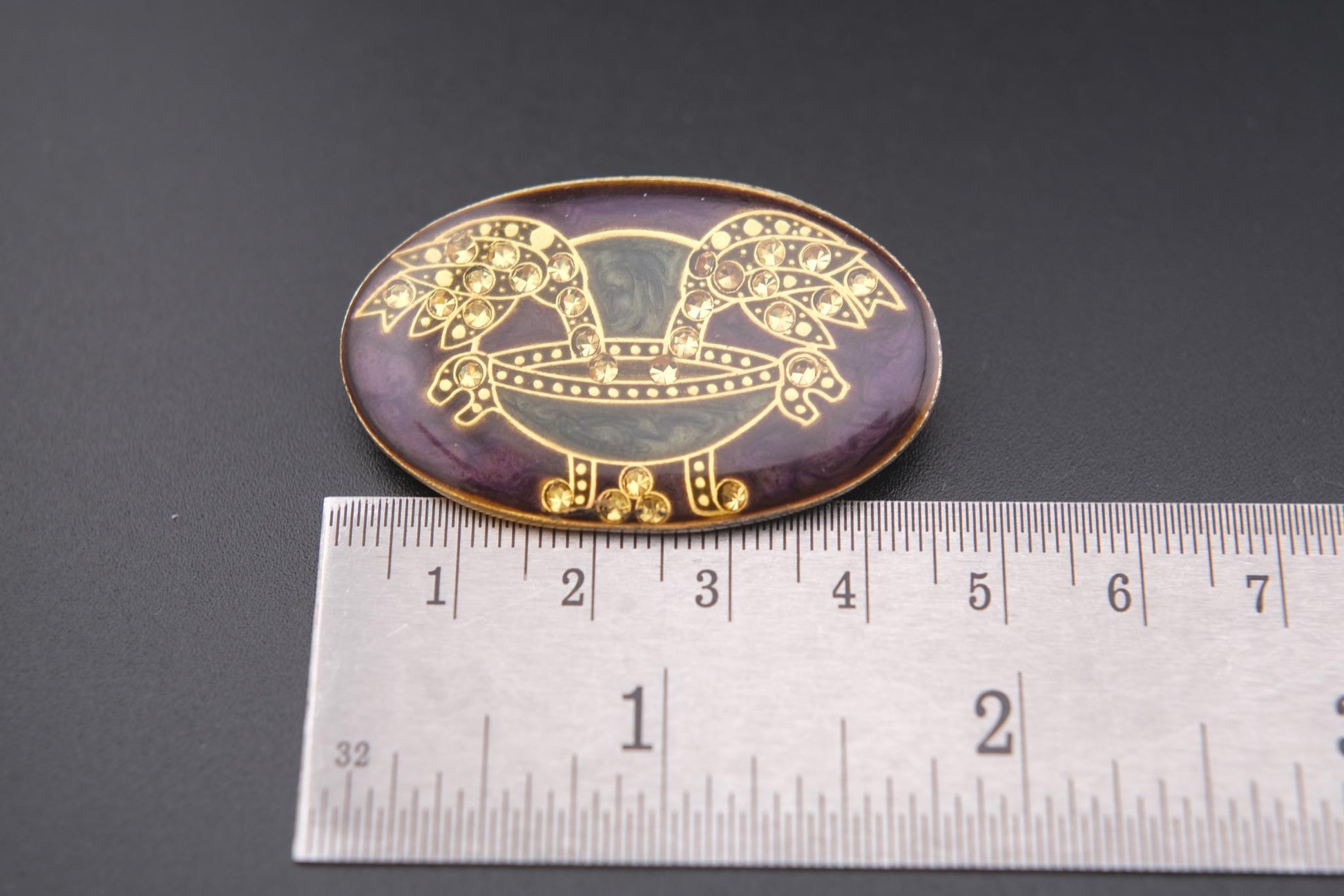 - Design: Oval brooch with stylized motif, rhinestone accents, and marbled enamel background