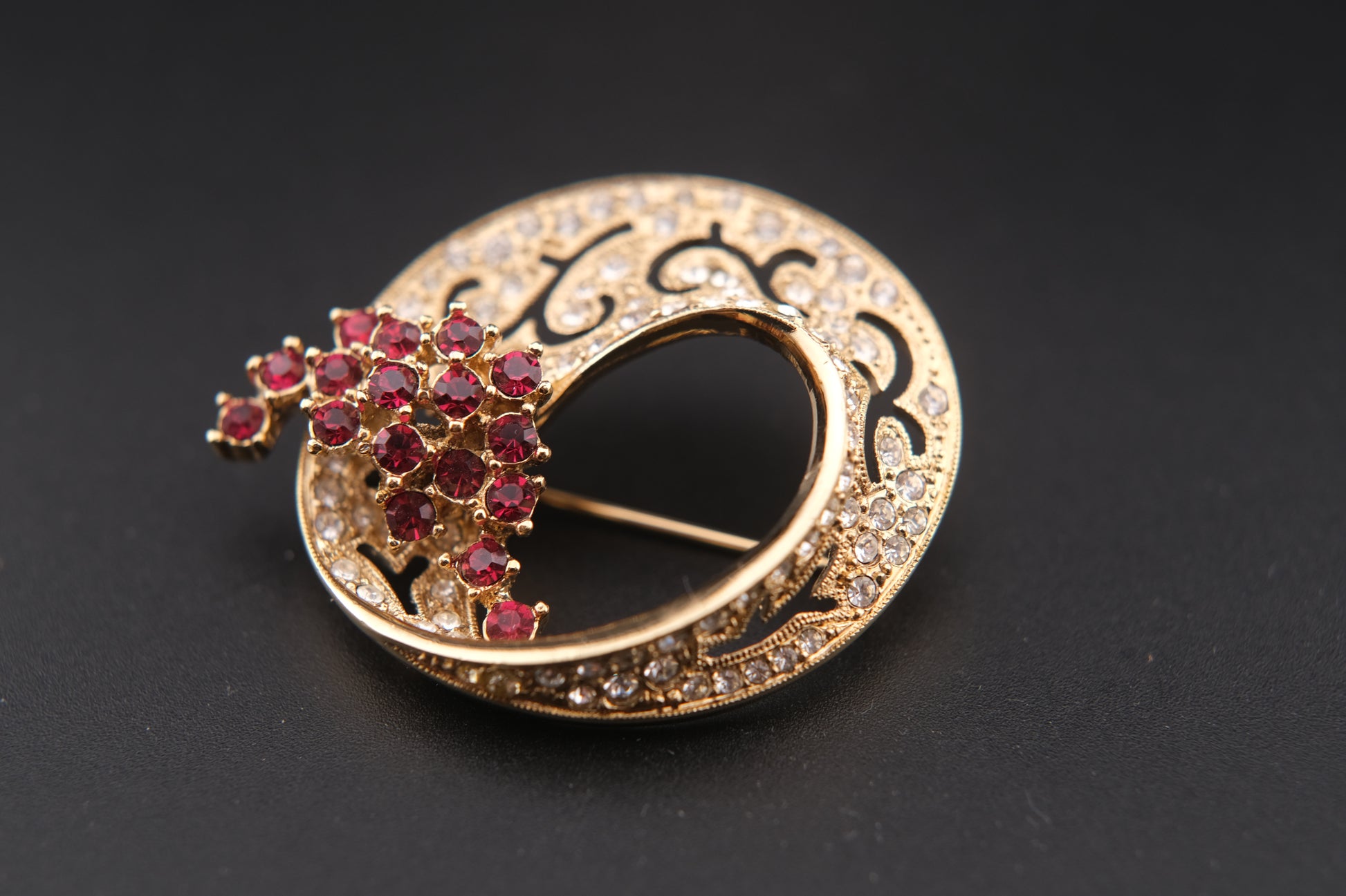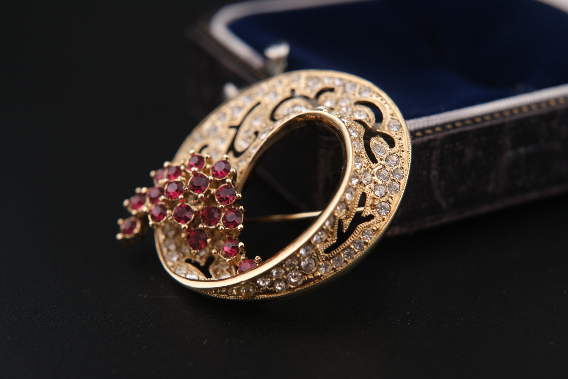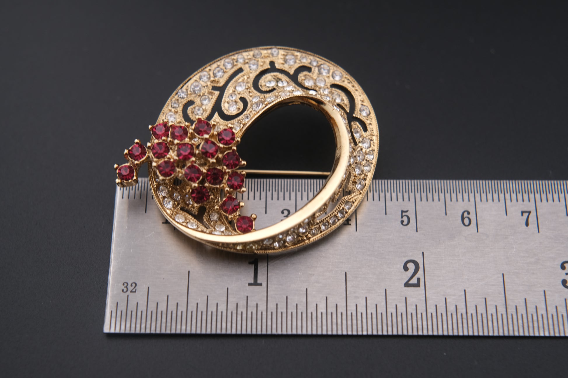 Vintage Attwood & Sawyer Ruby & Crystal Floral Brooch – Gold-Tone Circular Design