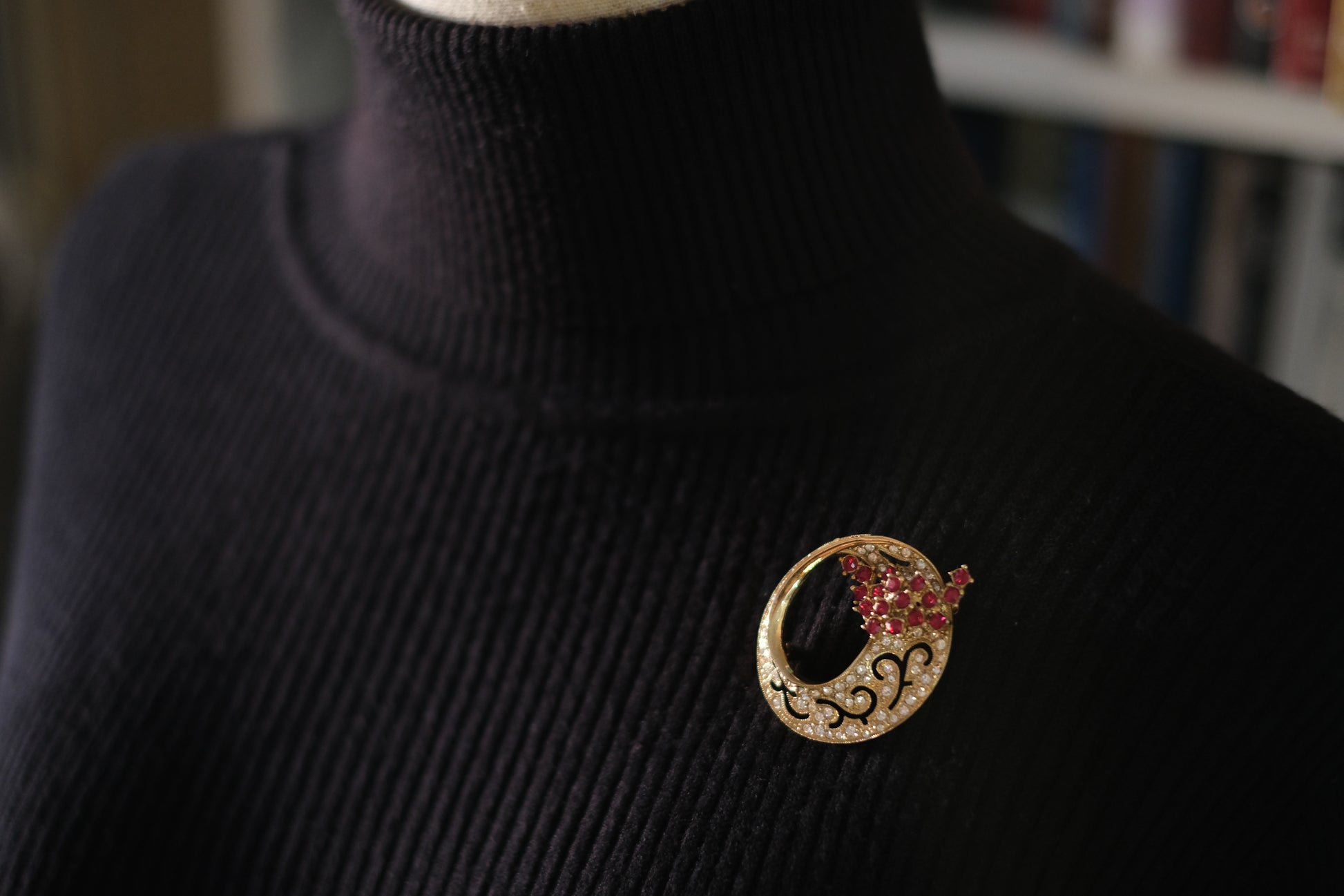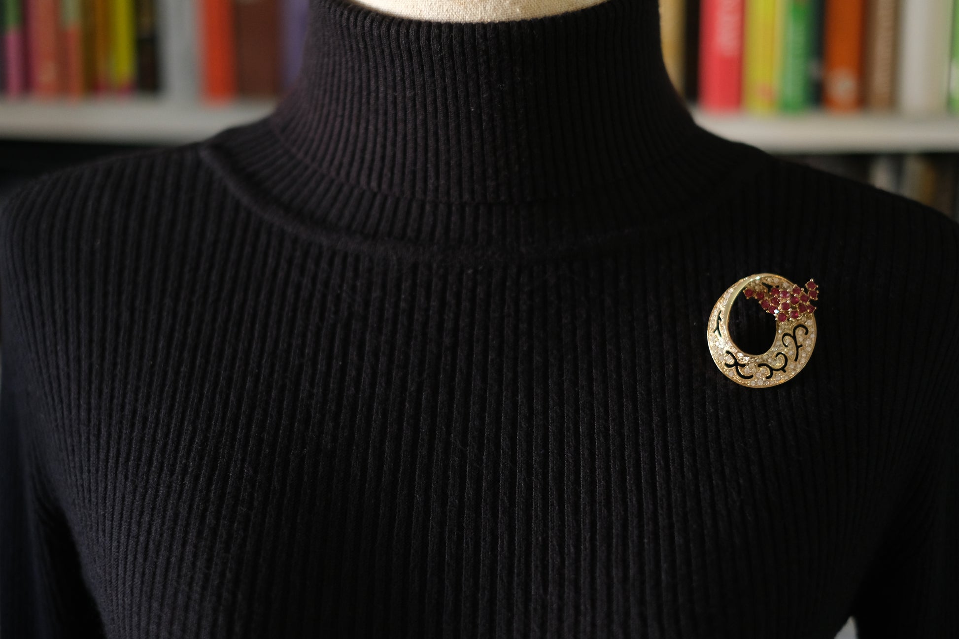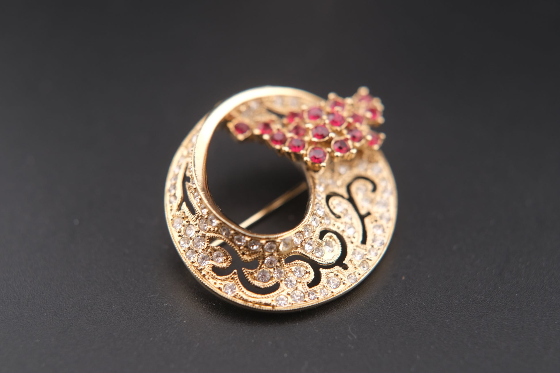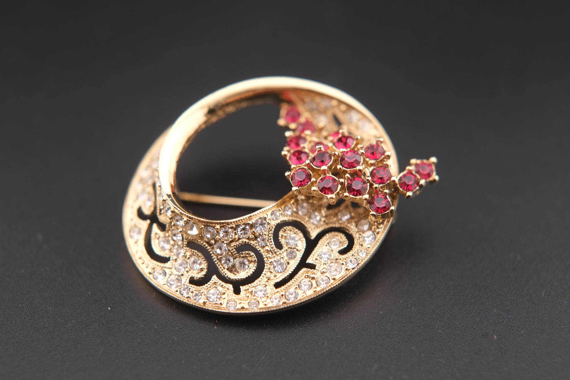 Vintage Attwood & Sawyer Ruby & Crystal Floral Brooch – Gold-Tone Circular Design
