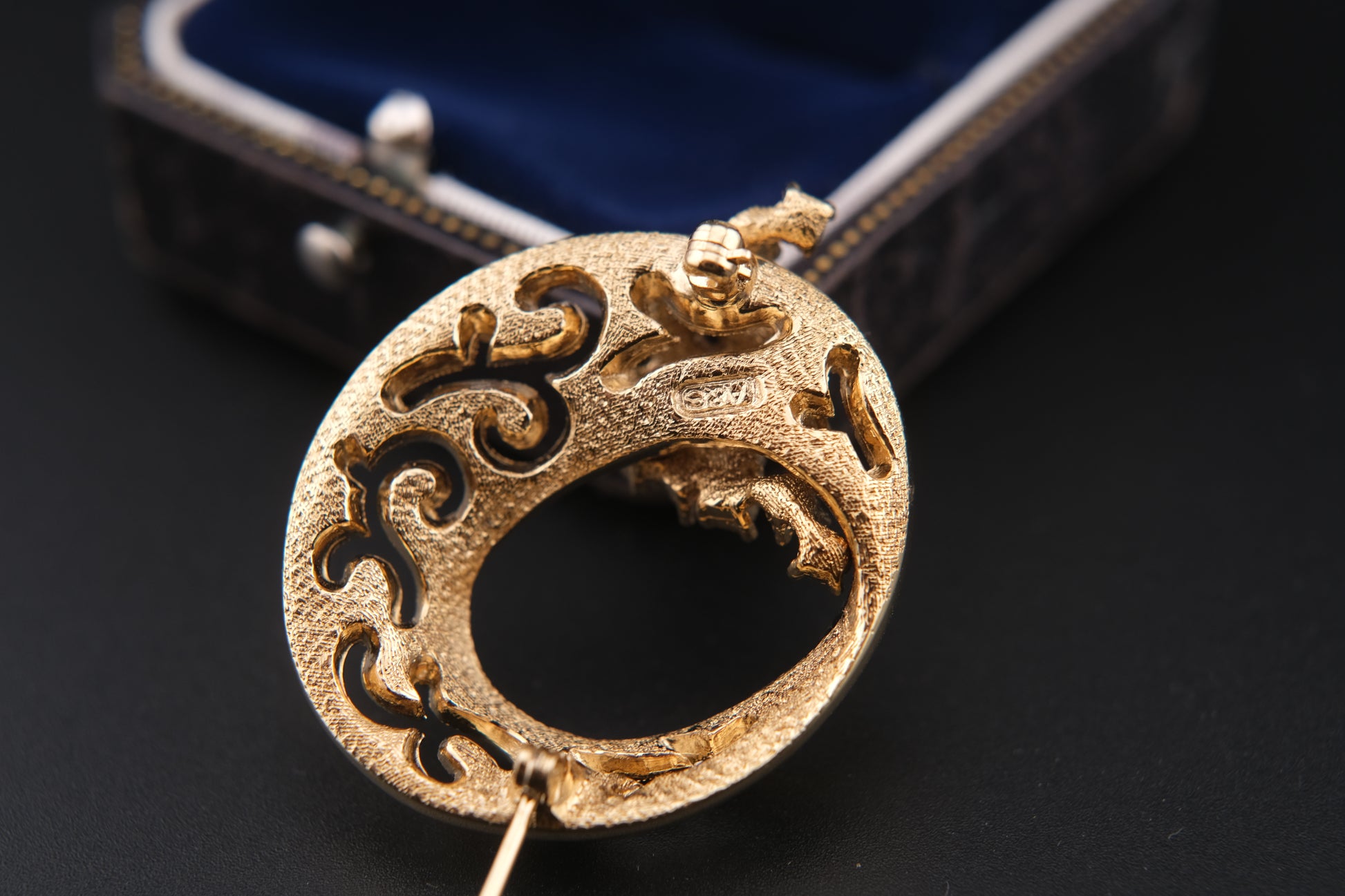 This exquisite vintage brooch from Attwood & Sawyer features a refined circular silhouette crafted in gold-tone metal. A raised central cluster of deep ruby-red rhinestones adds a striking focal point, beautifully accented by sparkling clear crystals arranged in an ornate floral pattern. The design's dimensional structure offers rich texture and visual depth, making this an elegant addition to any vintage jewelry collection. Perfect for collectors or those who adore classic British costume jewelry with timeless charm.