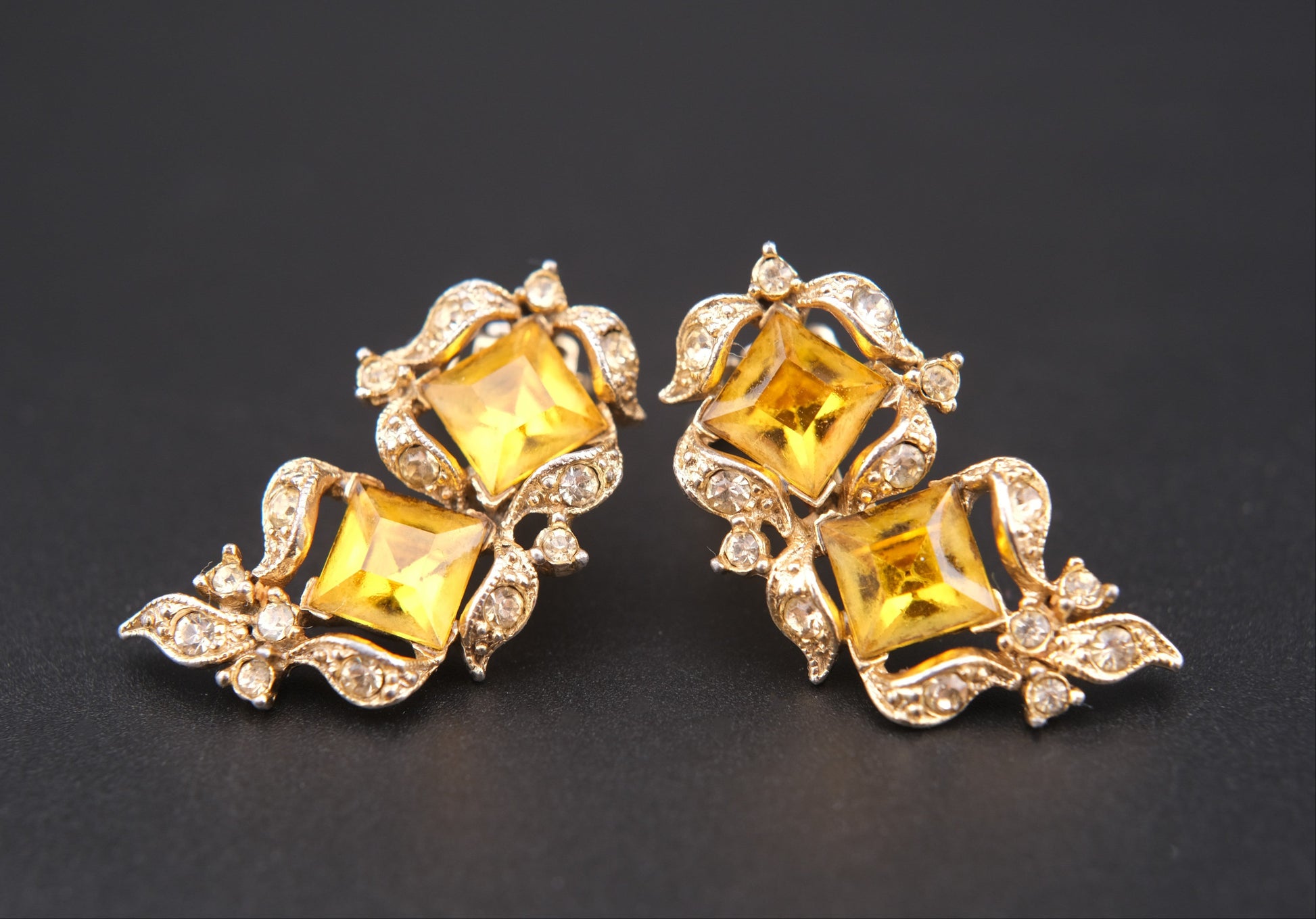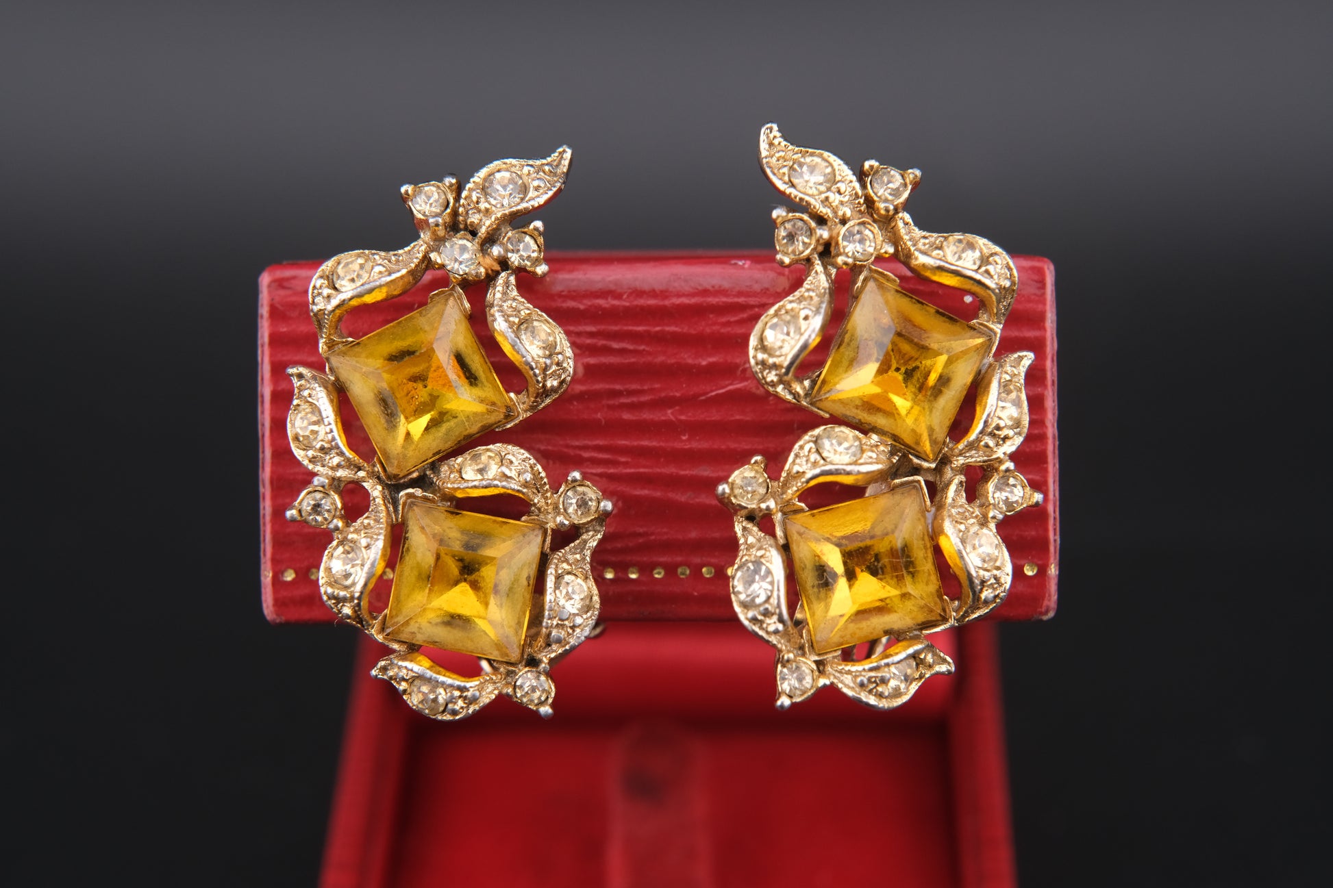 Vintage Bogoff Yellow Glass & Rhinestone Clip-On Earrings – Elegant 1950s Statement Jewelry