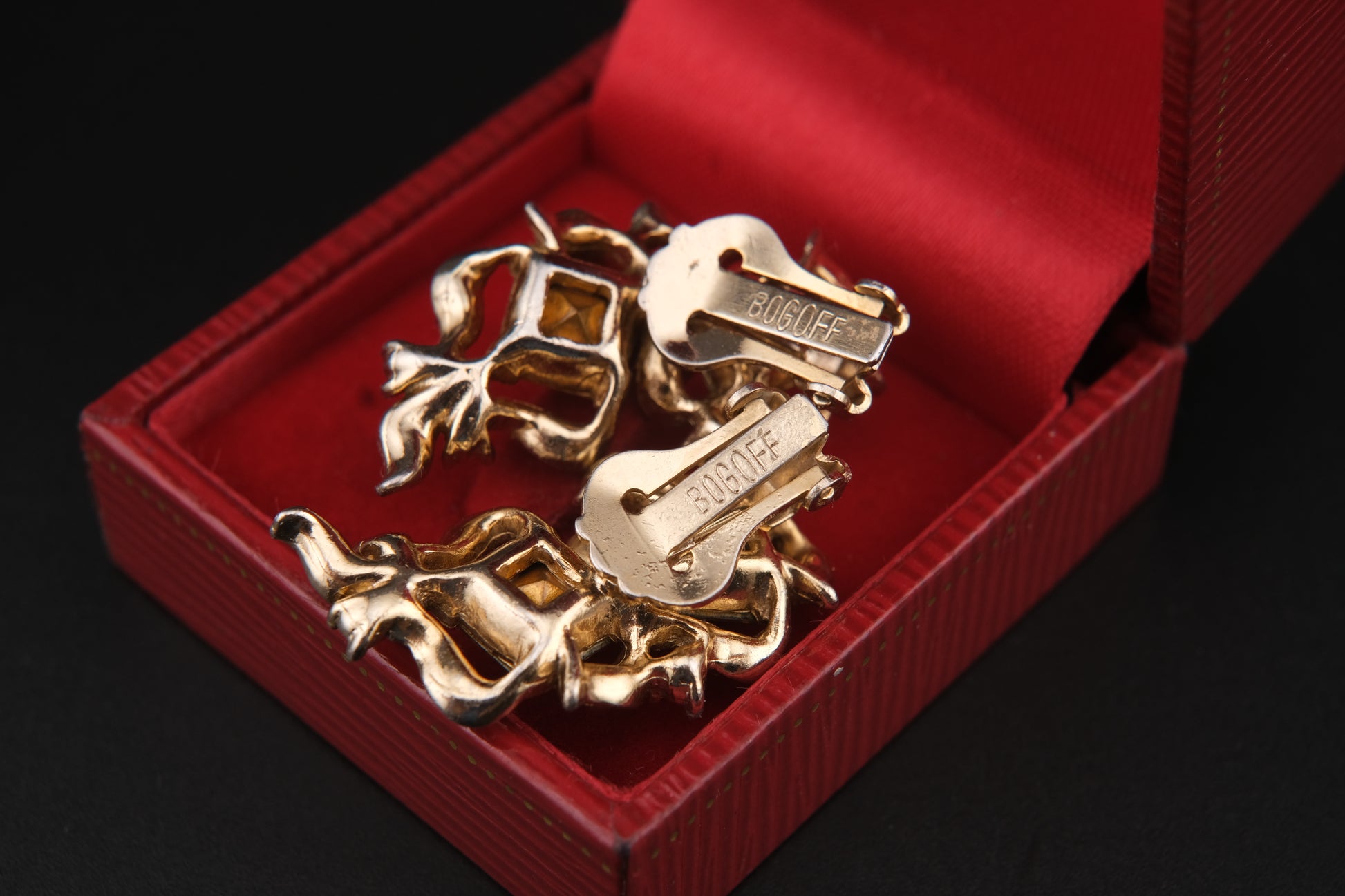 Step into mid-century glamour with this dazzling pair of vintage Bogoff earrings. Featuring vibrant square-cut yellow glass stones framed by ornate gold-tone scrollwork and shimmering clear rhinestones, these clip-on earrings capture the sophisticated sparkle that made Bogoff one of the most collectible jewelry brands of the 20th century.