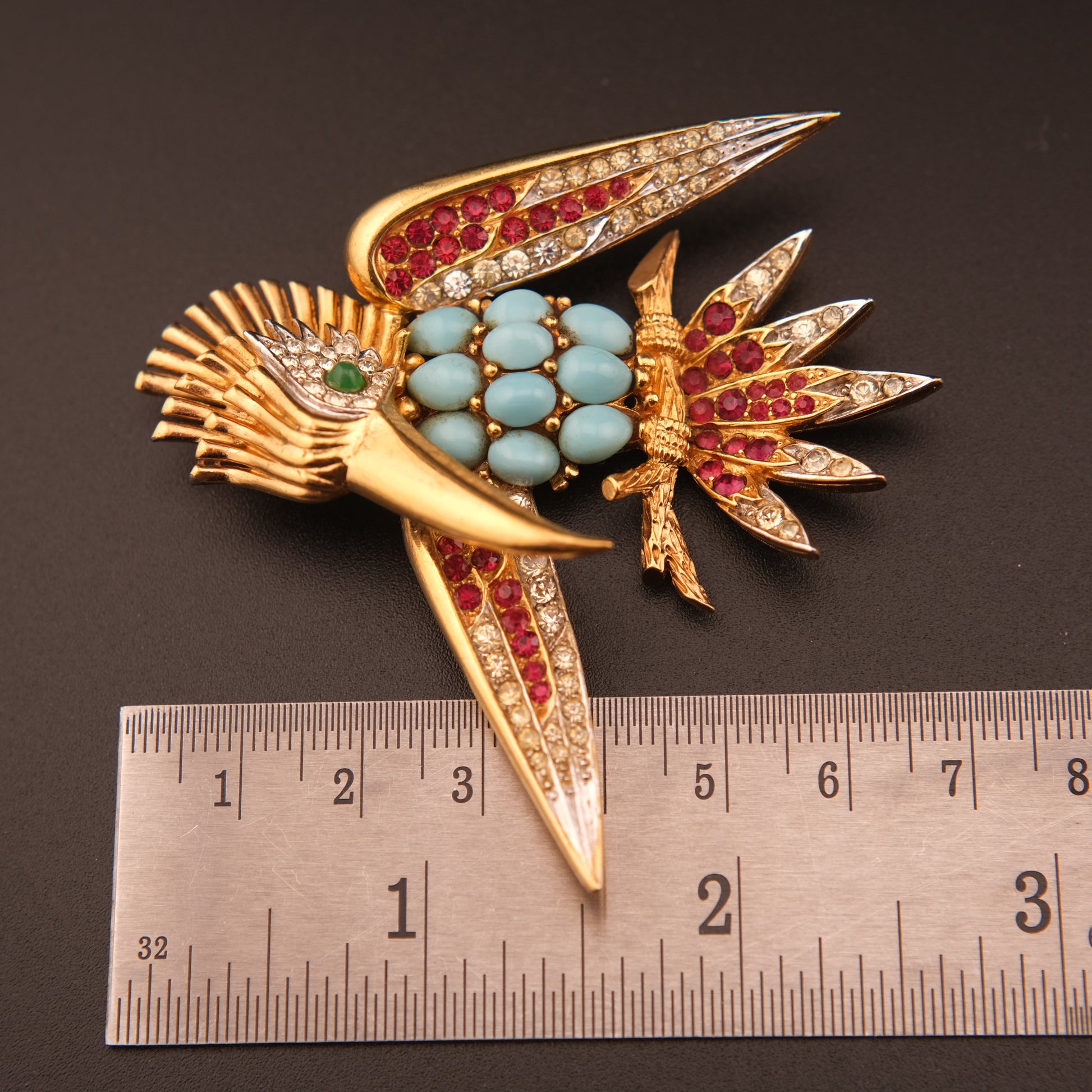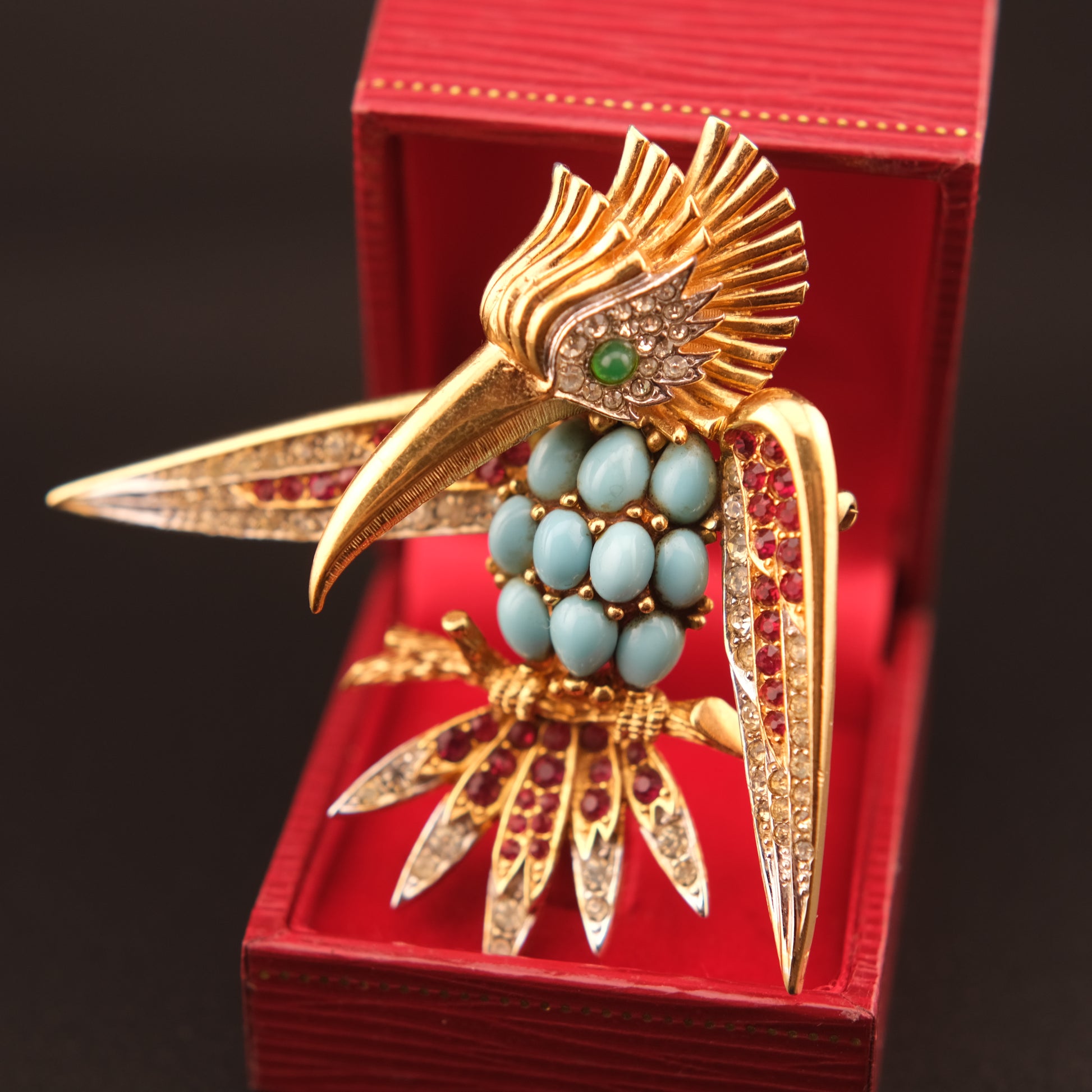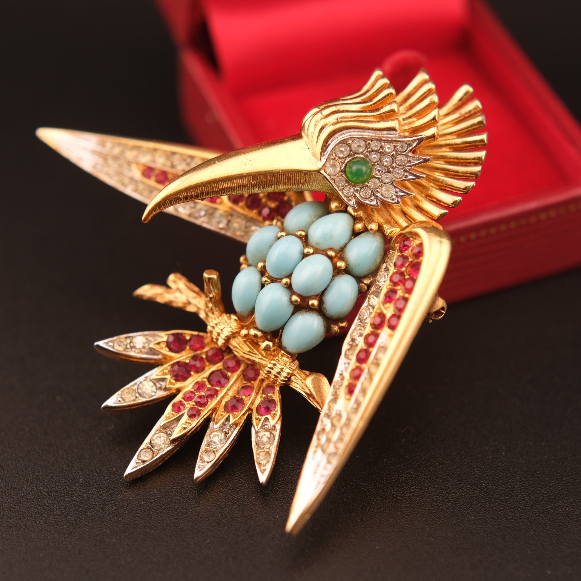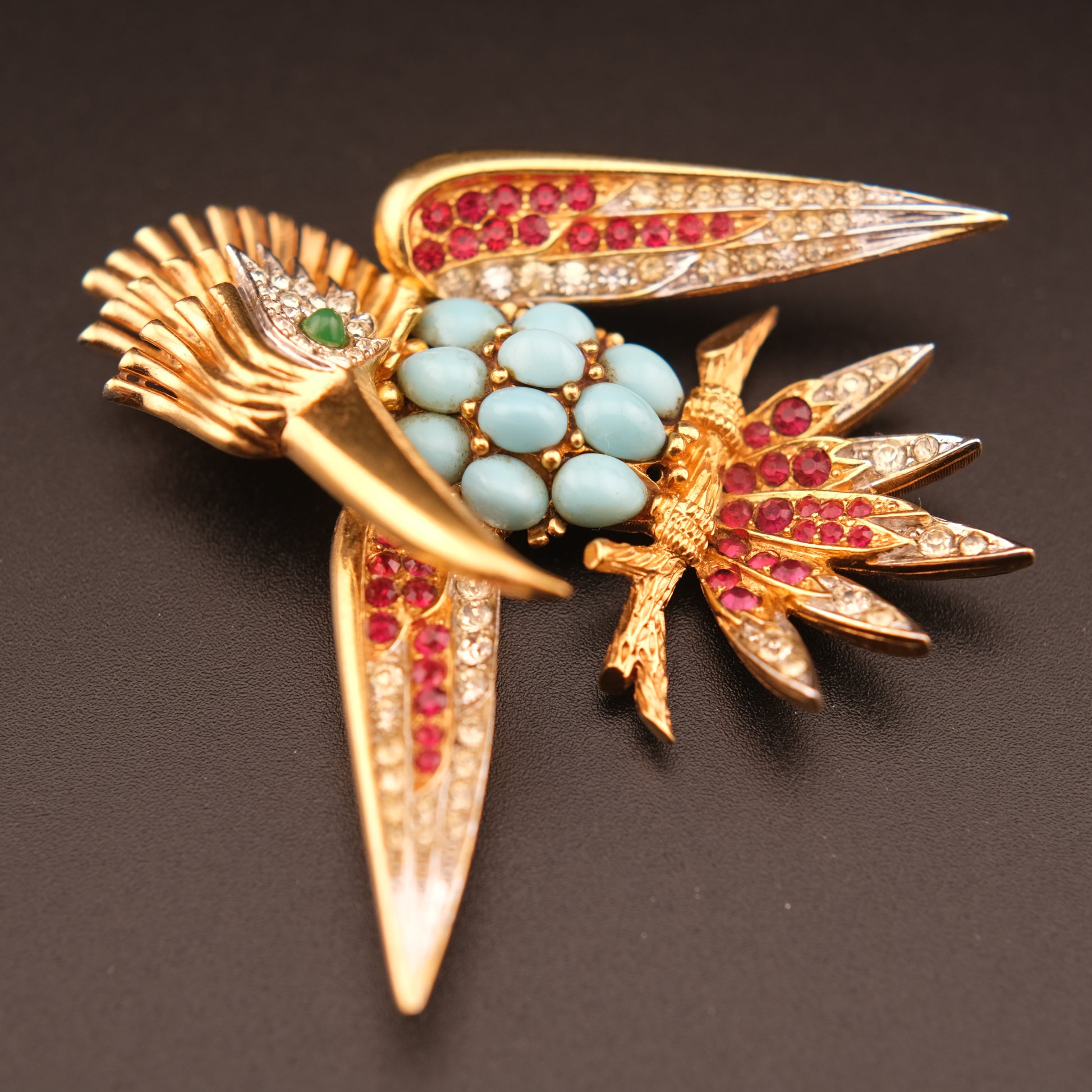 Vintage Boucher Bird Brooch with Turquoise Cabochons, Ruby & Crystal Accents