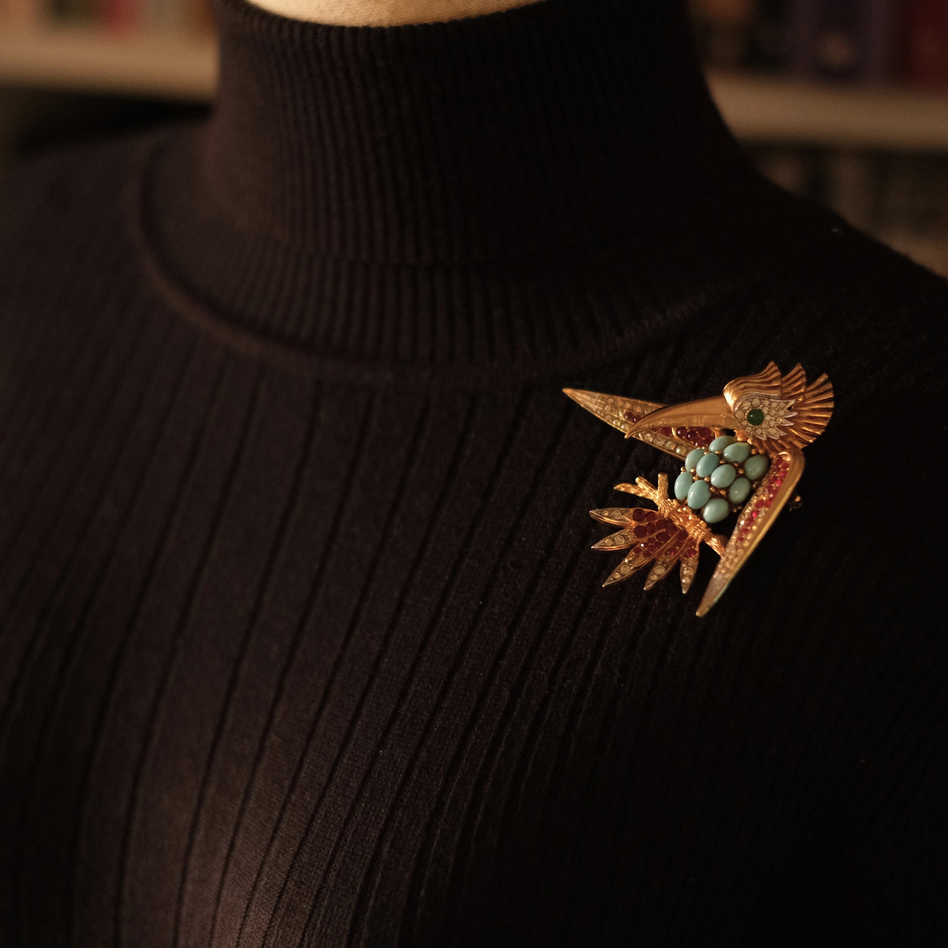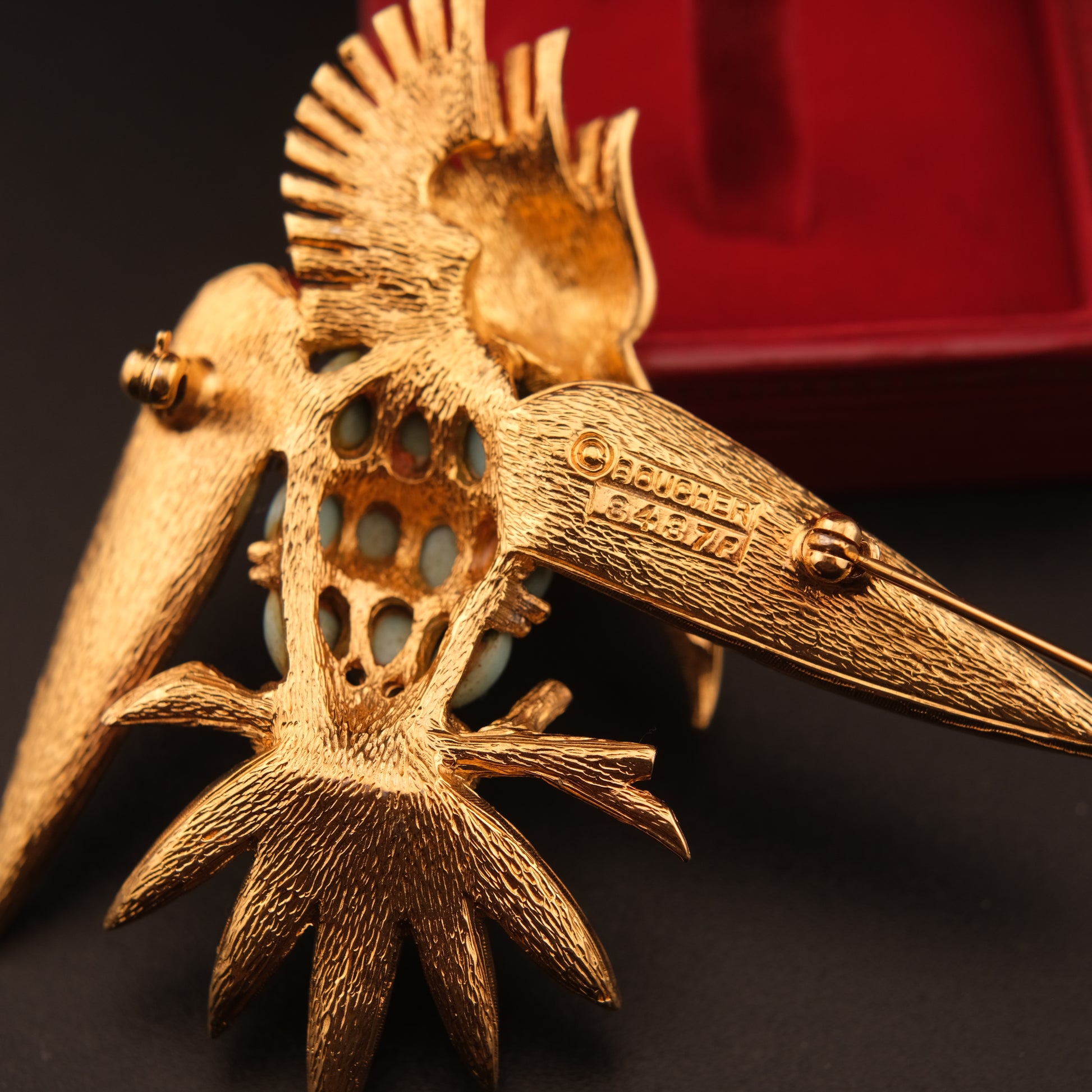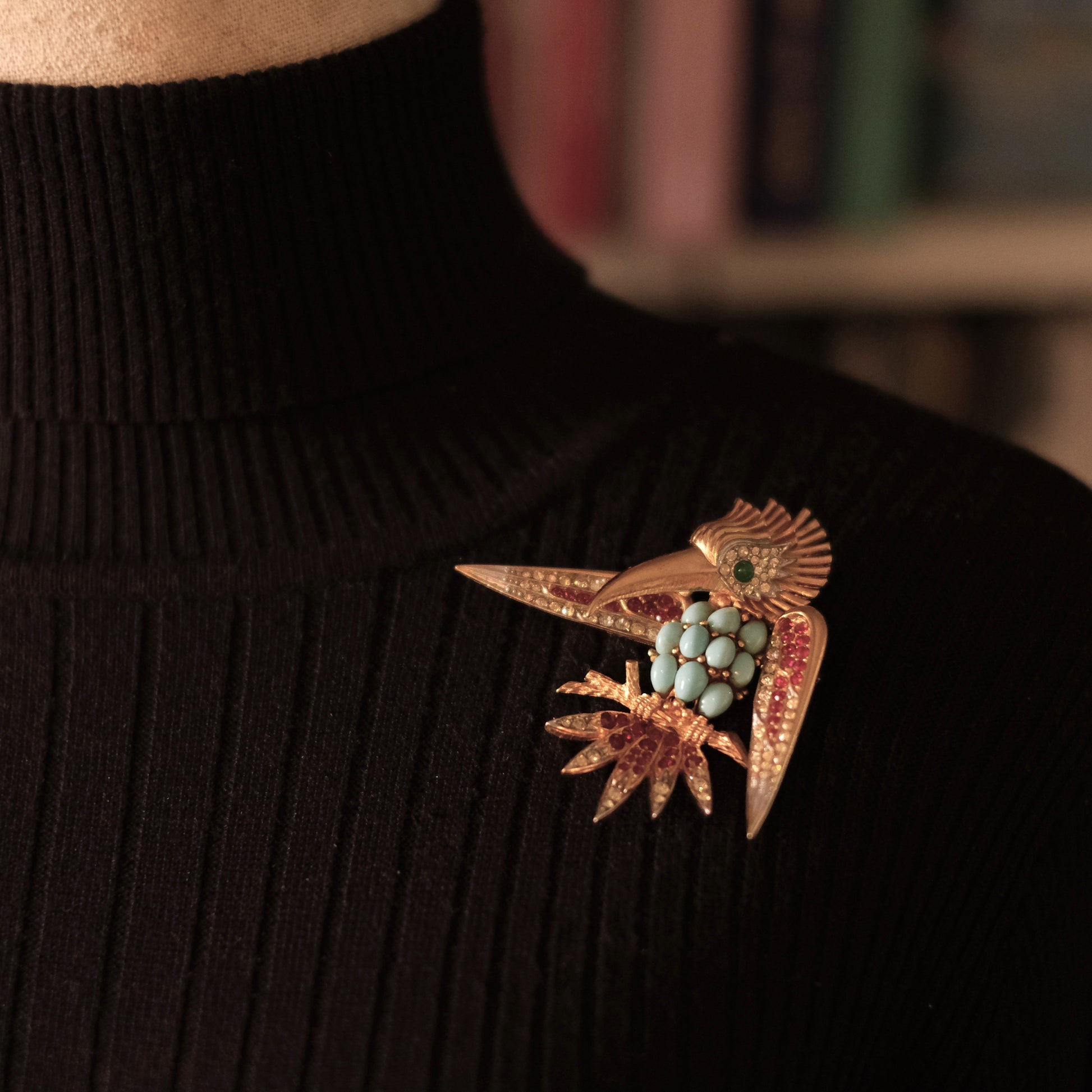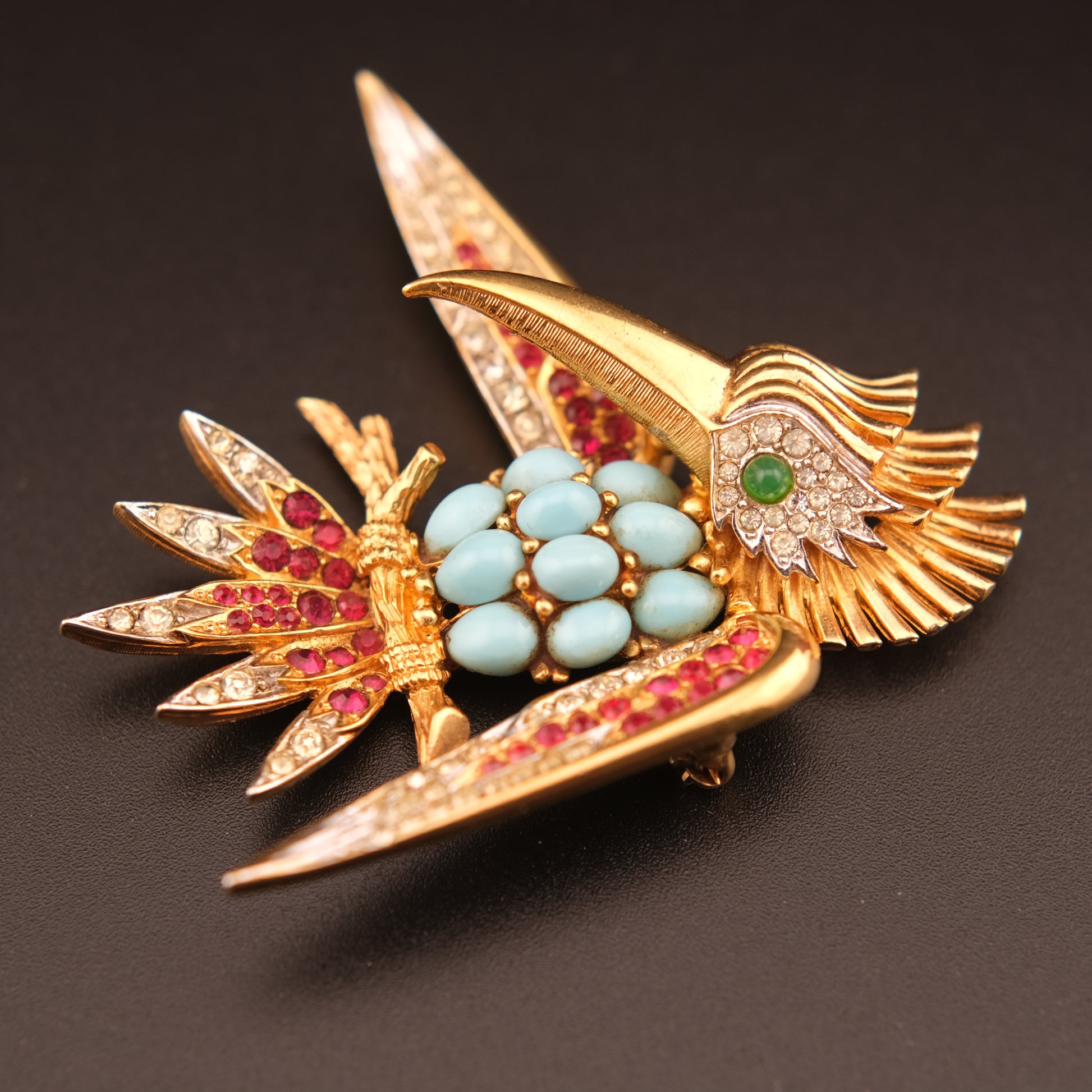 Vintage Boucher Bird Brooch with Turquoise Cabochons, Ruby & Crystal Accents