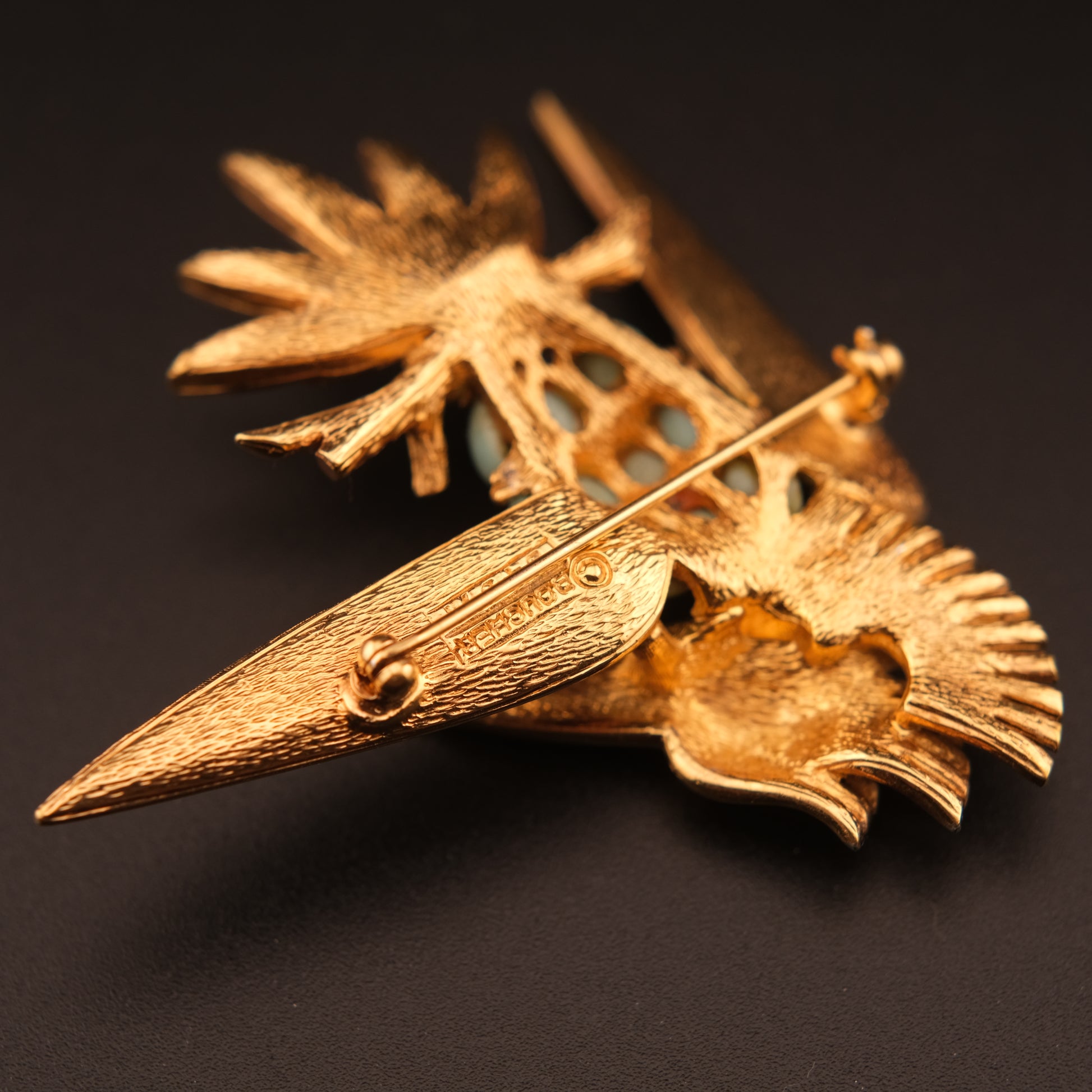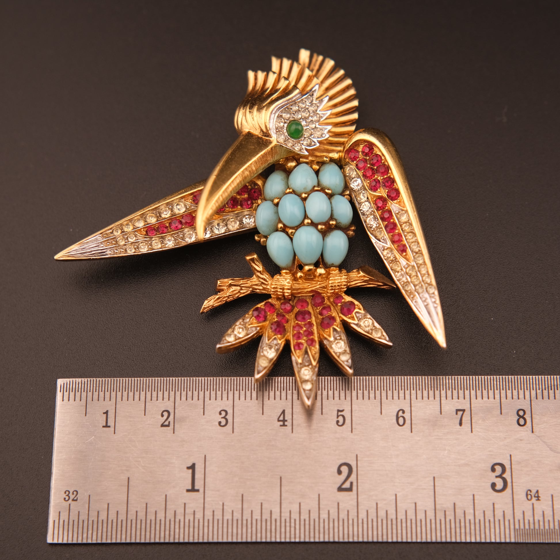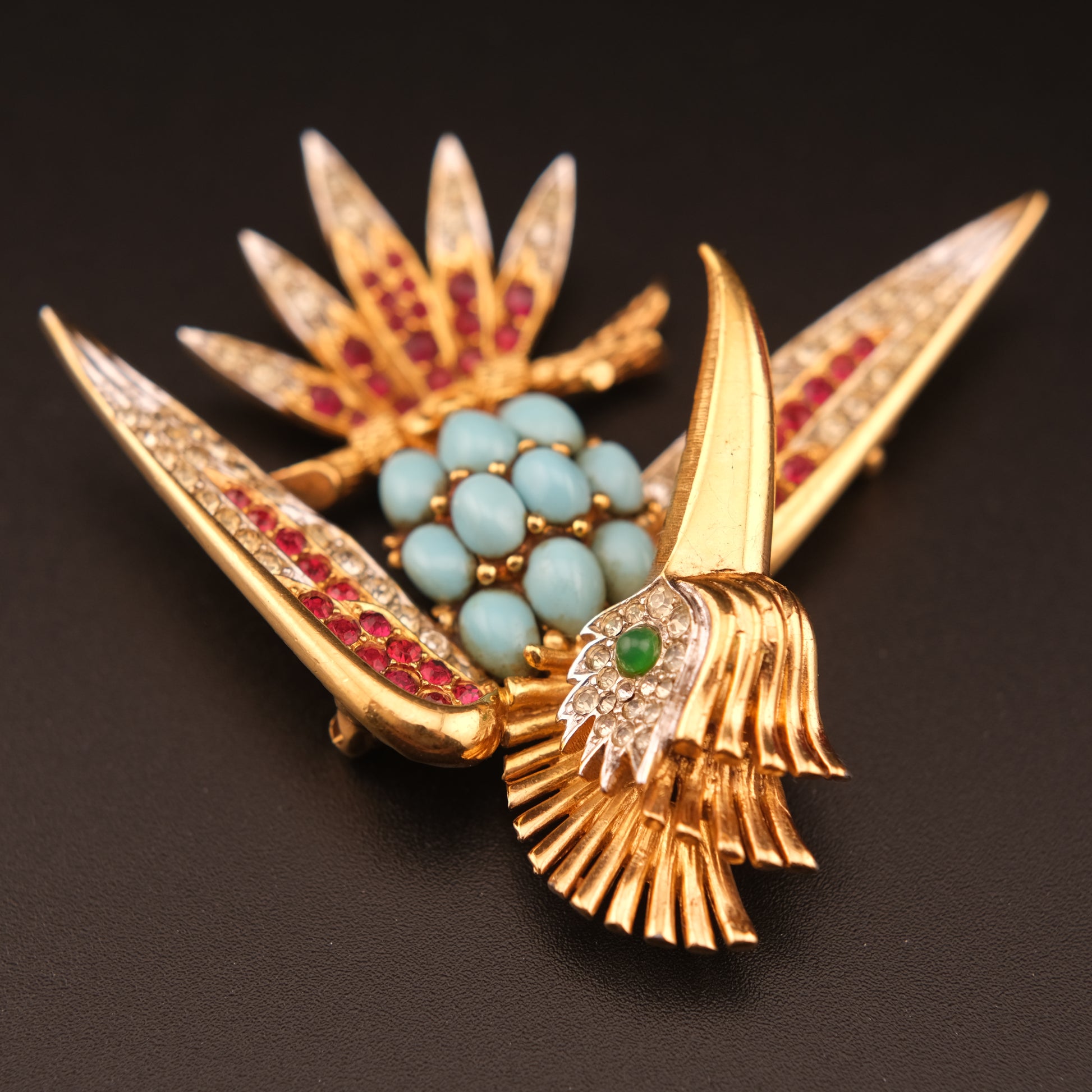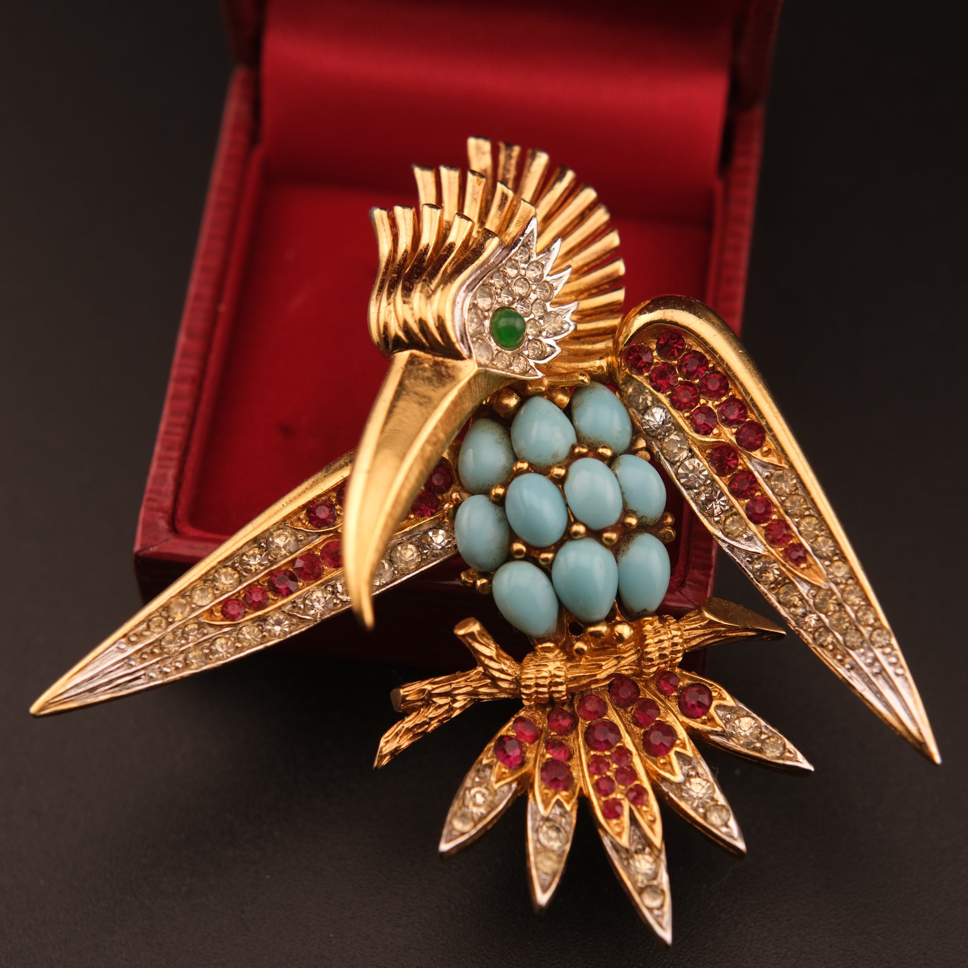 This striking vintage brooch by Marcel Boucher showcases the designer’s mastery of bold and intricate jewelry design. Shaped as an exotic bird perched with wings spread, the piece is set in a rich gold-tone finish, accented with brilliant crystal rhinestones and deep ruby-colored stones along the wings and tail. The body is decorated with oval turquoise glass cabochons, while the eye sparkles with a single green accent stone. Measuring approximately 3 inches, this brooch captures the glamour and attention to detail that make Boucher jewelry highly collectible.