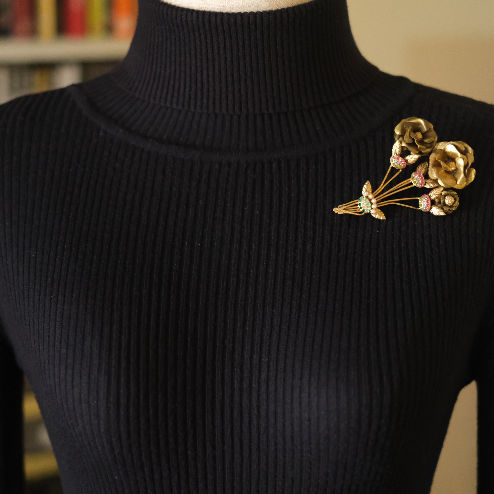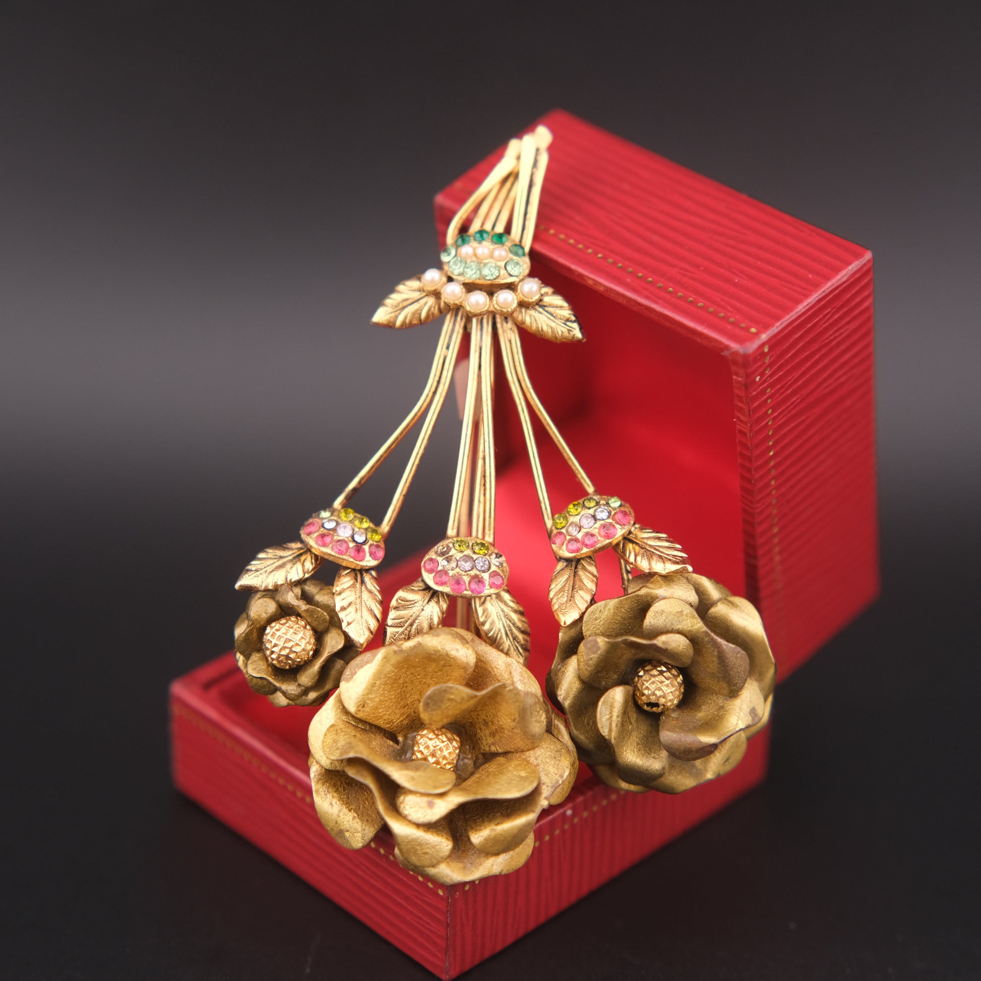 Bring timeless elegance to your collection with this vintage brass brooch, beautifully crafted in the form of a floral bouquet. The brooch features three dimensional roses with textured petals, accented with vibrant rhinestones in shades of pink and green, and delicate faux pearls. The stems and leaves are finely detailed, giving it a graceful, lifelike appearance.