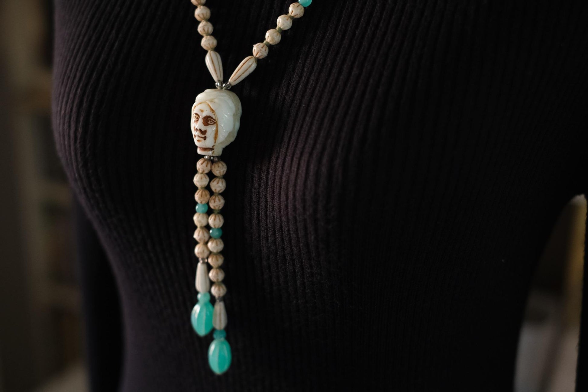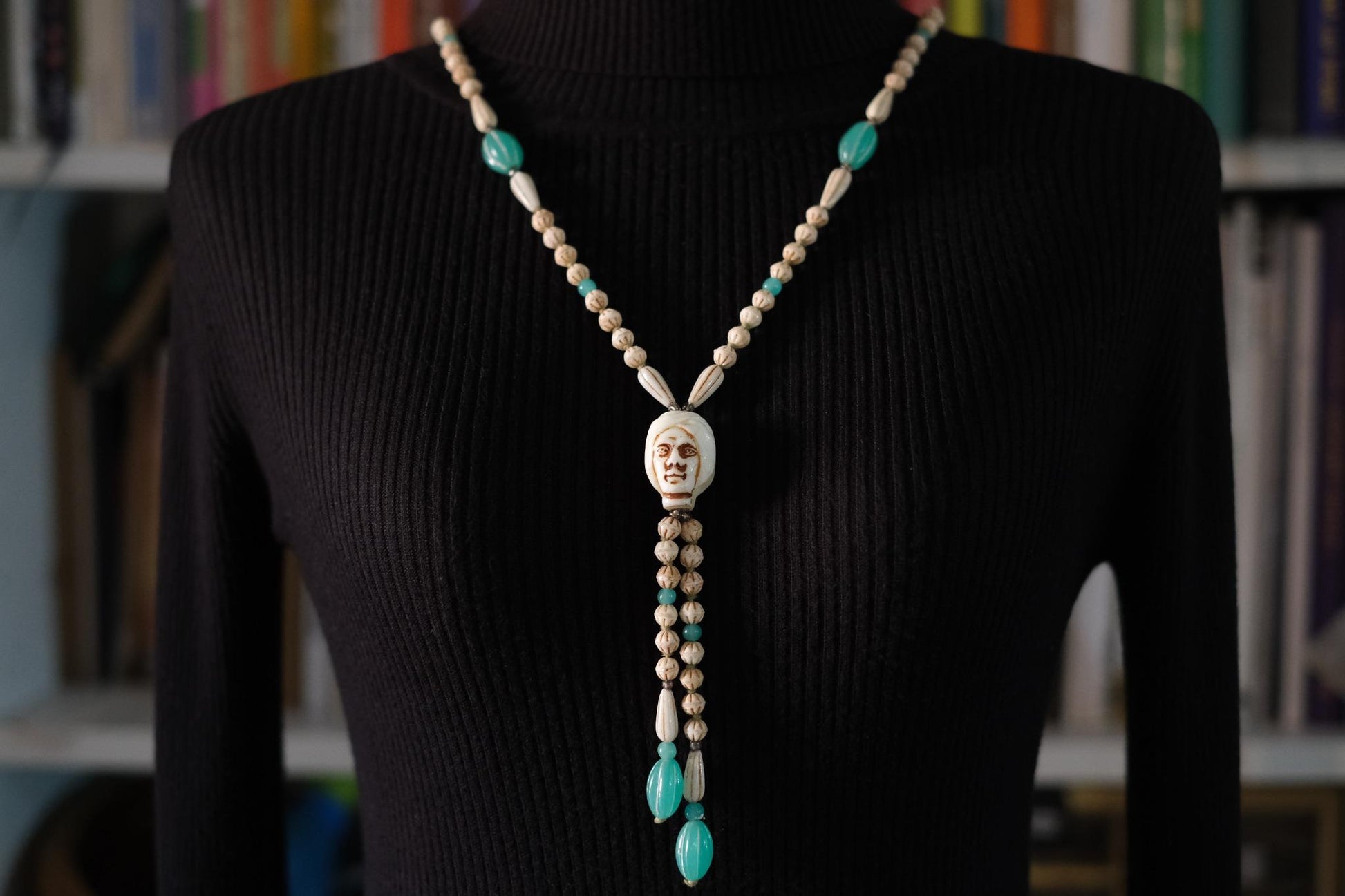 Add a captivating and earthy charm to your collection with this striking vintage beaded necklace. Featuring an intricately carved face bead as its focal point, the design is enhanced by a harmonious mix of cream-colored, carved beads and smooth turquoise-green accent beads. The necklace's tribal-inspired character, organic textures, and hand-finished detailing make it a standout piece for statement jewelry lovers.
