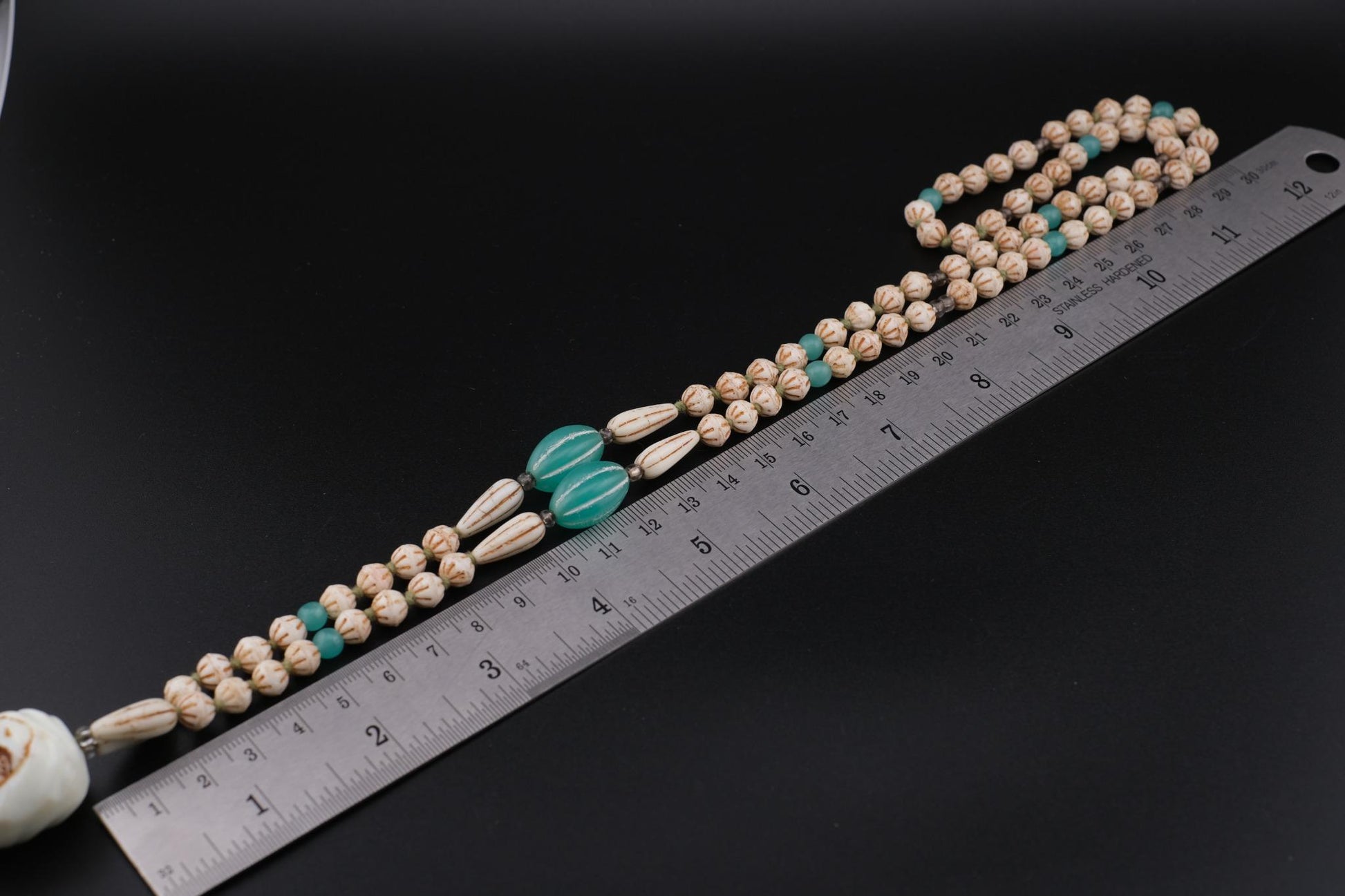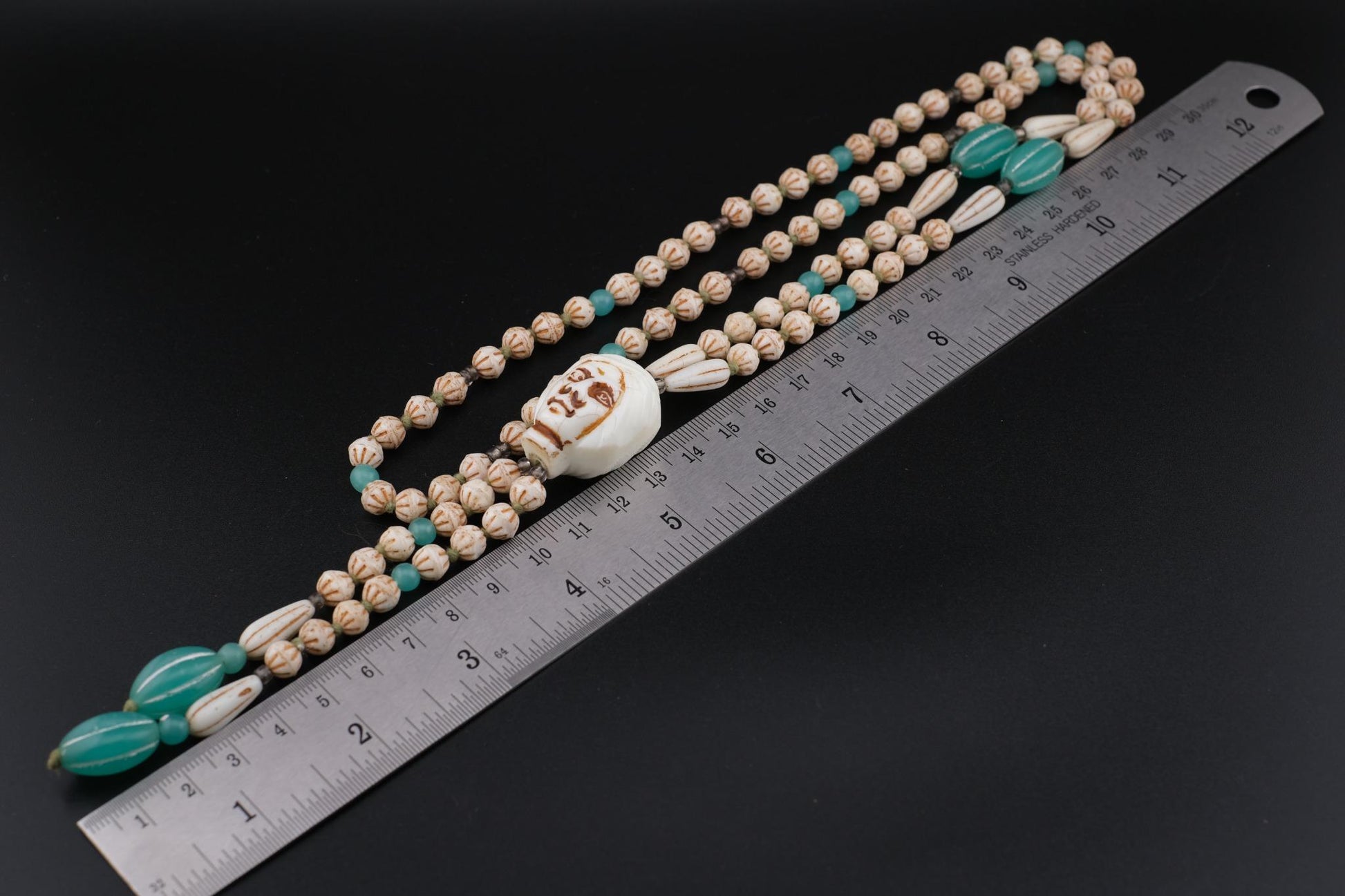 Pendant drop from face to bottom bead: approx. 5.5" - Condition: Excellent vintage condition with visible signs of age, particularly surface patina and natural wear on the carved areas. Minor crazing on the face bead adds to its antique charm.