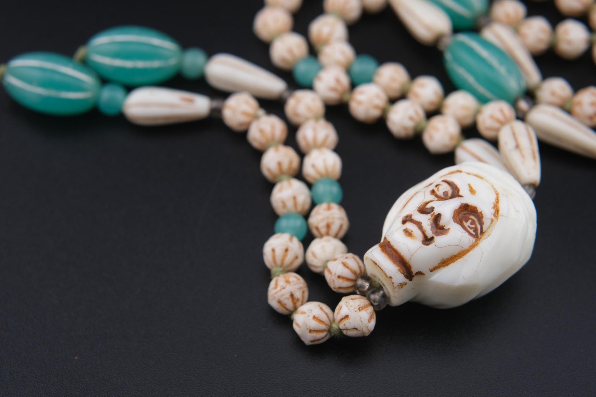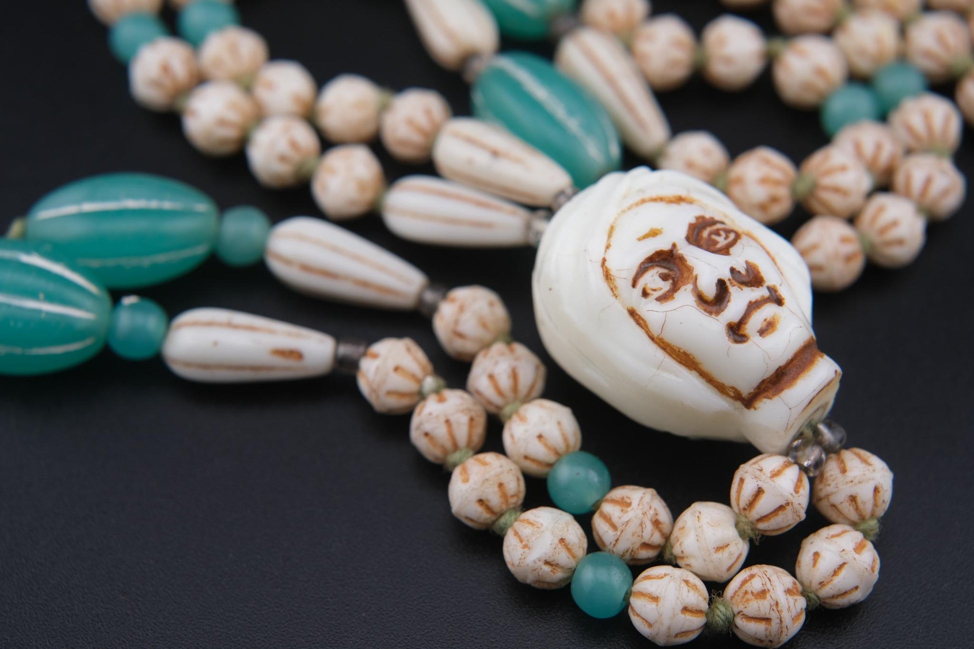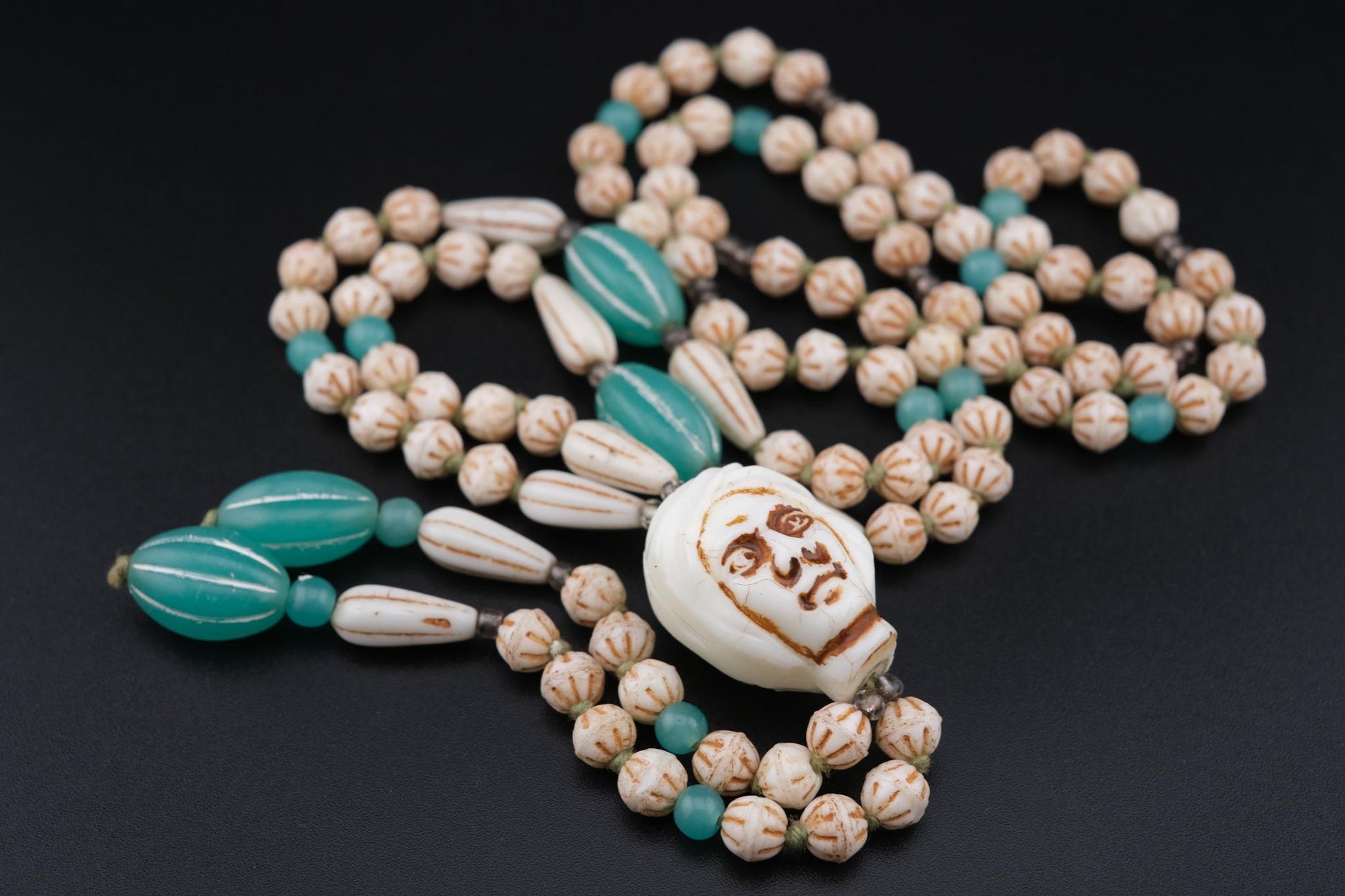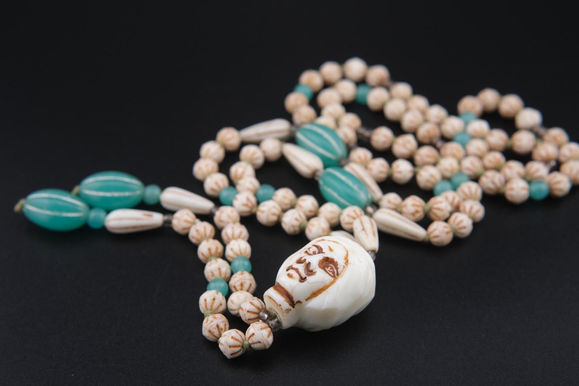 - Material: Likely hand-carved bone or resin centerpiece, paired with molded and painted beads (possibly wood, resin, or early plastic)