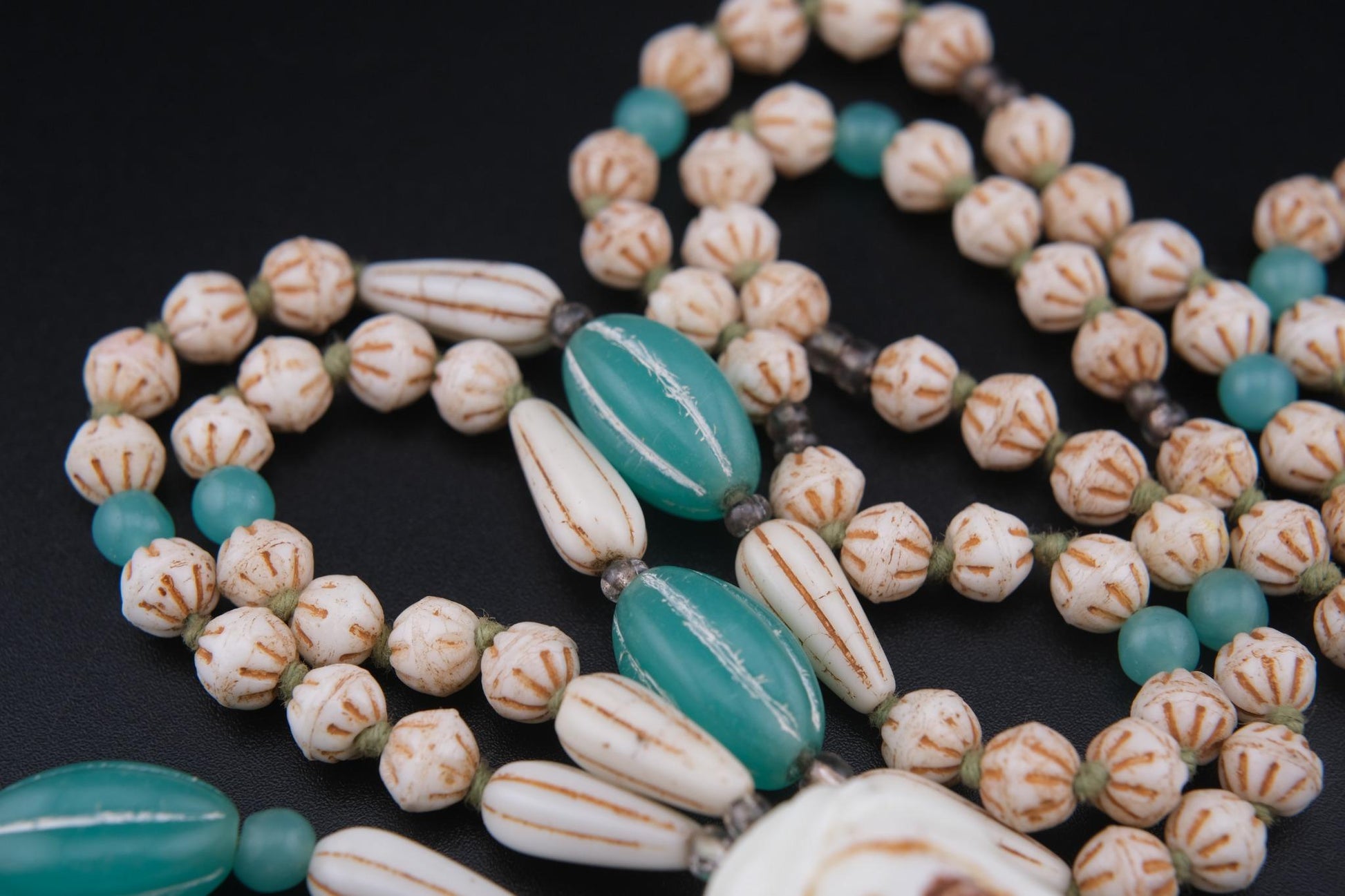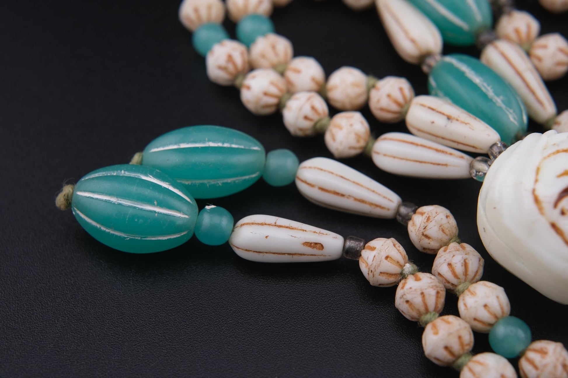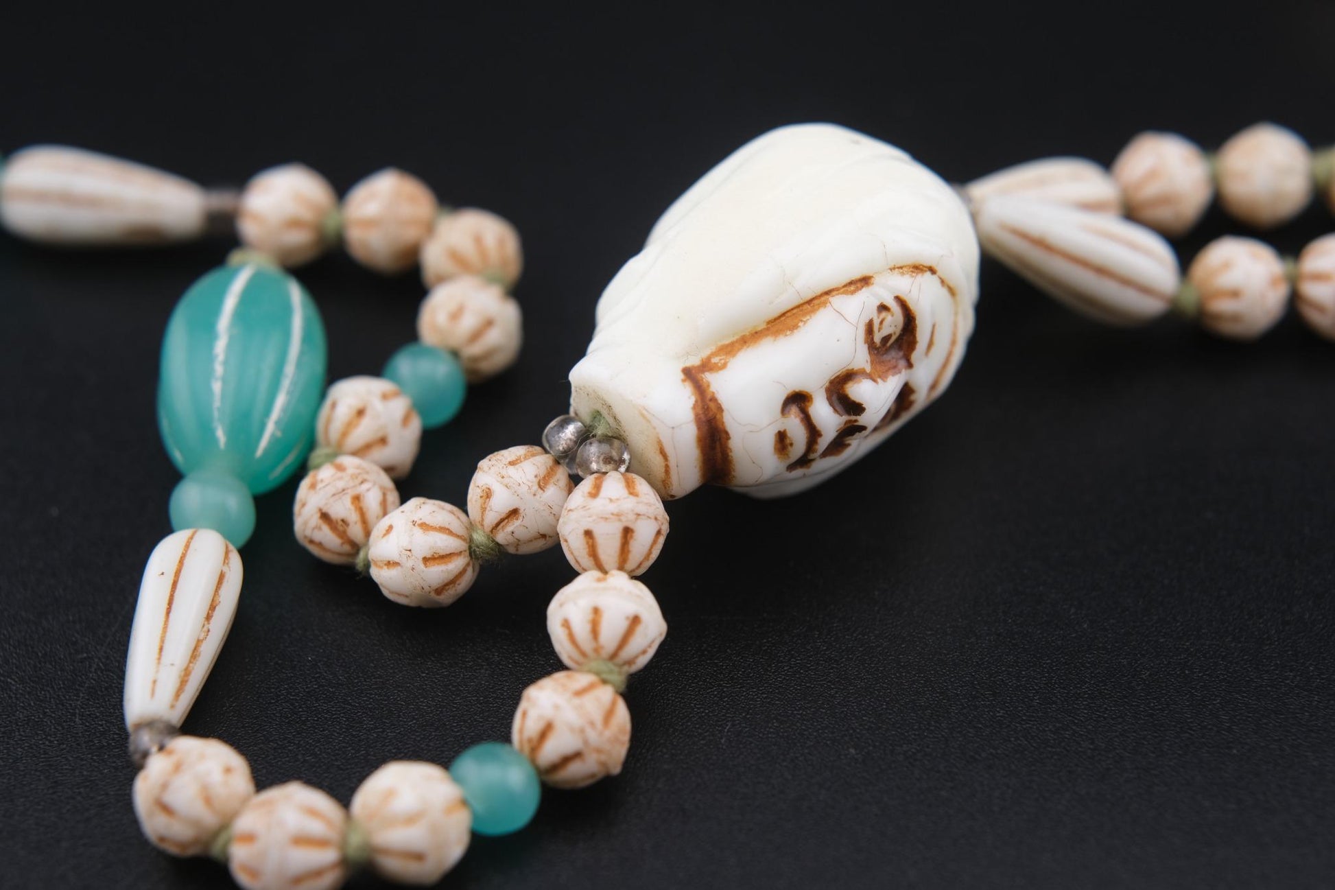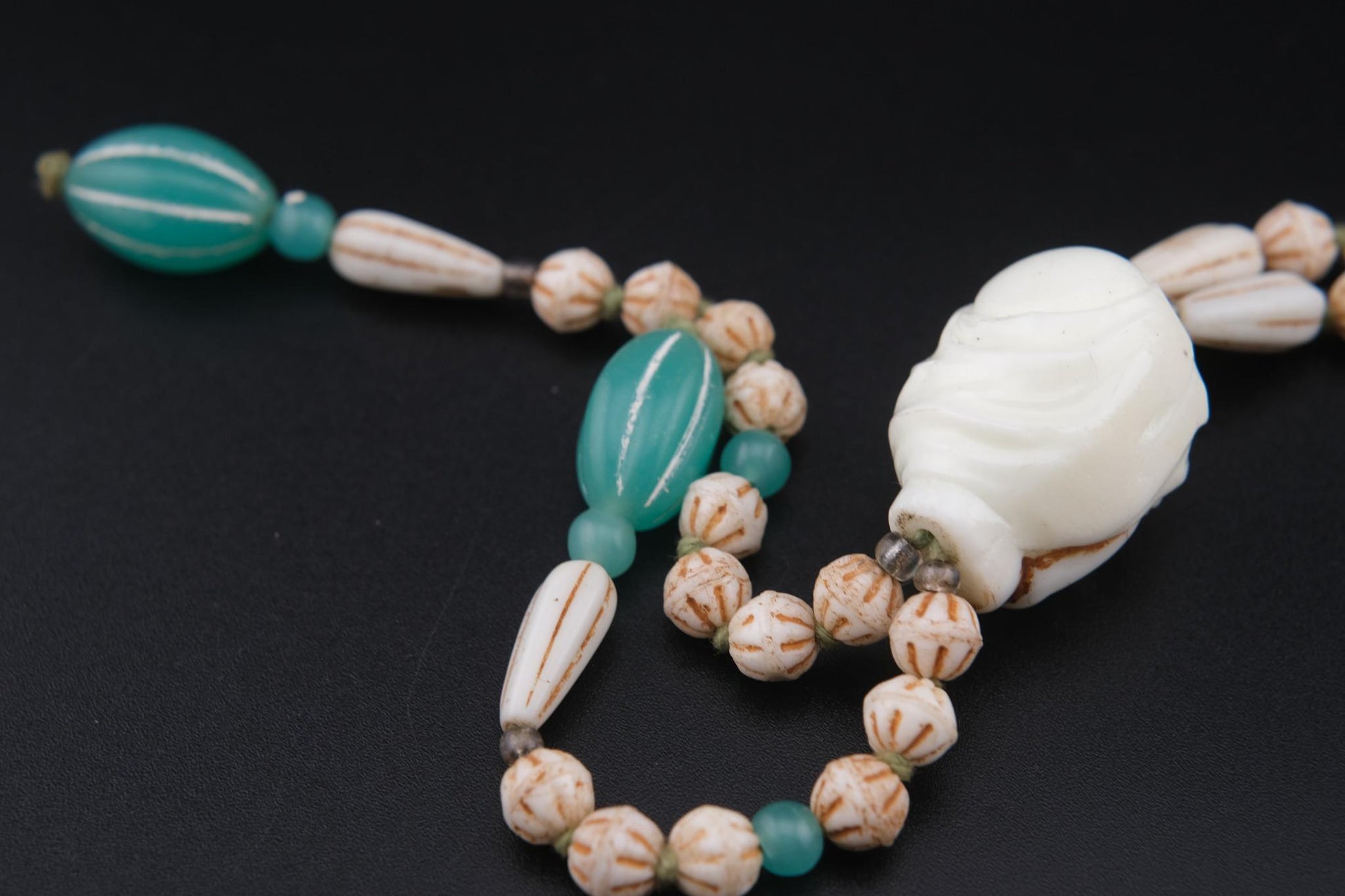 - Material: Likely hand-carved bone or resin centerpiece, paired with molded and painted beads (possibly wood, resin, or early plastic)