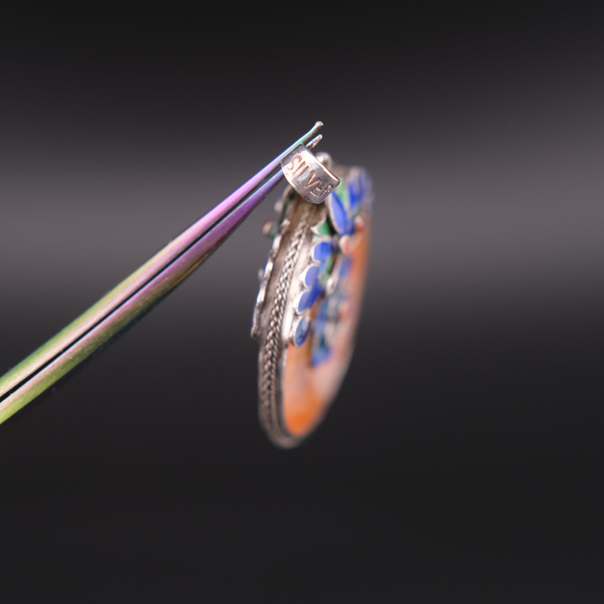 This charming vintage Chinese pendant features a warm carnelian disc beautifully accented with delicate blue and green enamel work. At the center blooms a floral motif, while a graceful butterfly rests above—both rendered in fine silver wire and translucent enamel, showcasing traditional Chinese decorative artistry.