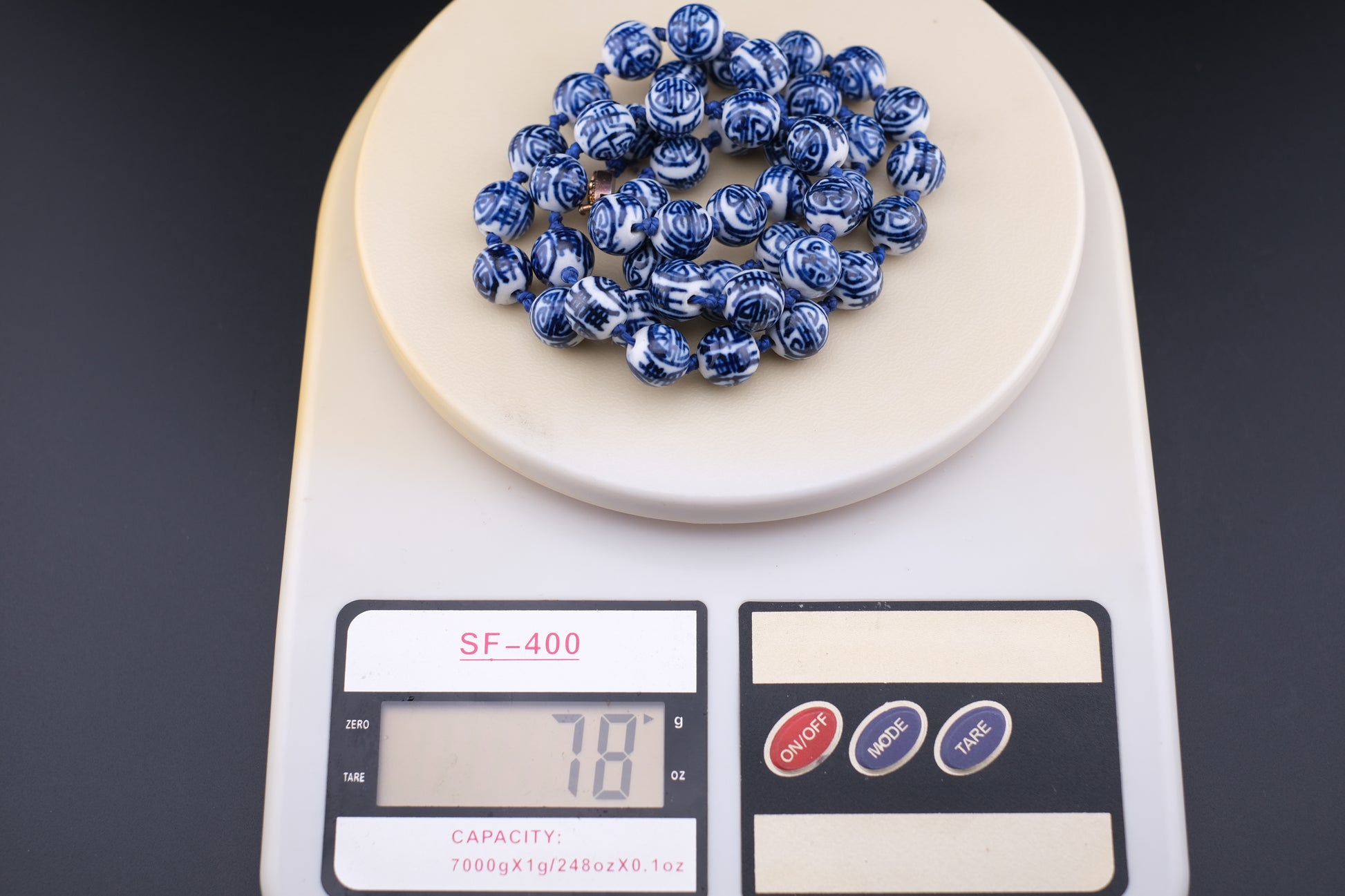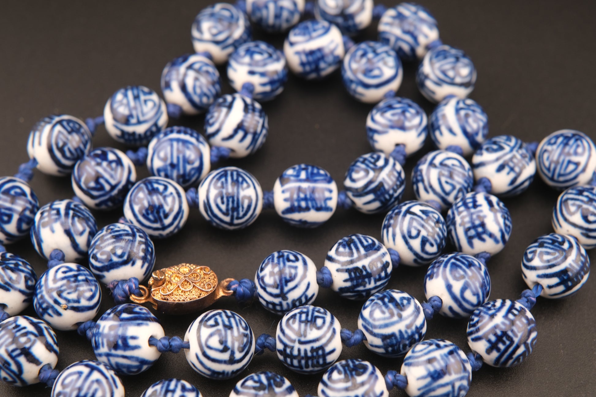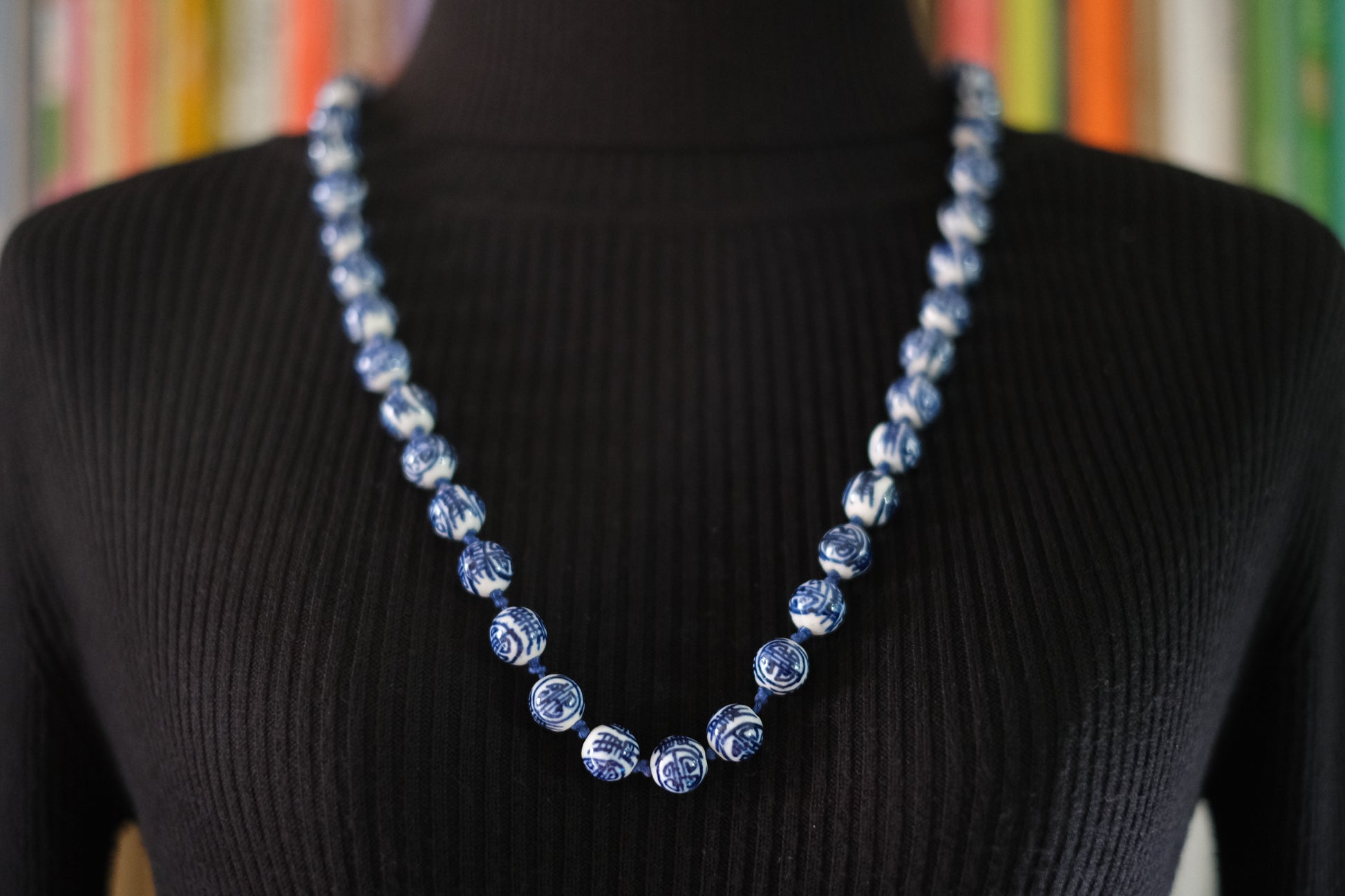 This vintage porcelain bead necklace brings timeless elegance to your collection. Featuring hand-painted cobalt blue floral and geometric motifs on crisp white porcelain beads, it reflects the artistry of traditional Chinese ceramics. The beads are hand-knotted on blue cord and finished with a decorative round clasp, making it both durable and stylish.
