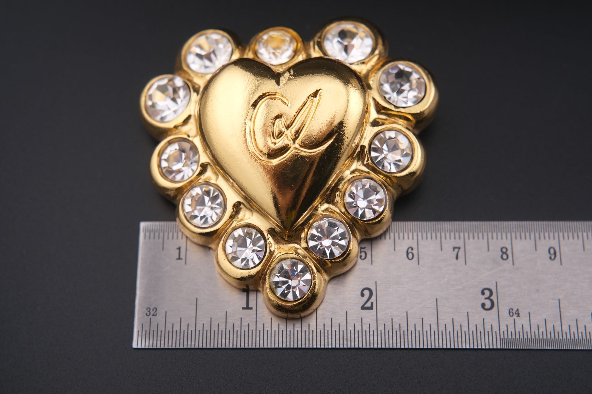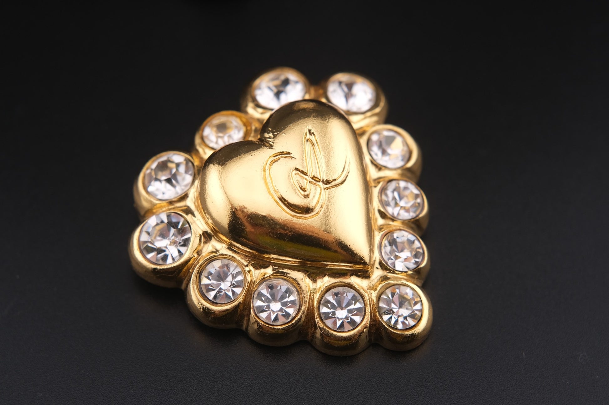 Celebrate the bold glamour of Parisian couture with this striking vintage brooch by Christian Lacroix. Shaped as a dramatic heart, the piece features a raised center with Lacroix’s signature monogram, surrounded by a radiant border of bezel-set clear crystals. Finished in a luxurious gilt plated material, the brooch has an eye-catching golden sheen —a hallmark of Lacroix’s statement jewelry from the 1980s–90s.