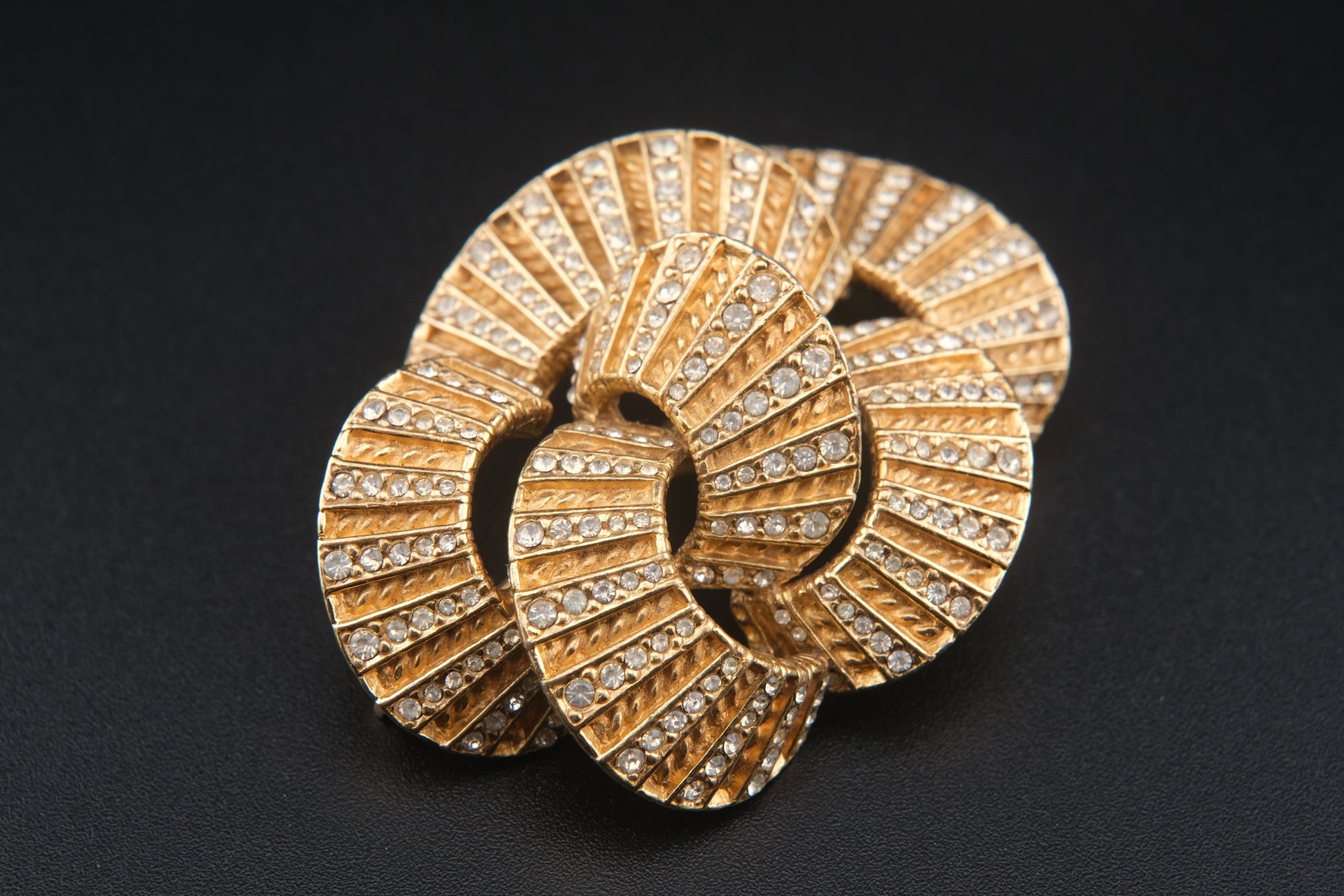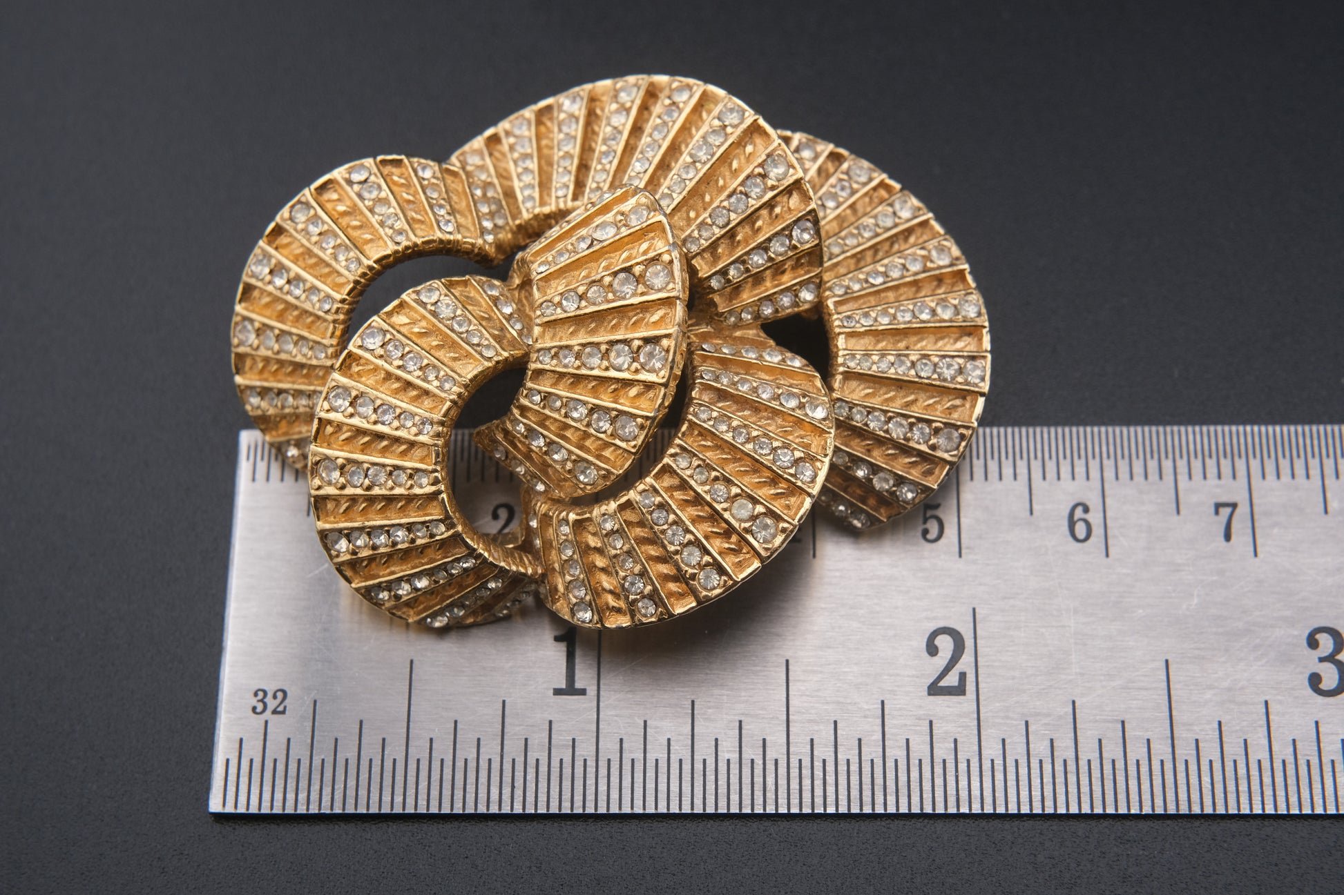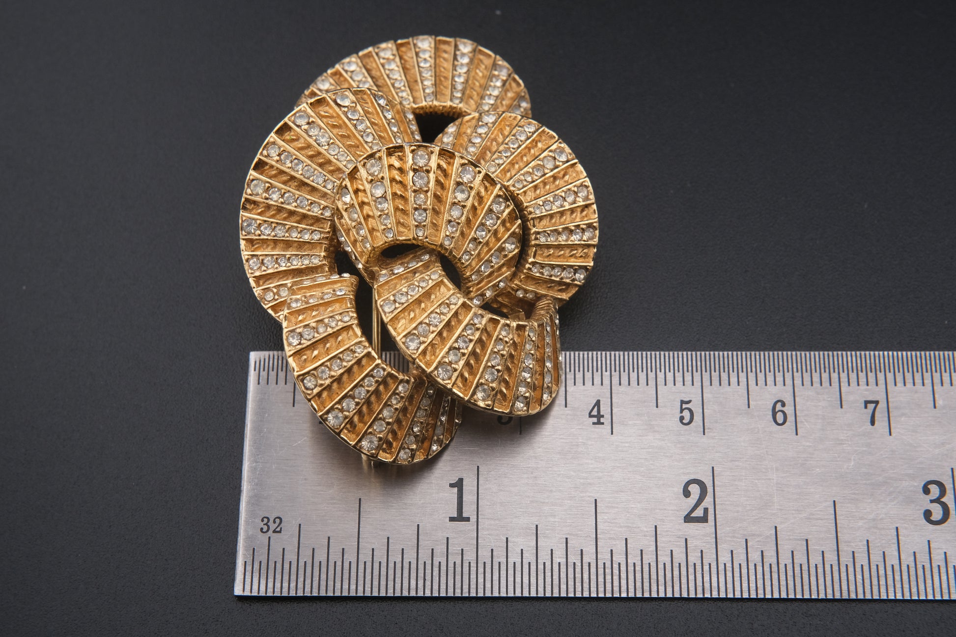 Elevate your jewelry collection with this dazzling vintage brooch from Ciner, renowned for its luxurious costume jewelry since the early 20th century. This statement piece showcases an elegant interlocking loop motif, richly finished in gold-tone metal and adorned with brilliant clear rhinestones. The textured ridges and layered structure give it a sculptural, glamorous feel—perfect for a cocktail ensemble or a refined everyday look.