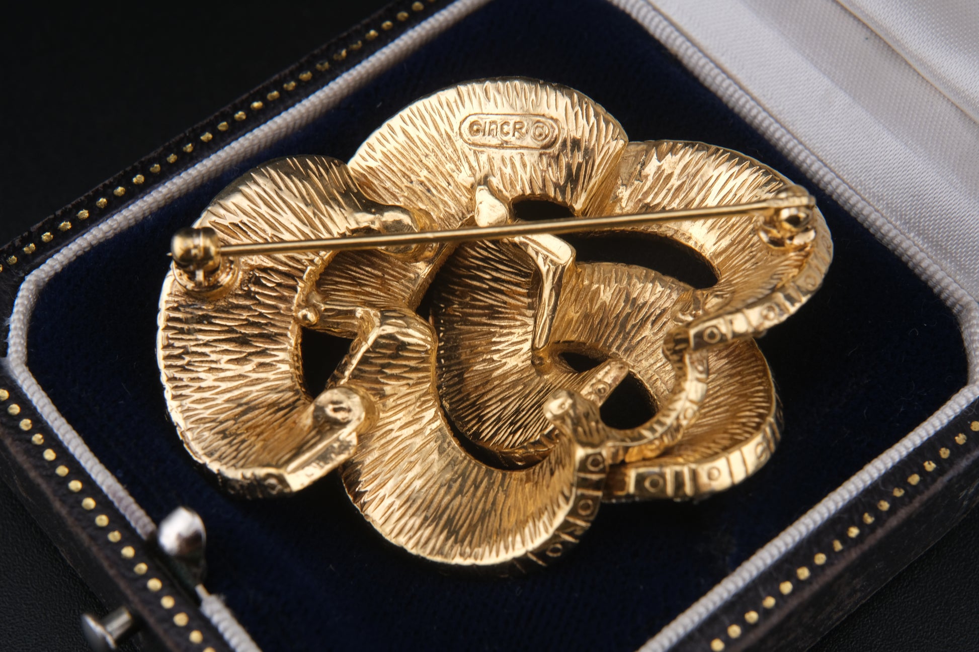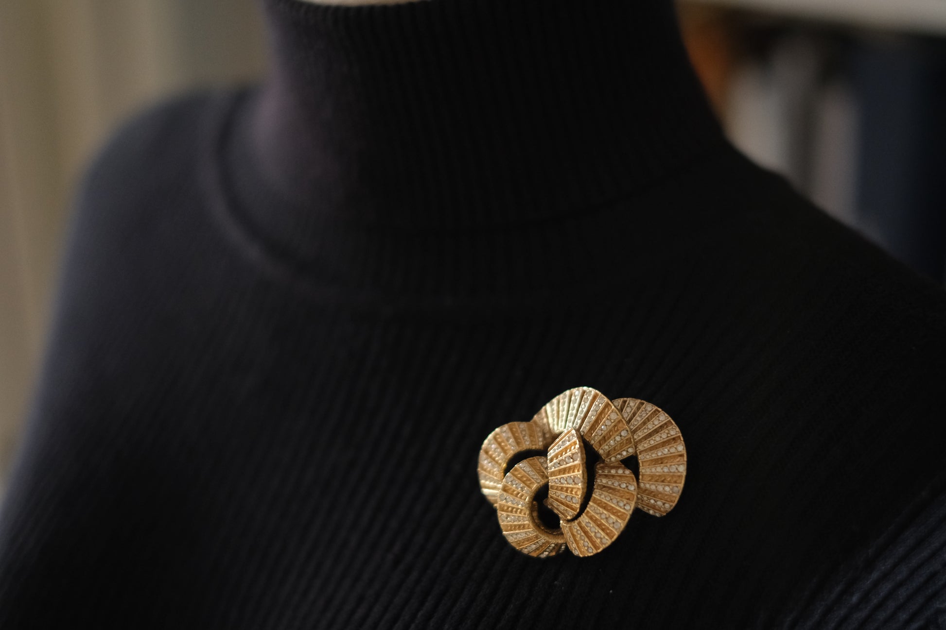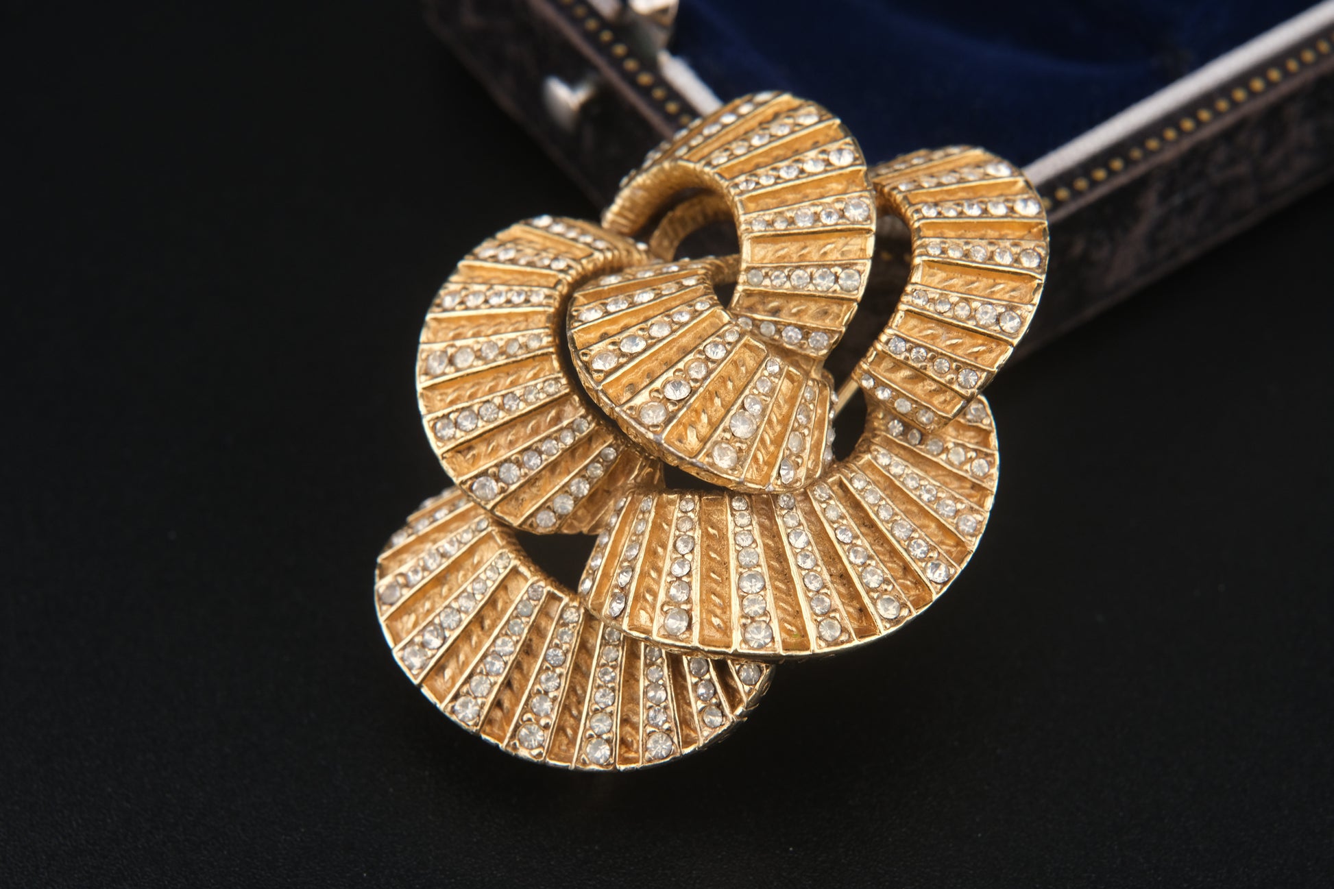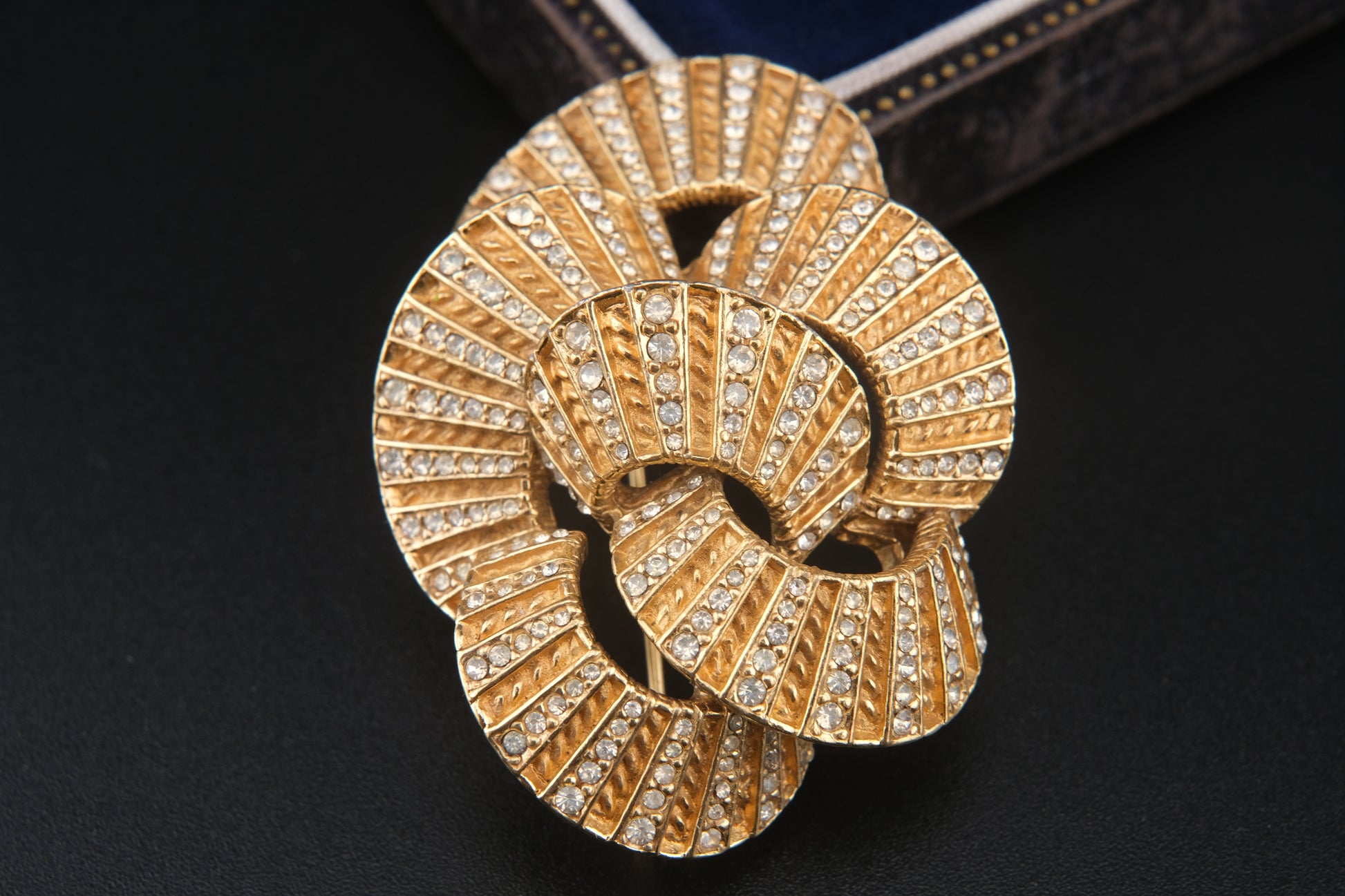 Elevate your jewelry collection with this dazzling vintage brooch from Ciner, renowned for its luxurious costume jewelry since the early 20th century. This statement piece showcases an elegant interlocking loop motif, richly finished in gold-tone metal and adorned with brilliant clear rhinestones. The textured ridges and layered structure give it a sculptural, glamorous feel—perfect for a cocktail ensemble or a refined everyday look.