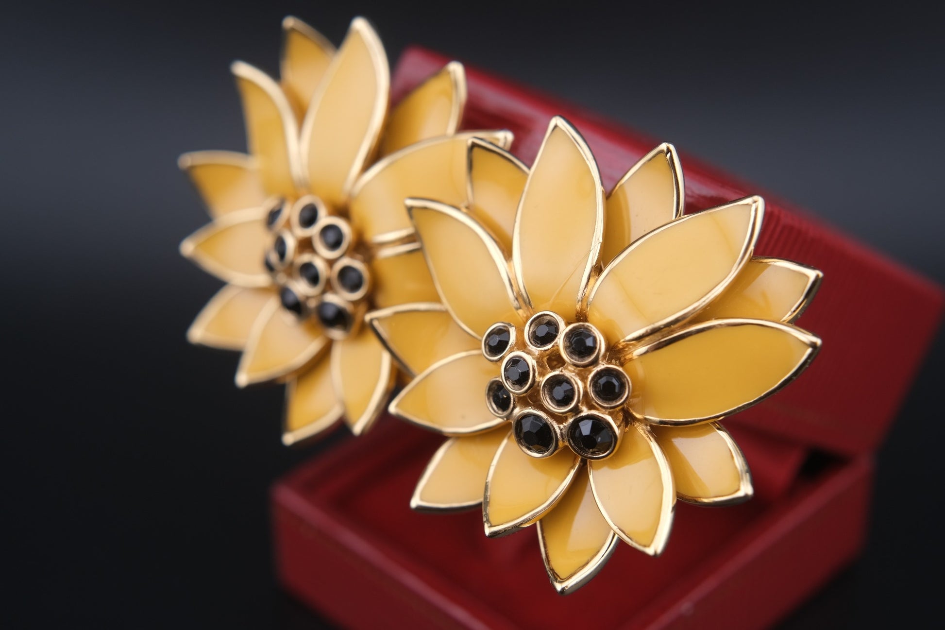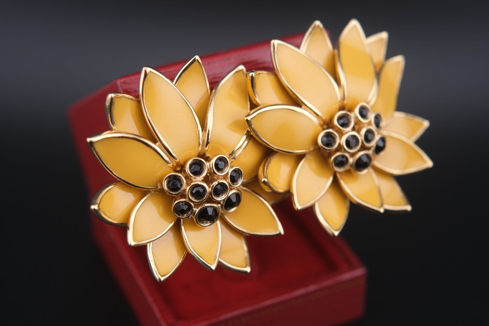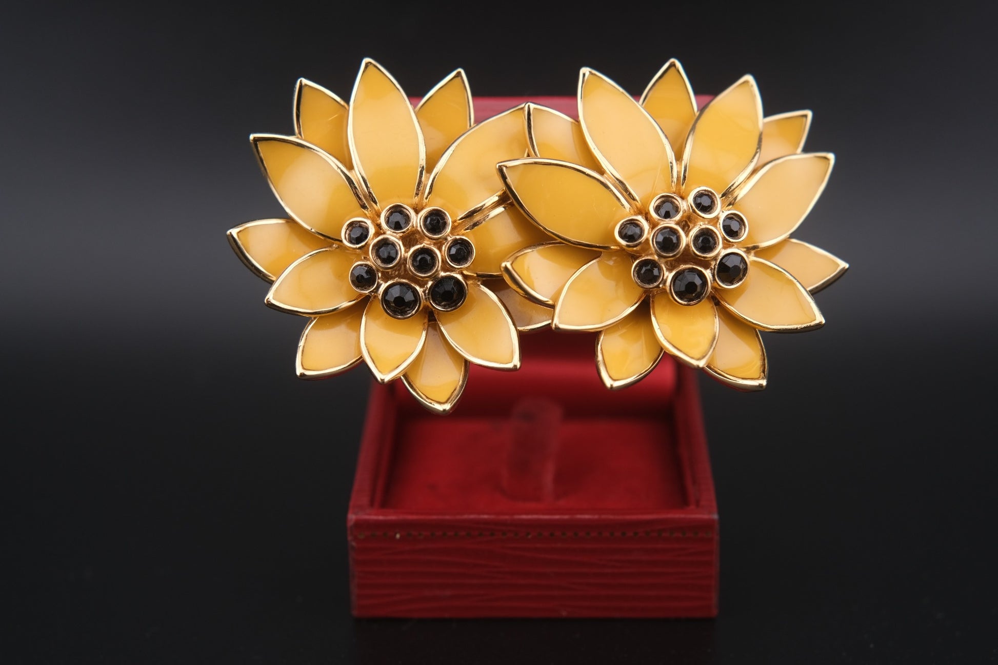Make a bold yet elegant statement with these vintage floral earrings by CINER. Each clip-on earring showcases warm golden yellow enamel petals outlined in polished gold-tone metal, framing a cluster of jet-black rhinestones at the center. The sculptural floral form, signature CINER craftsmanship, and rich textures make this pair a standout piece—perfect for vintage collectors and style lovers alike.