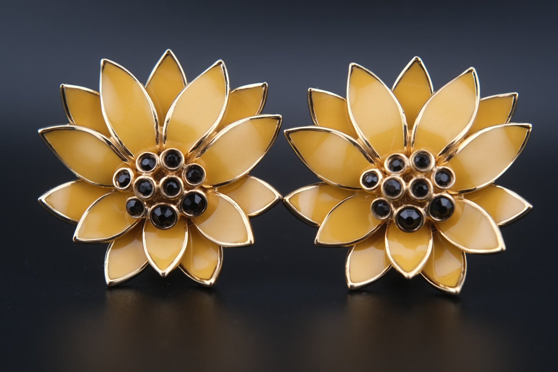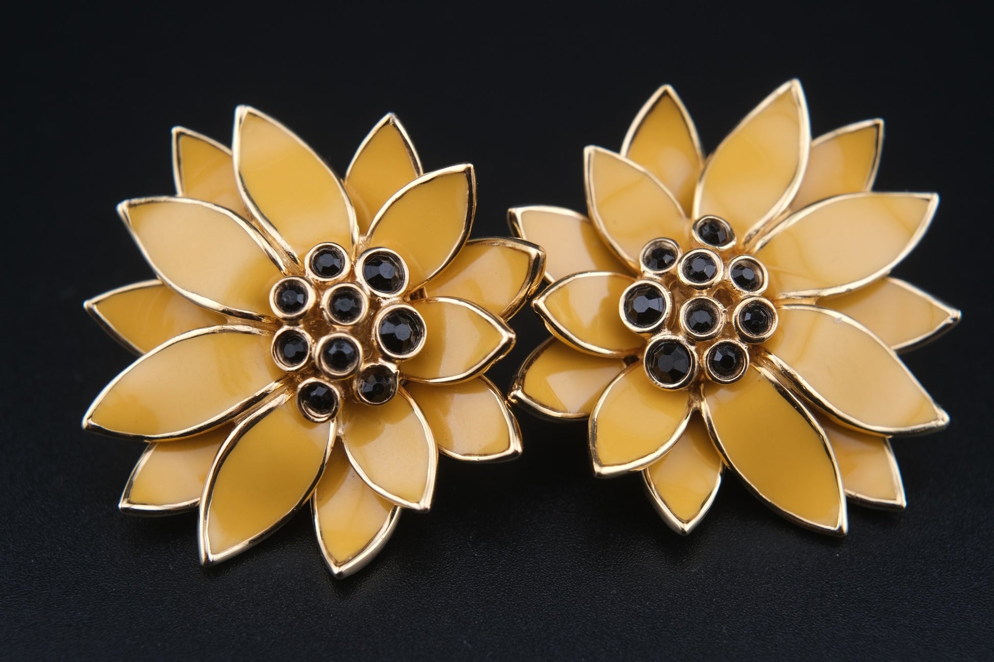 Vintage CINER Floral Clip-On Earrings – Gold-Tone with Golden Yellow Enamel and Black Rhinestones