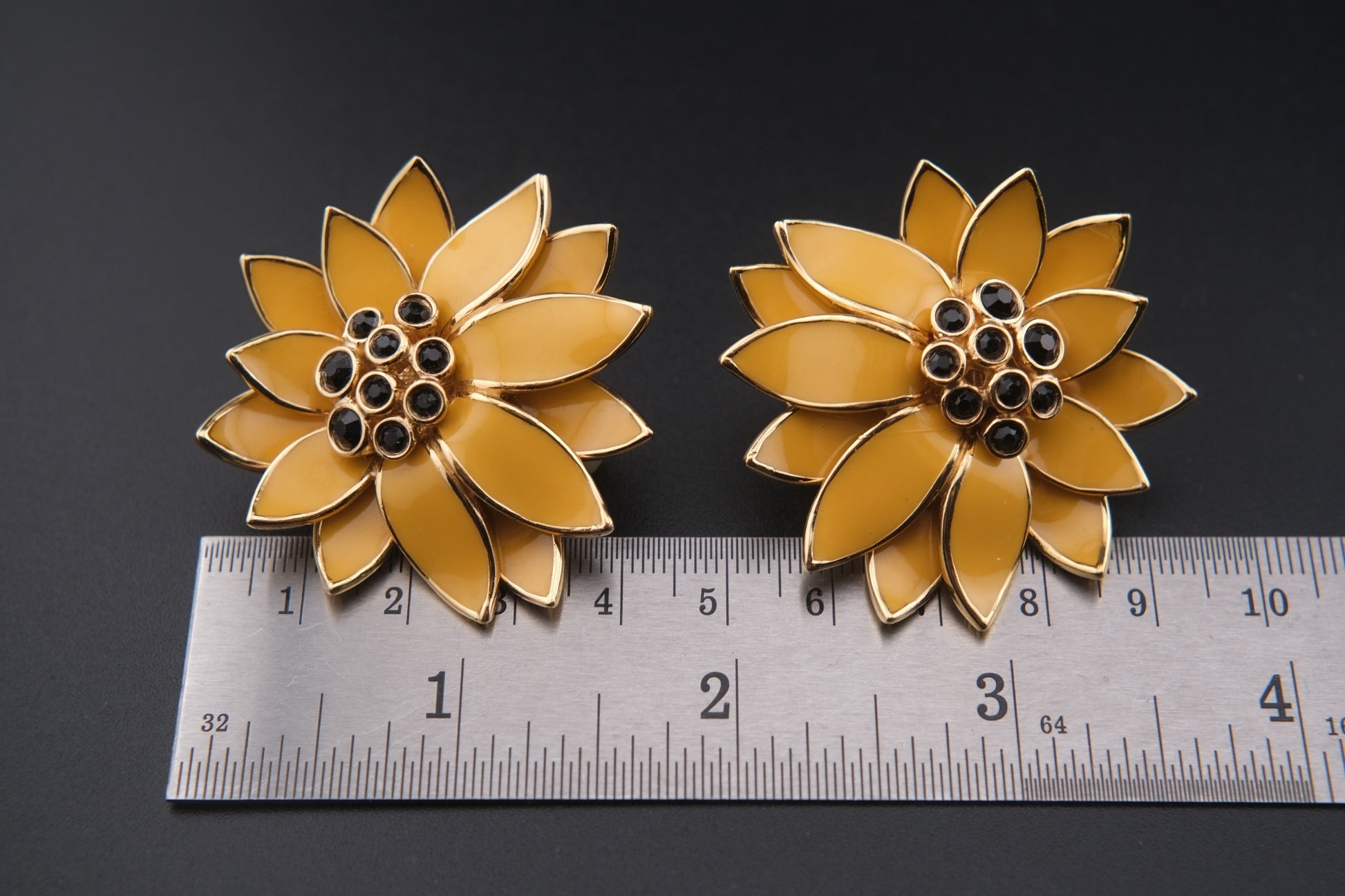 - Design: Bold floral motif with warm golden yellow enamel petals and black rhinestone centers