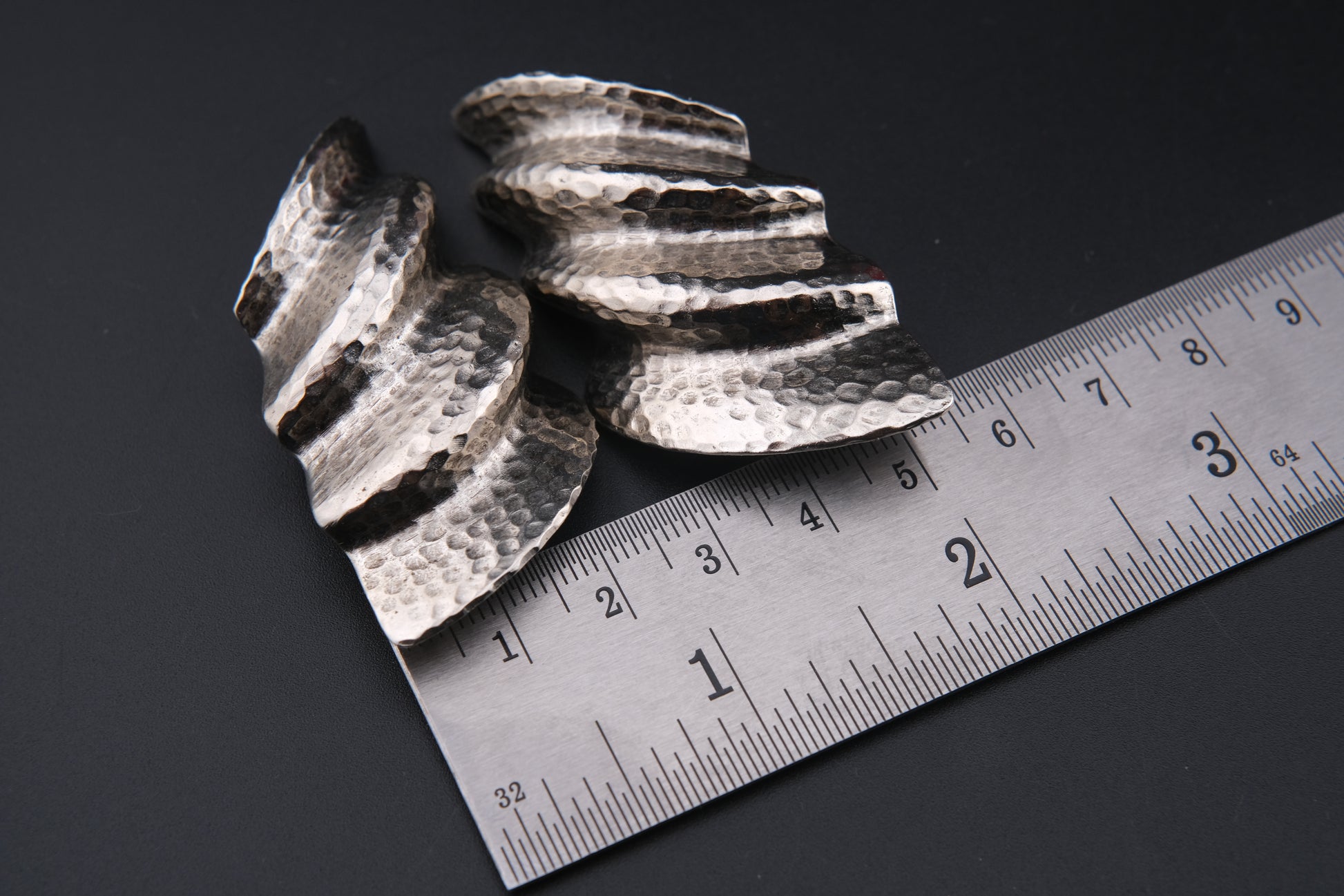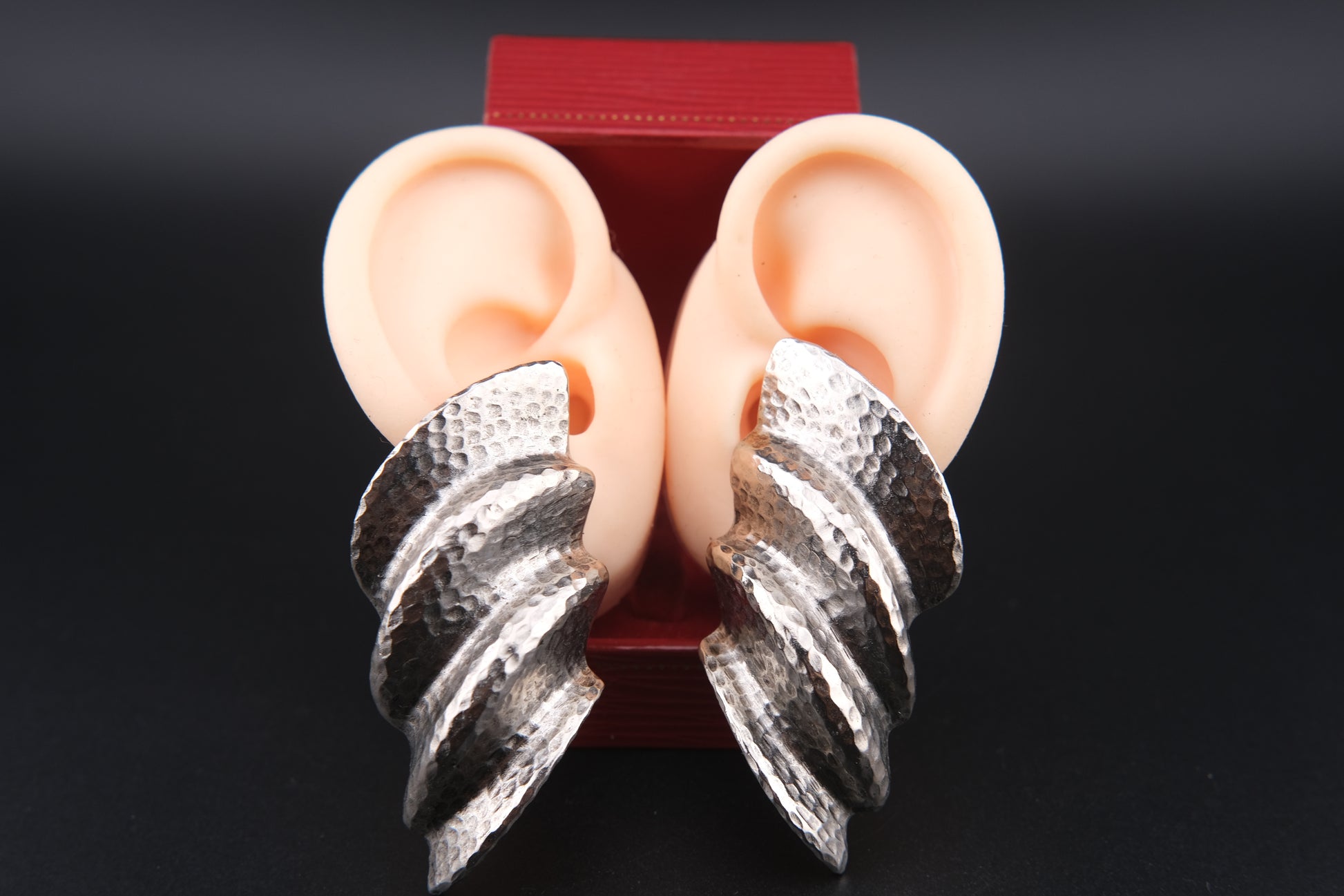 Step into the bold sculptural aesthetic of the 1980s with these statement clip-on earrings by Clara. Crafted in 1982, this striking pair showcases a hammered silver-tone finish with dynamic ridged swirls, giving them a dramatic, architectural appeal. Large and eye-catching, they are perfect for collectors of vintage designer jewelry and lovers of sculptural statement pieces.