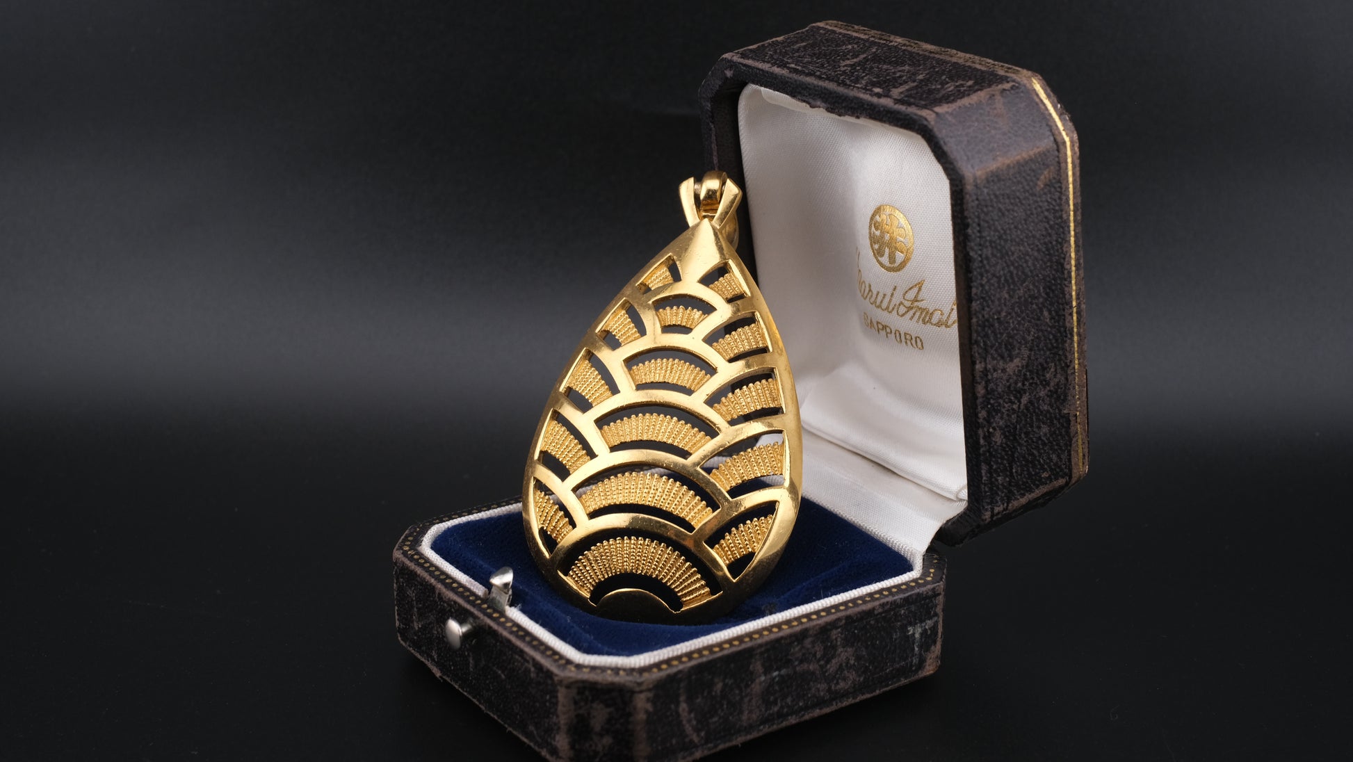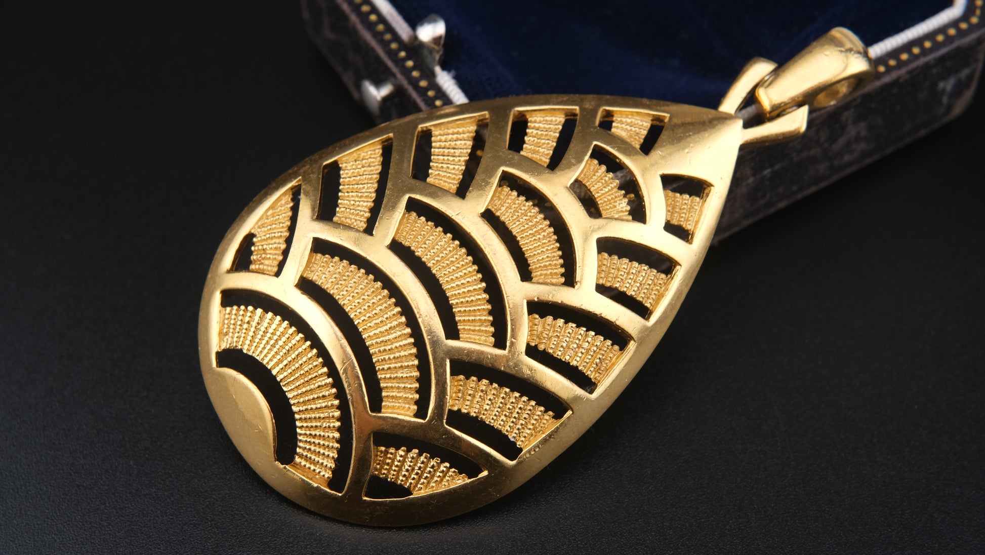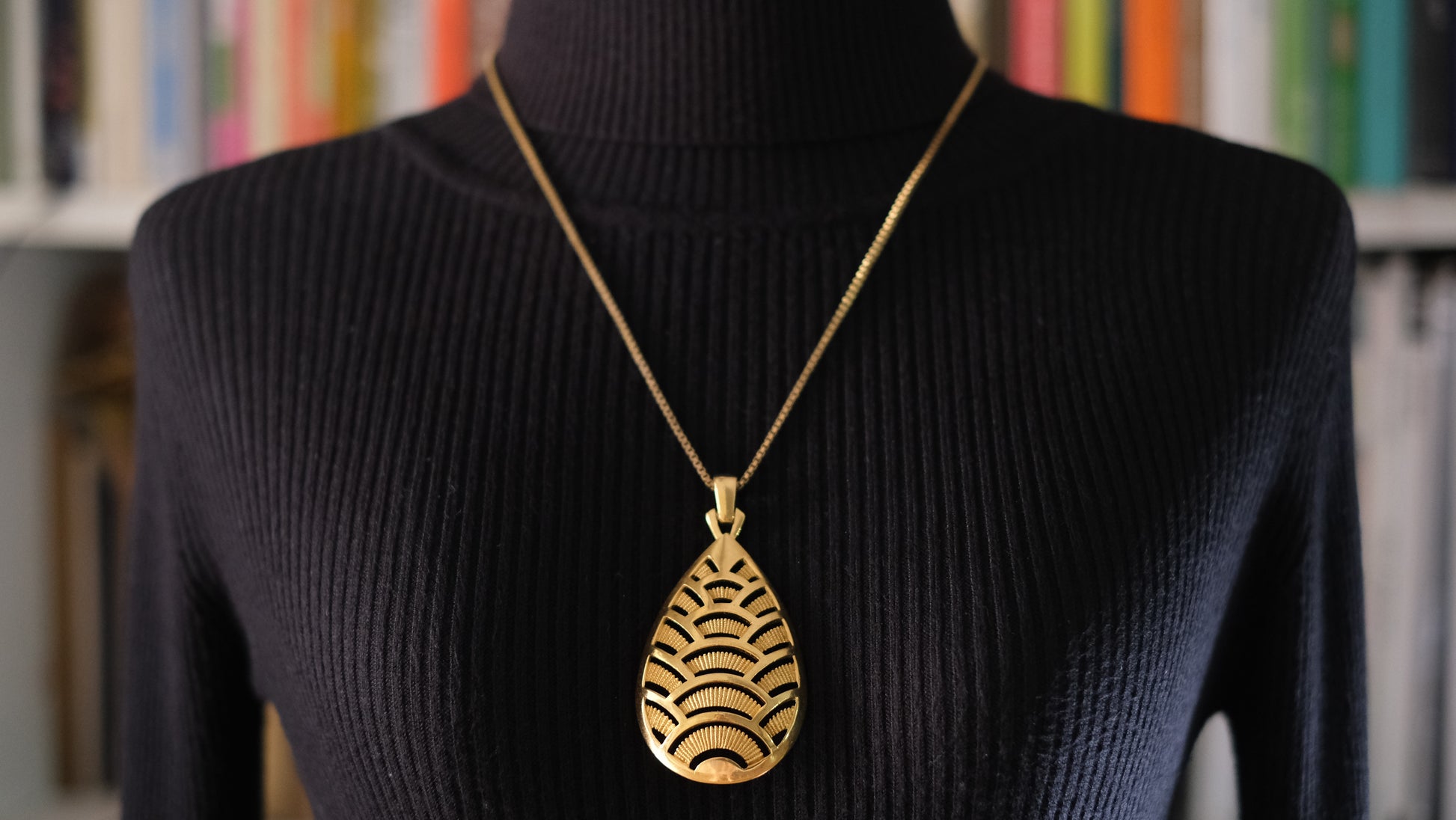 Add timeless elegance to your jewelry collection with this vintage Crown Trifari pendant from the 1960s. Featuring a dramatic teardrop shape with an intricately textured and openwork fan pattern, the design beautifully echoes the form of a traditional Chinese folding fan — a symbol of grace, culture, and movement.