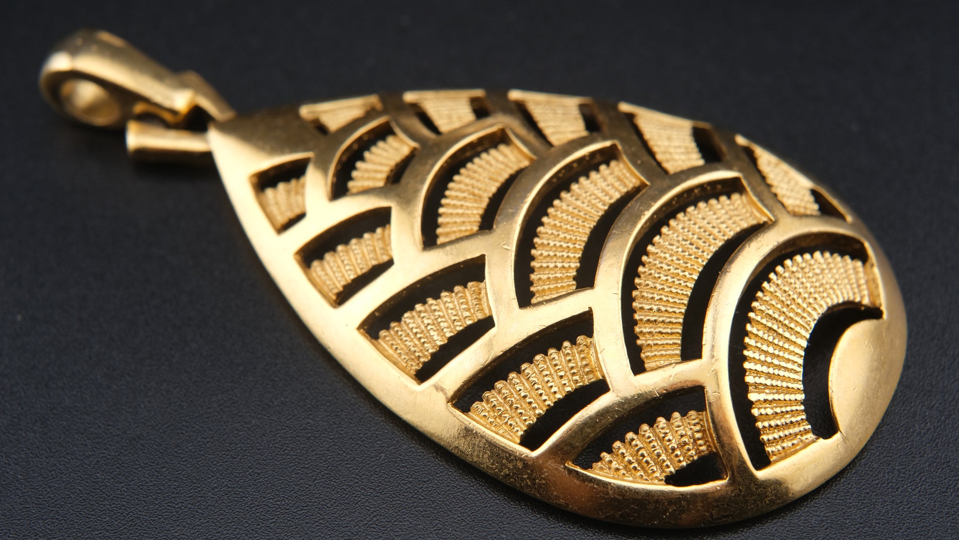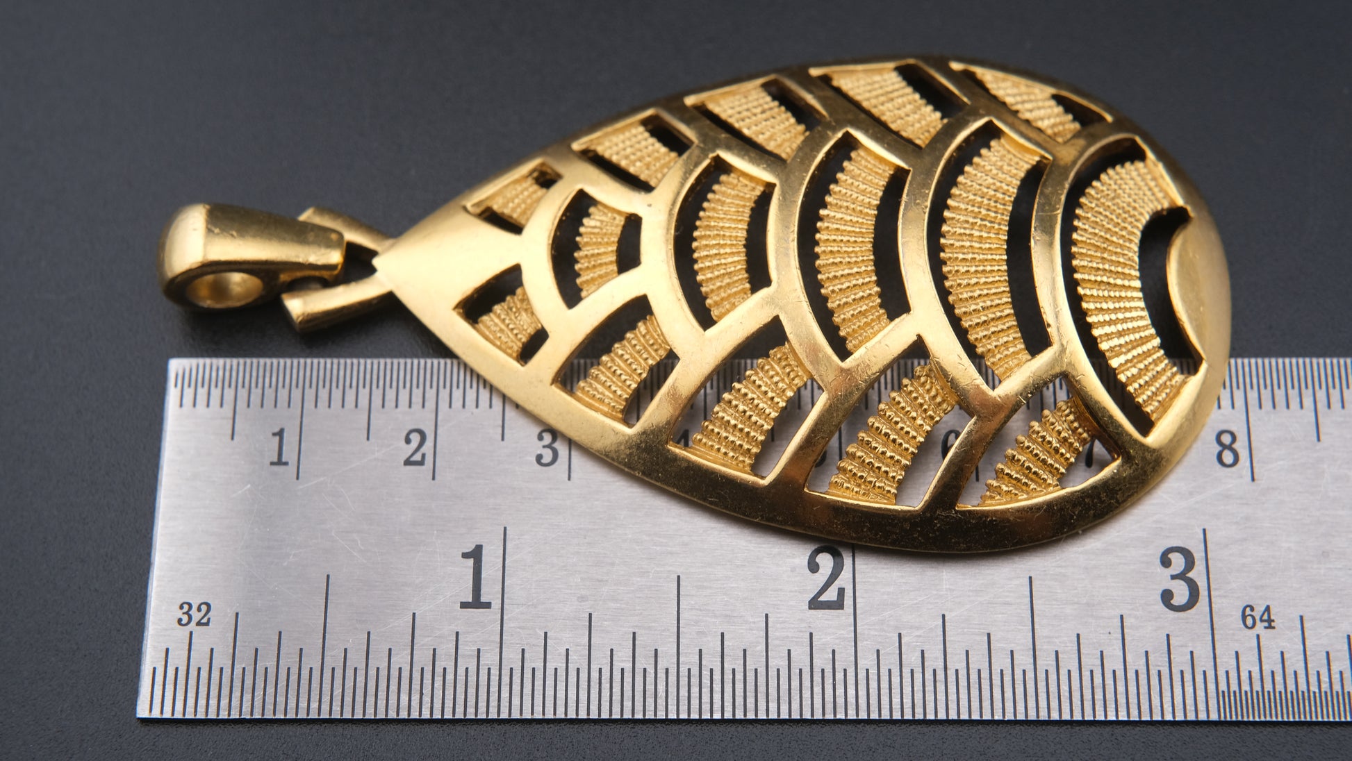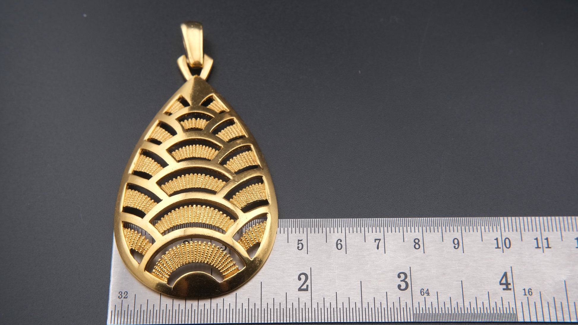 - Design: Teardrop pendant with stylized Chinese fan / leaf motif, openwork detail