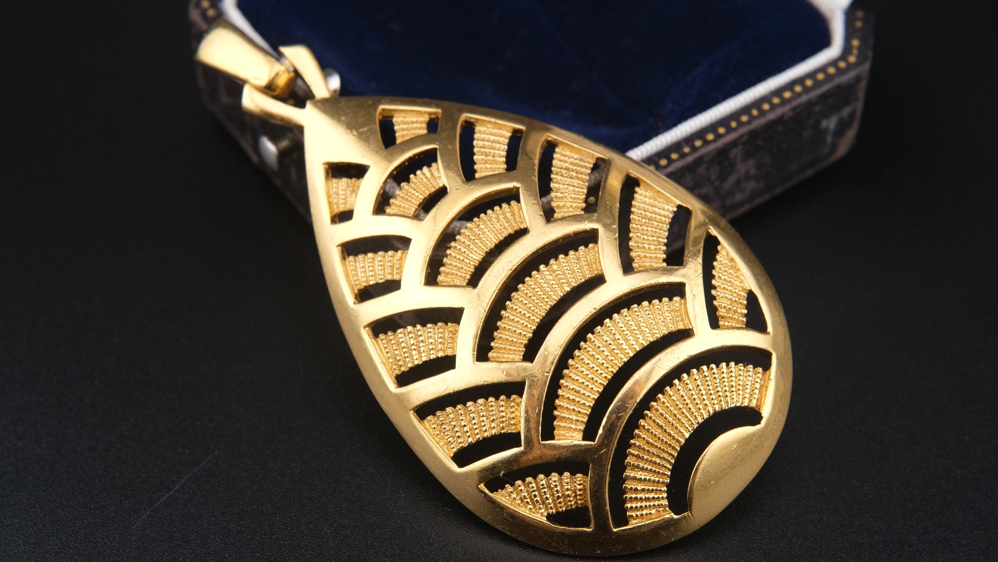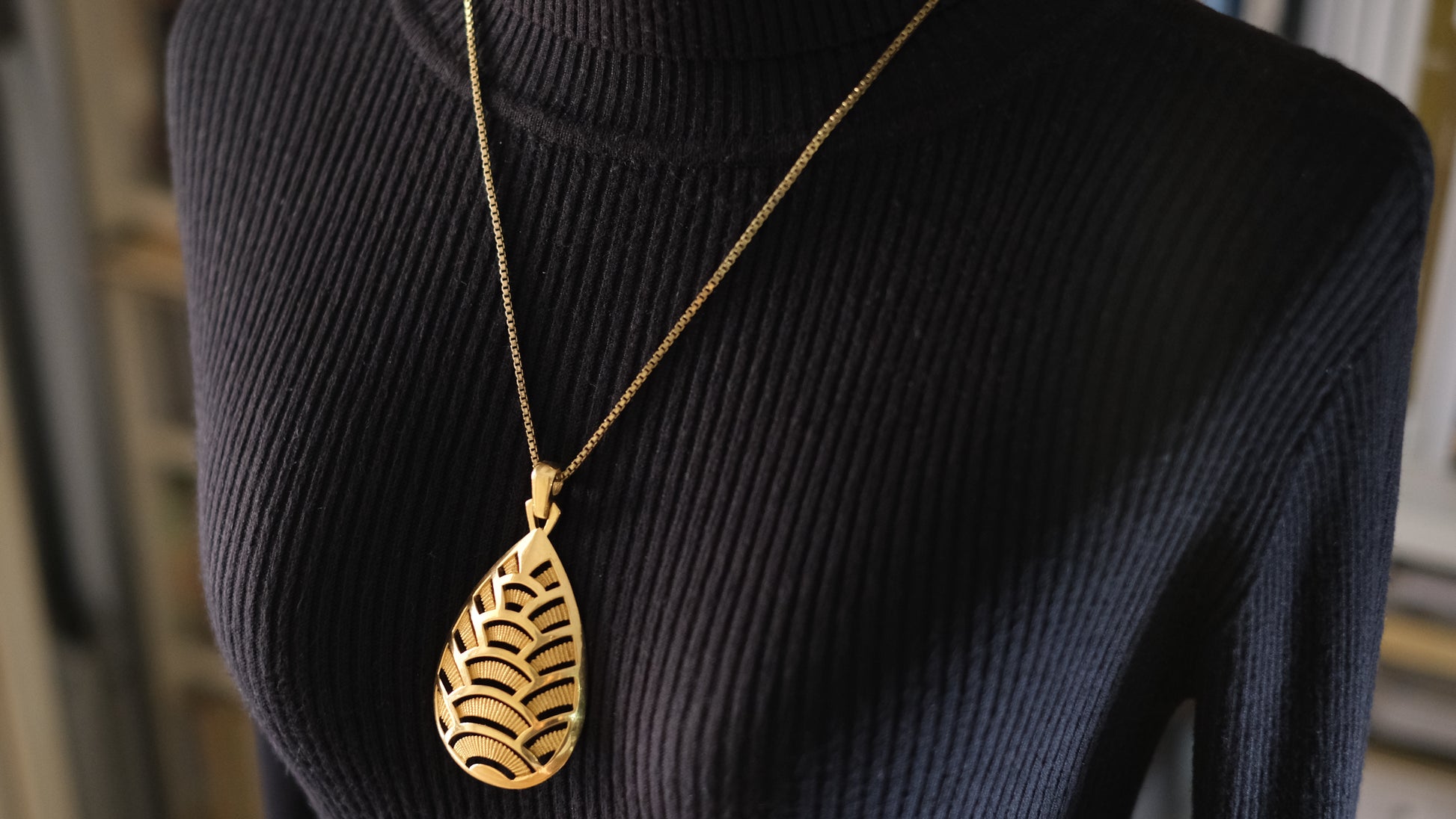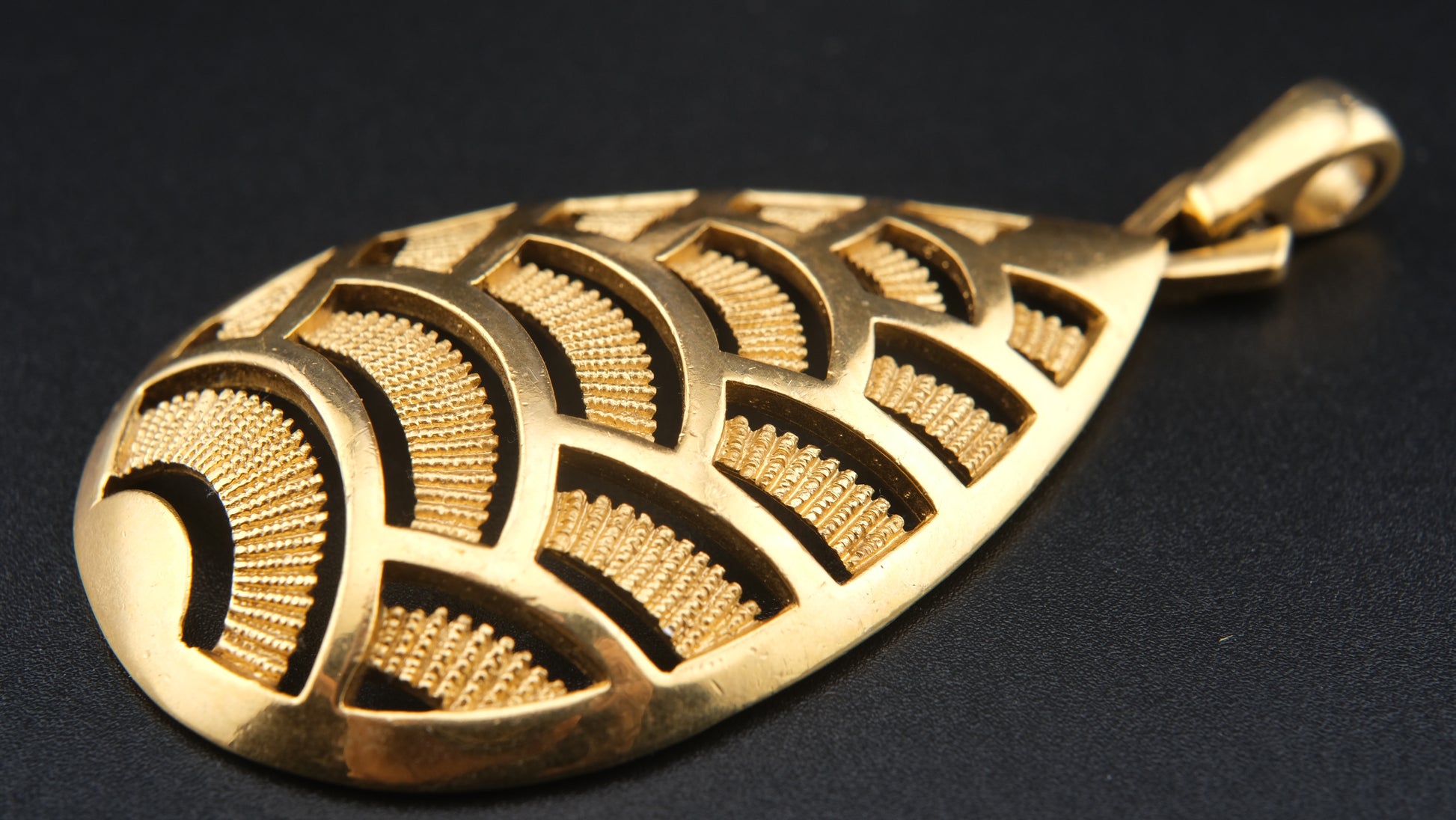 - Design: Teardrop pendant with stylized Chinese fan / leaf motif, openwork detail