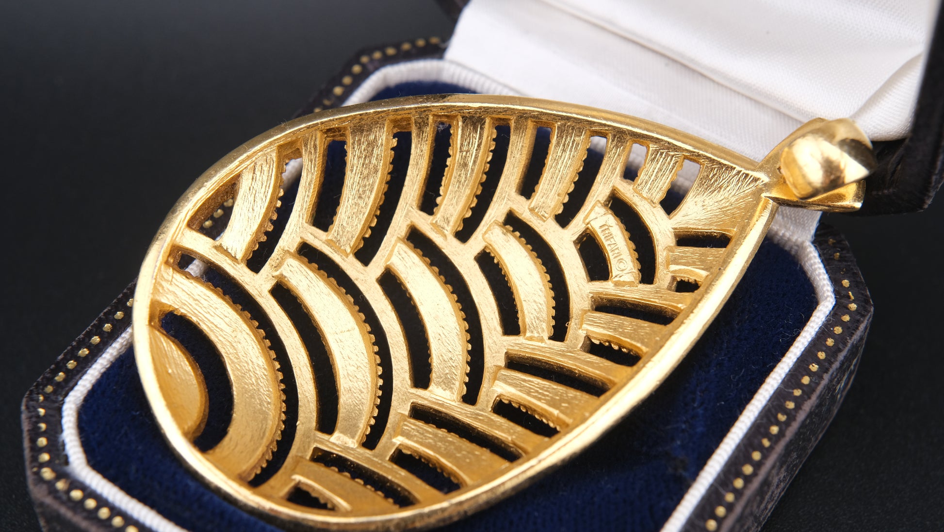Crafted in luminous gold-tone metal with geometric arcs and fine ridged detailing, this pendant is a striking example of Trifari's mid-century modernist style. It's bold enough to wear alone or pair with a fine chain or black cord for a sleek, versatile look.