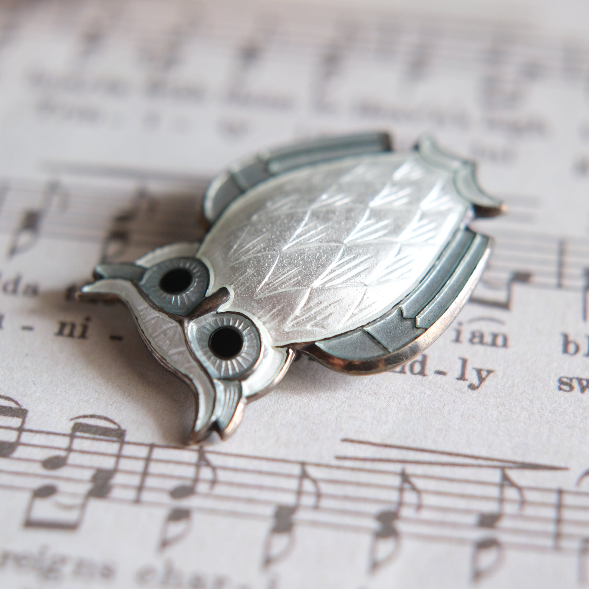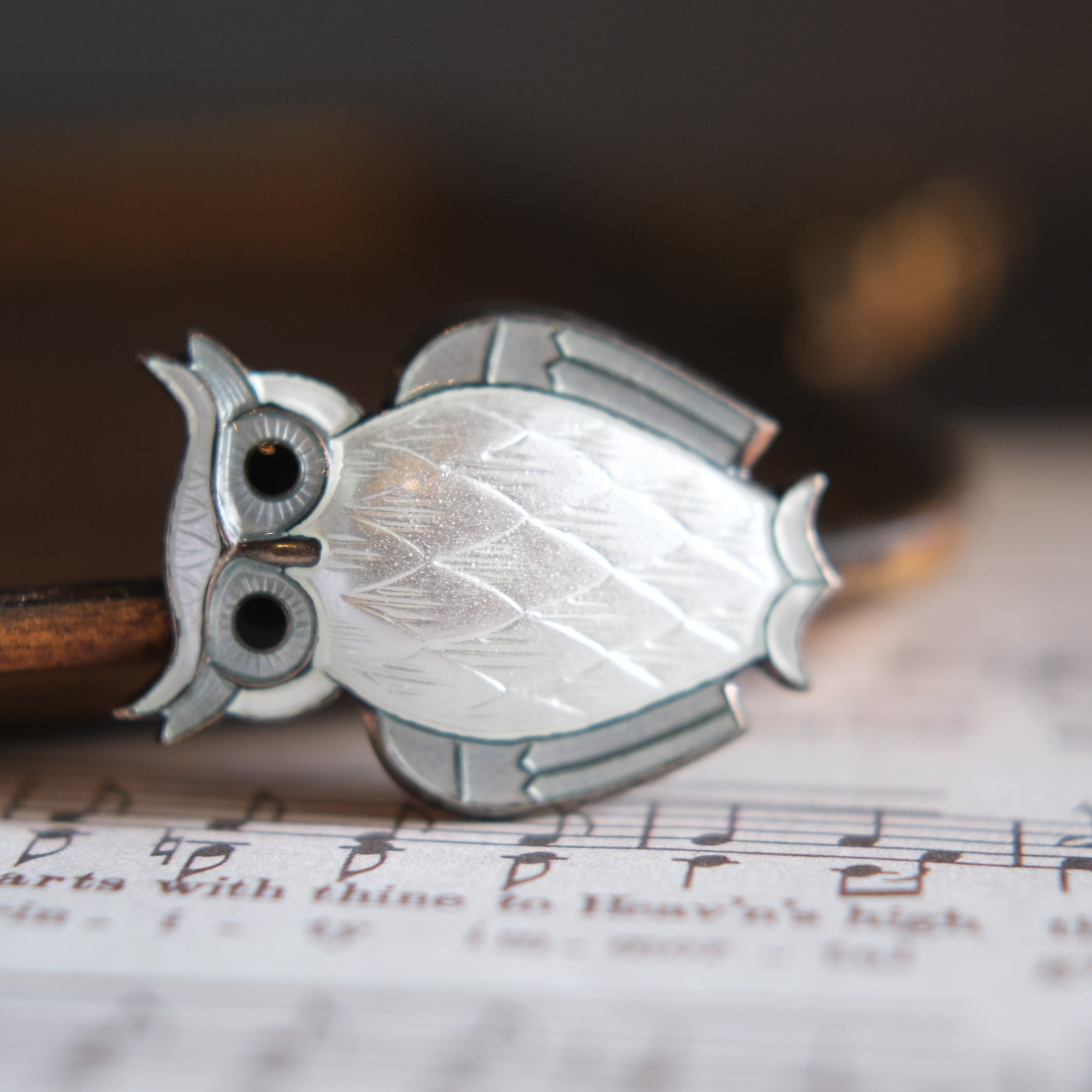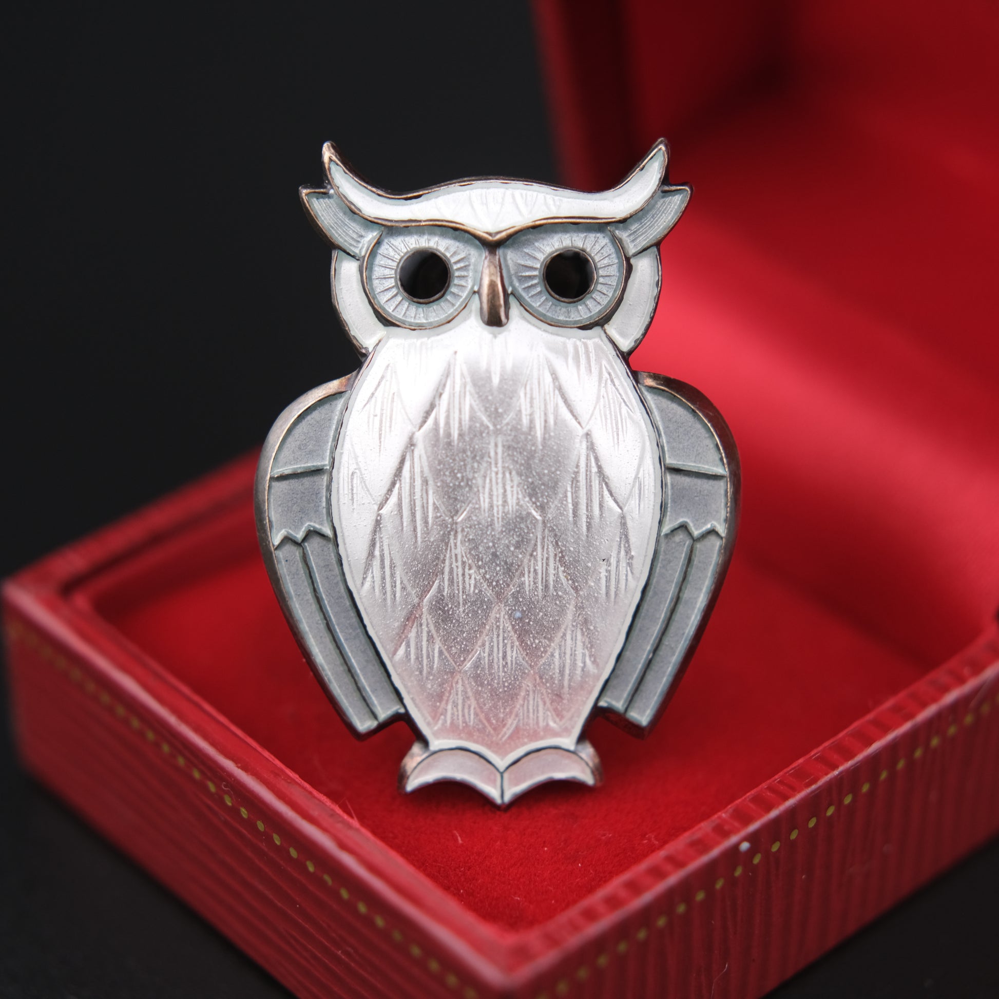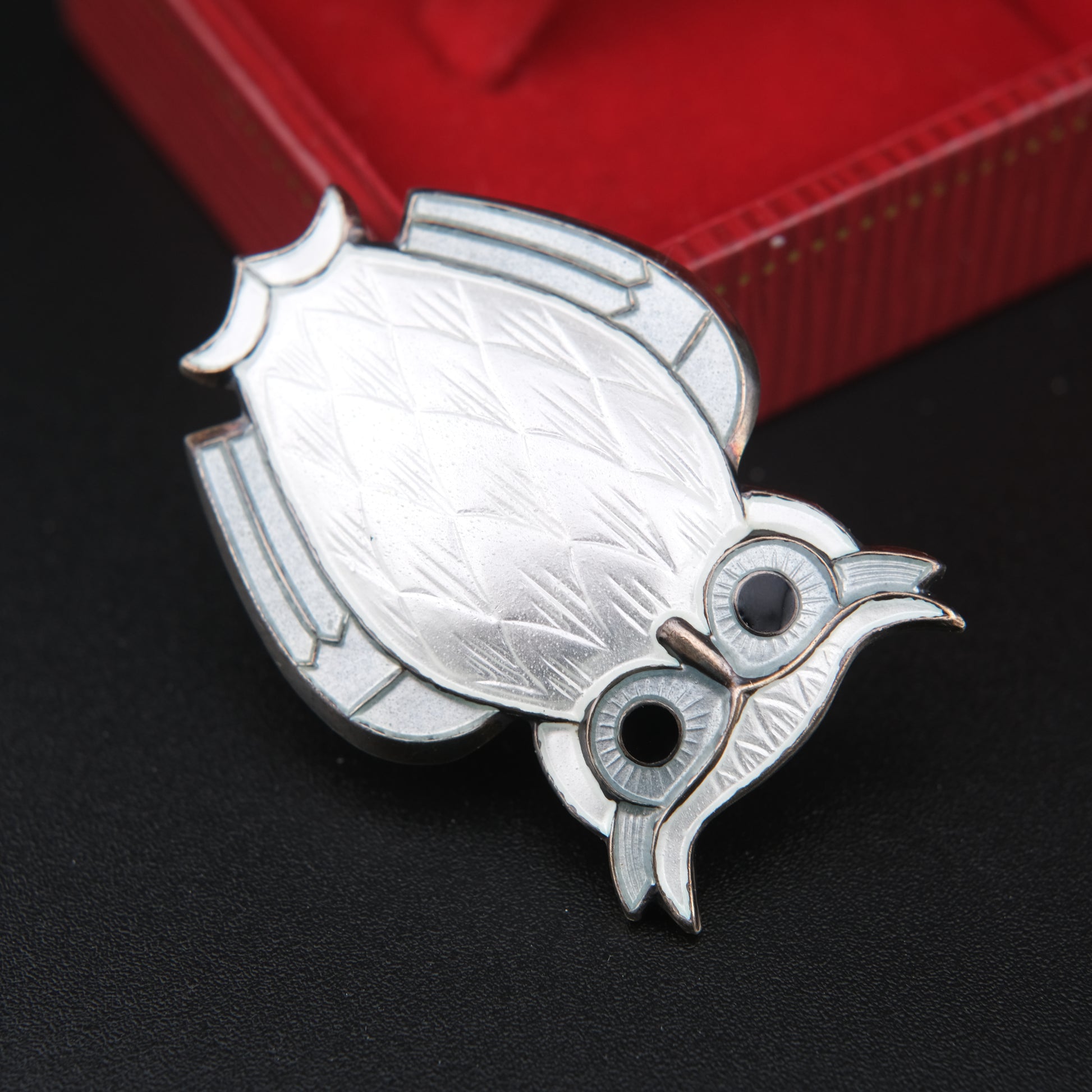 Vintage David-Andersen Norway Sterling Silver White Guilloché Enamel Owl Brooch