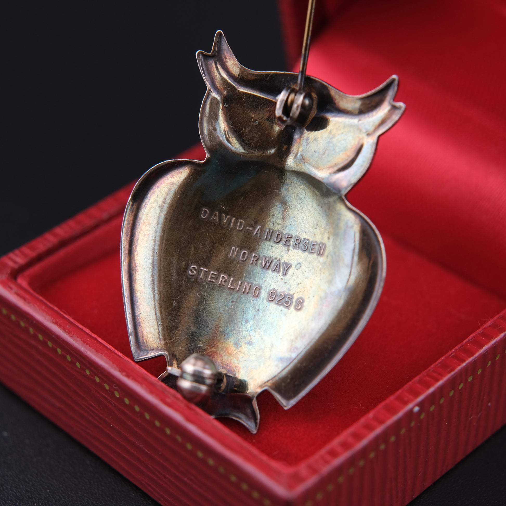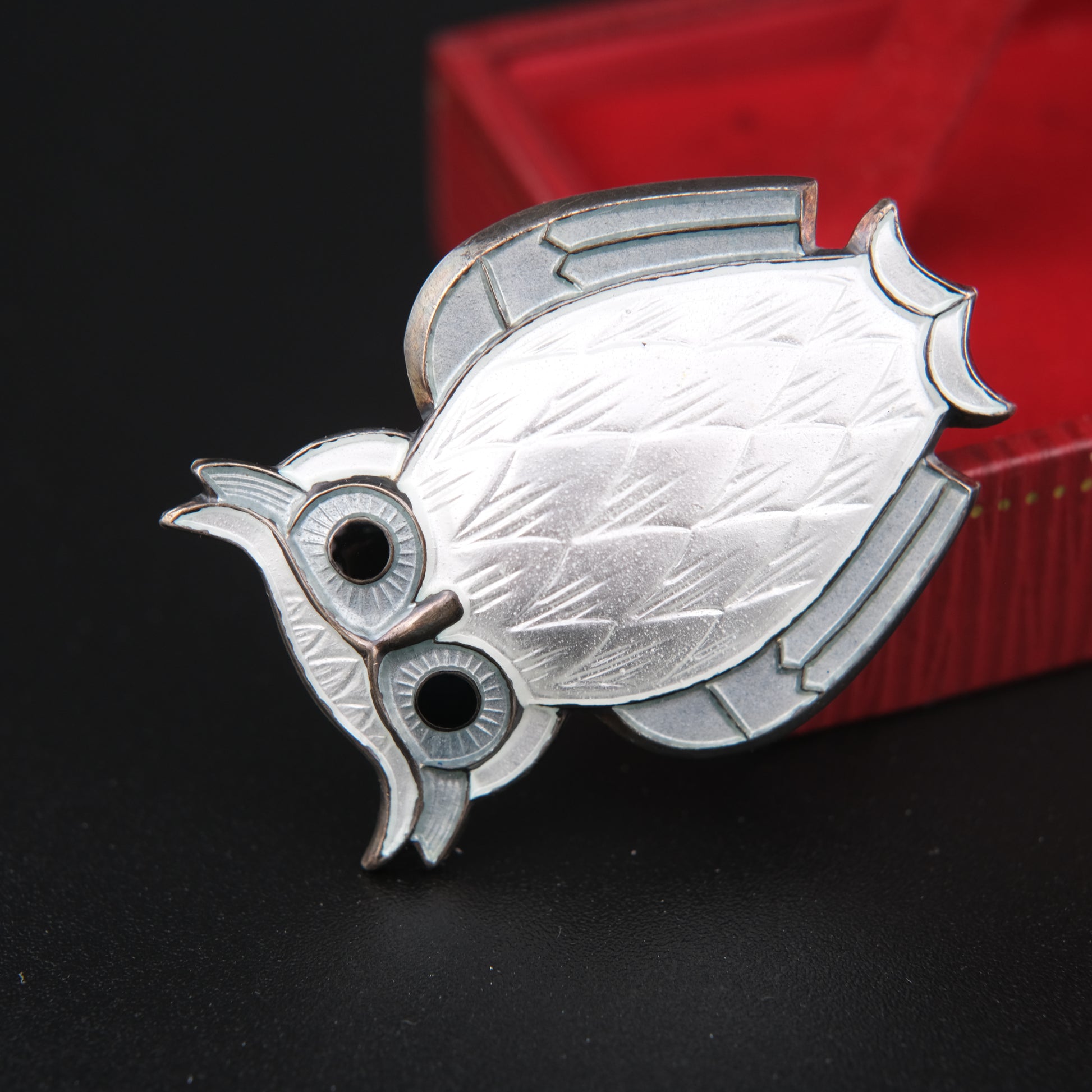 Add a whimsical touch of Scandinavian charm to your vintage collection with this stunning owl brooch by the iconic Norwegian silversmith David-Andersen. Expertly crafted from sterling silver (925S), this collectible piece features an intricately engraved owl with fine white guilloché enamel over its body and soft grey enamel accents on the wings and eyes. The sharp detailing of the feathers and stylized facial features evoke the mid-century Scandinavian design ethos—elegant, minimal, and full of character.