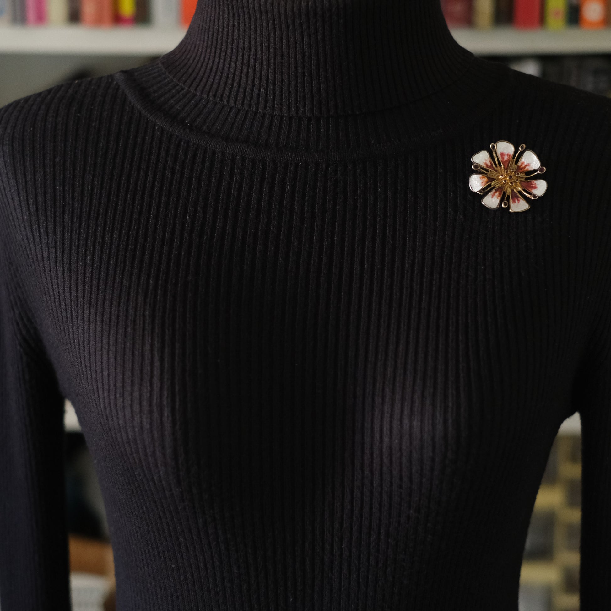 This elegant vintage Apple Blossom (Norwegian: Epleblomst) brooch / pendant was designed by Karl Jørgen Otteren for David Andersen in the 1960s. Crafted in sterling silver with finely executed kiln-fired enamel, the design features softly contoured white petals accented with painterly red tones and a warm golden center—an instantly recognizable hallmark of Otteren’s work.