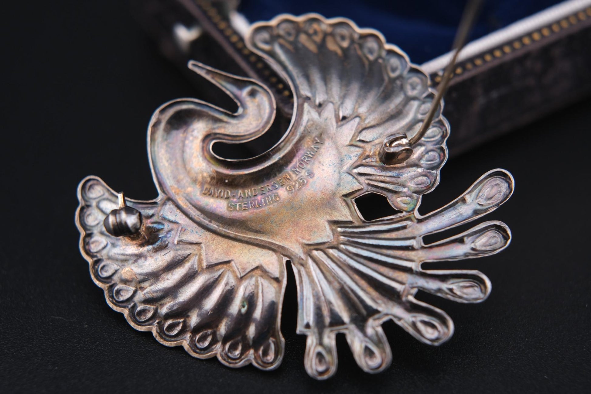A hallmark on the back reads “DAVID-ANDERSEN NORWAY STERLING 925S”, confirming its authenticity and high-quality materials. The brooch is equipped with a secure C-clasp closure, ensuring safe wear.