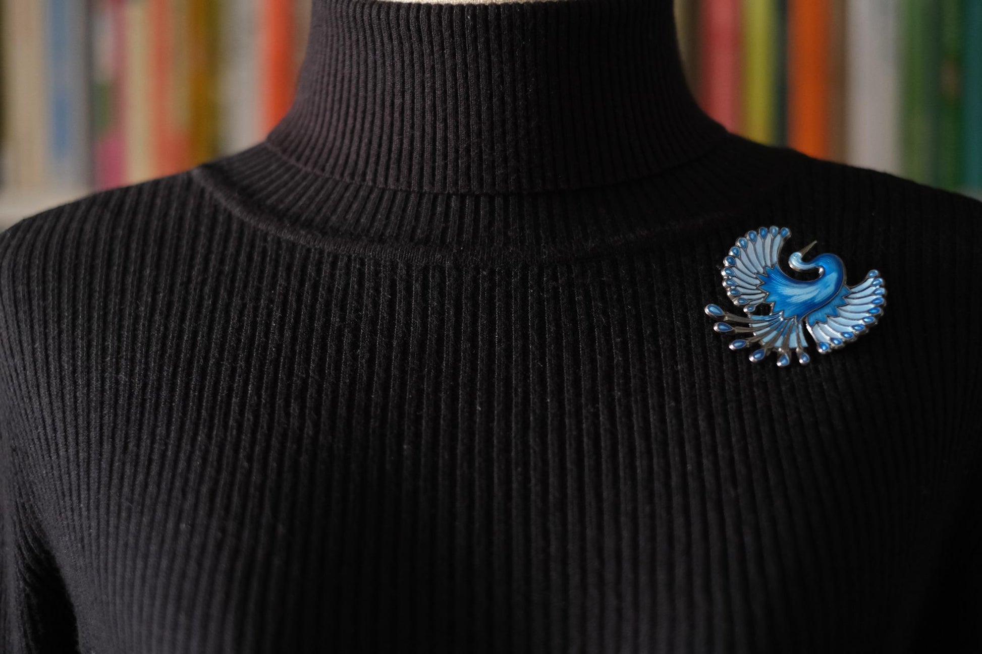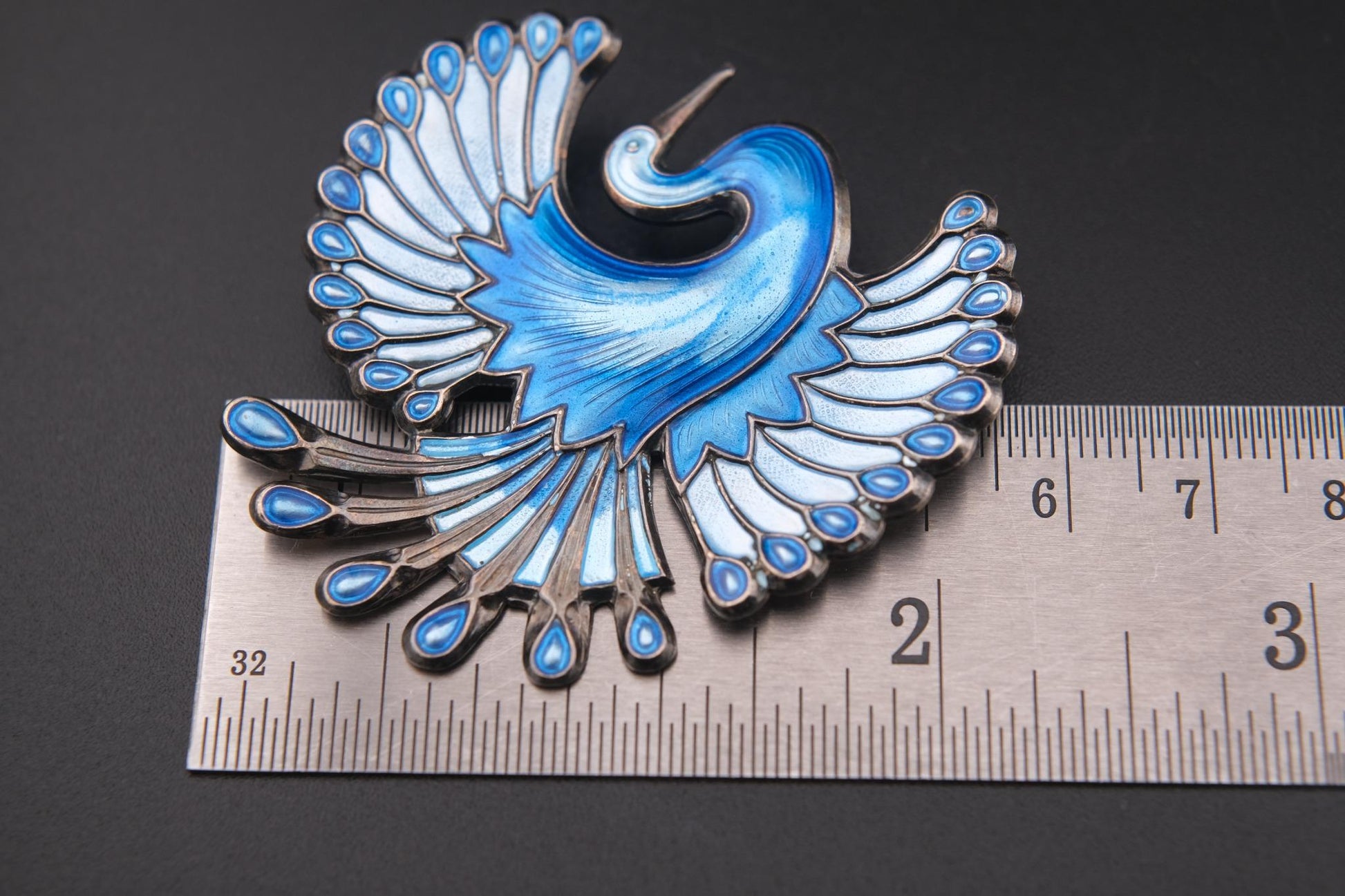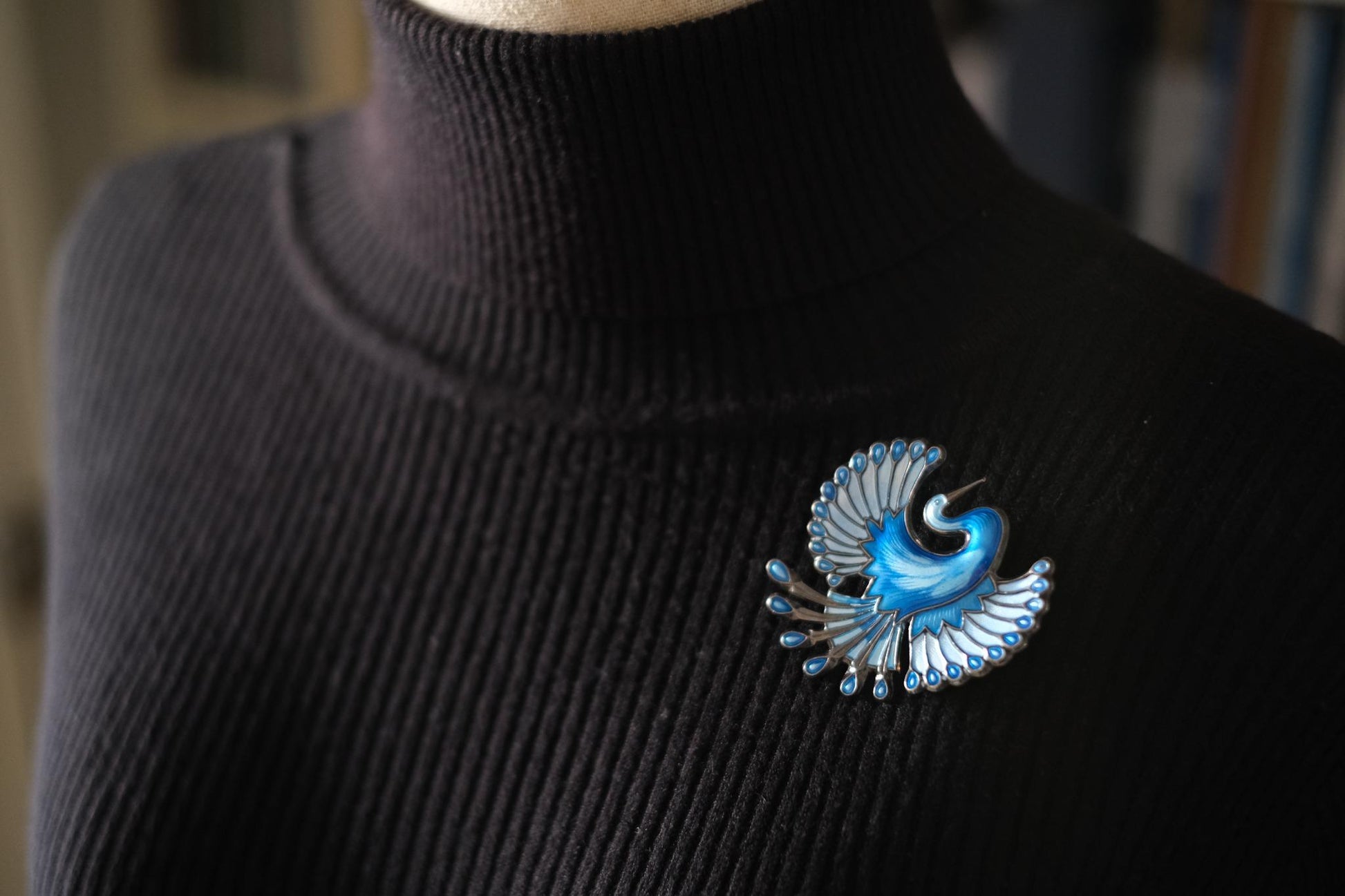This exquisite vintage brooch by renowned Norwegian silversmith David-Andersen showcases the brand’s exceptional craftsmanship in enamel jewelry. Featuring a striking bird in flight design, the brooch is crafted from sterling silver (925S) and adorned with vibrant blue guilloché enamel, creating a shimmering effect. The intricate detailing of the bird’s fanned tail and curved wings adds a sense of elegance and movement to the piece.