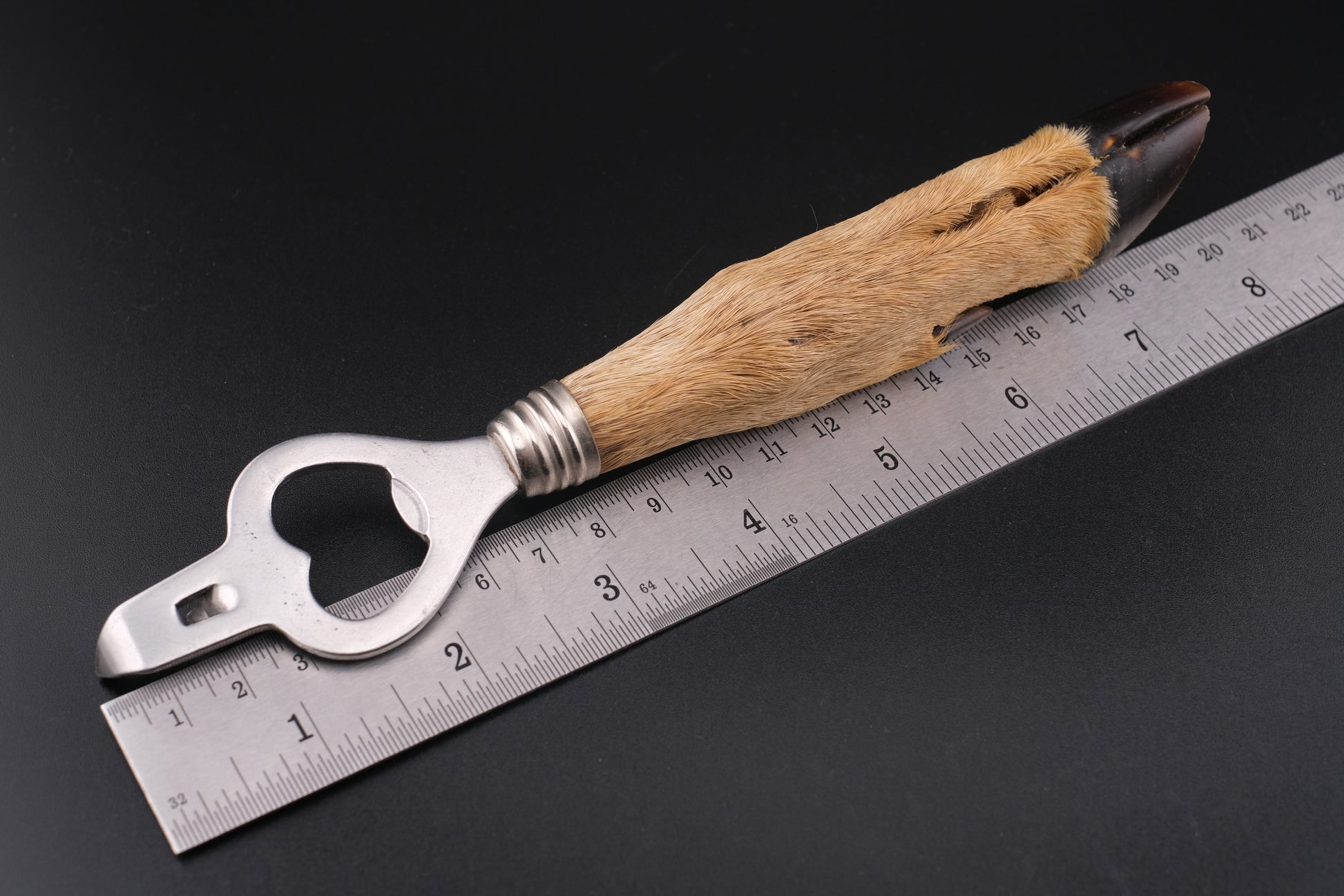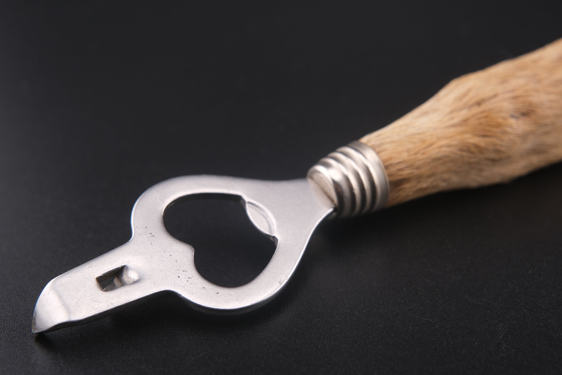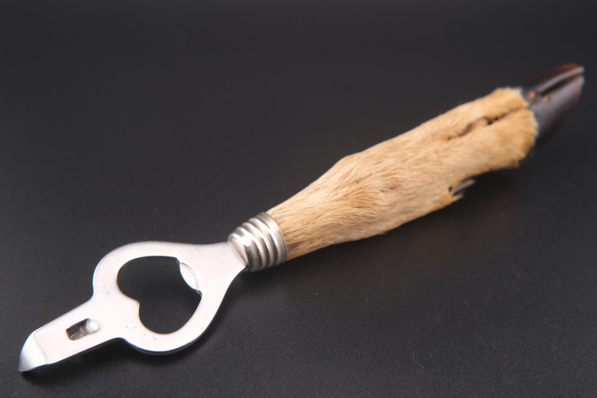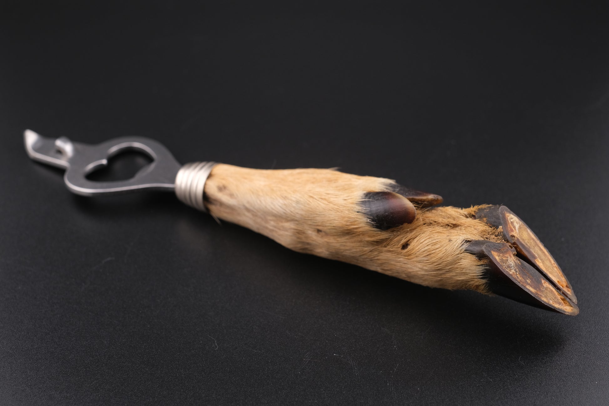 - Design: Bottle opener with genuine deer hoof handle and metal-wrapped collar